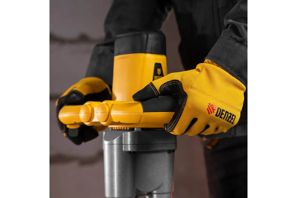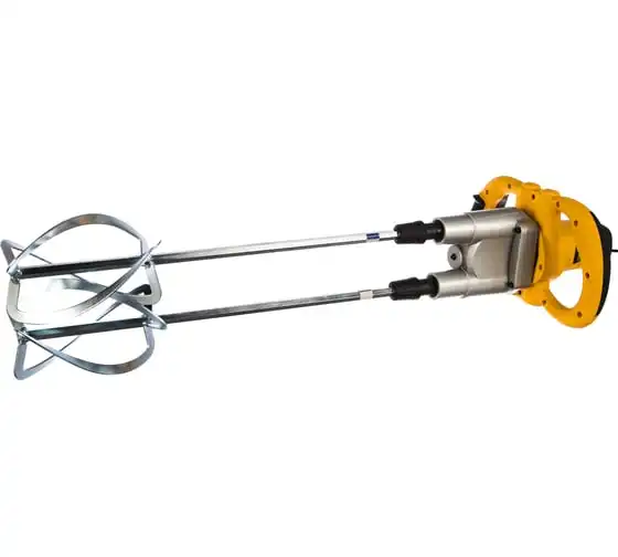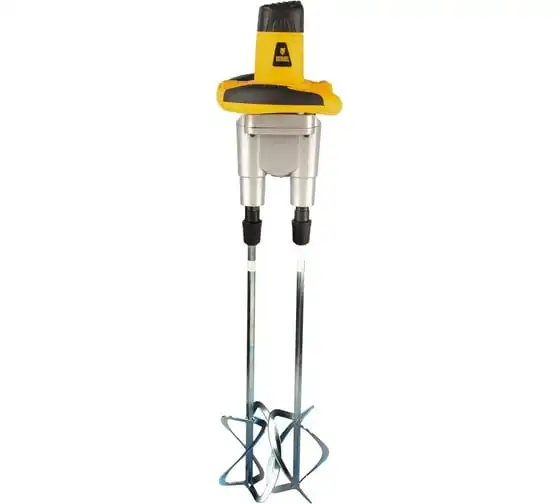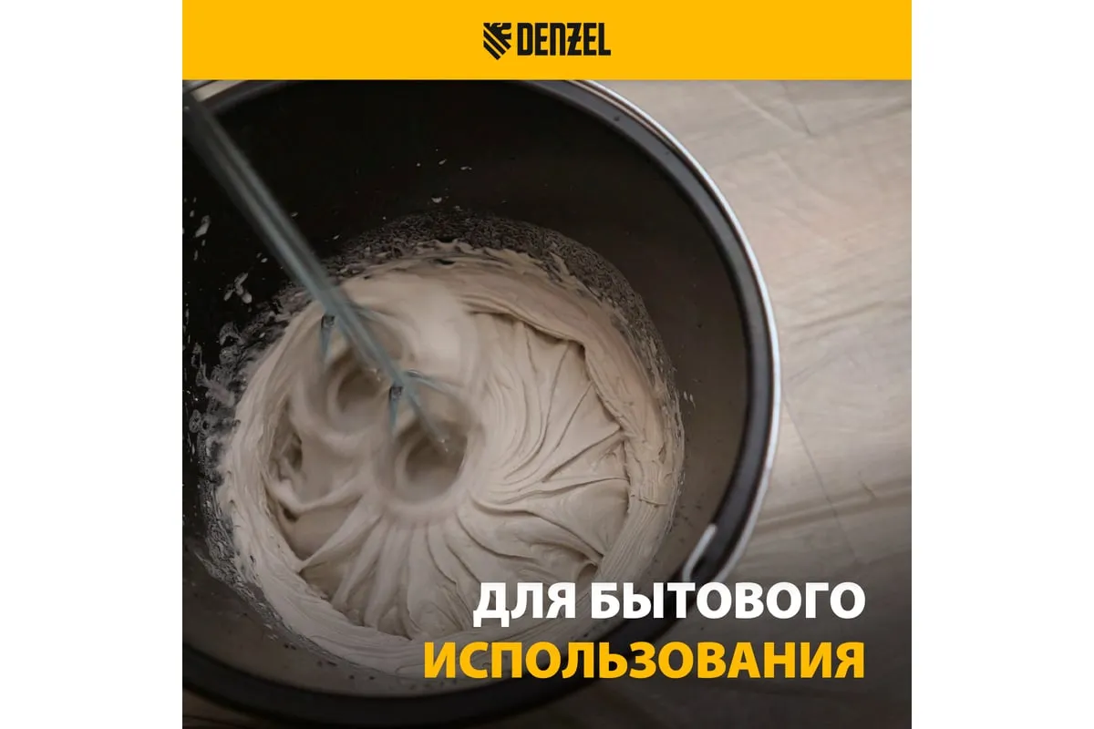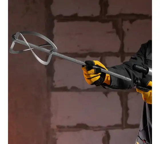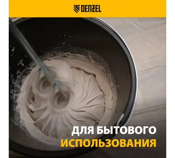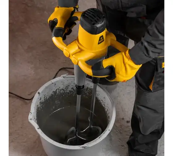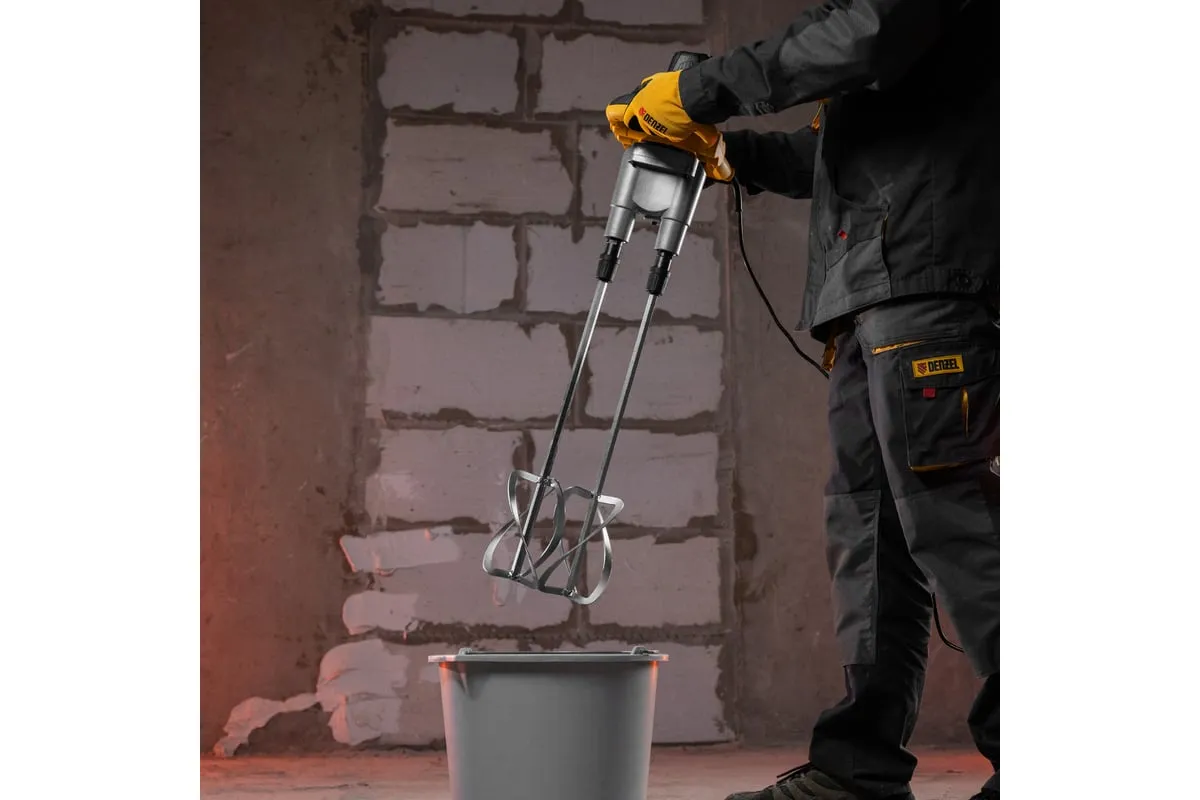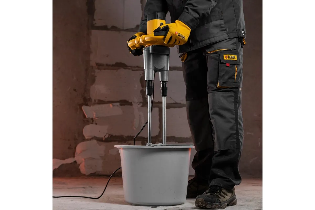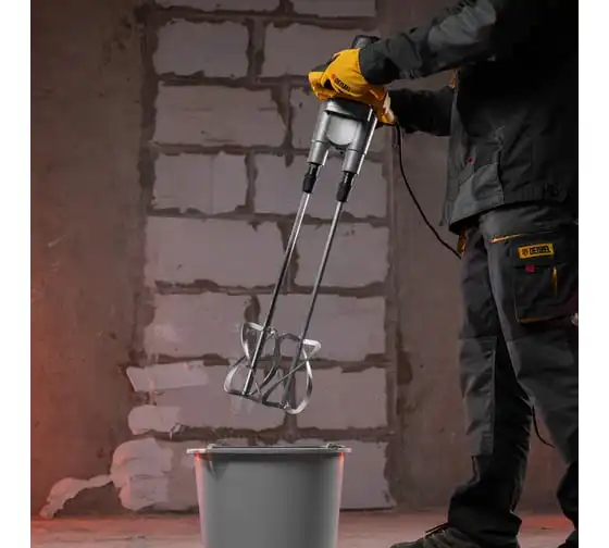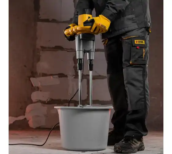 Строительный миксер DENZEL EM-2-1600 27911 используется во время строительных работ.