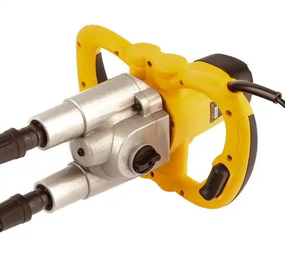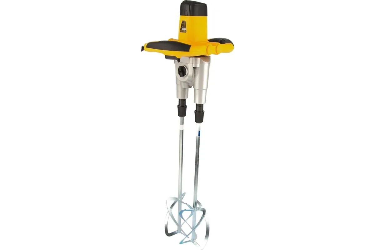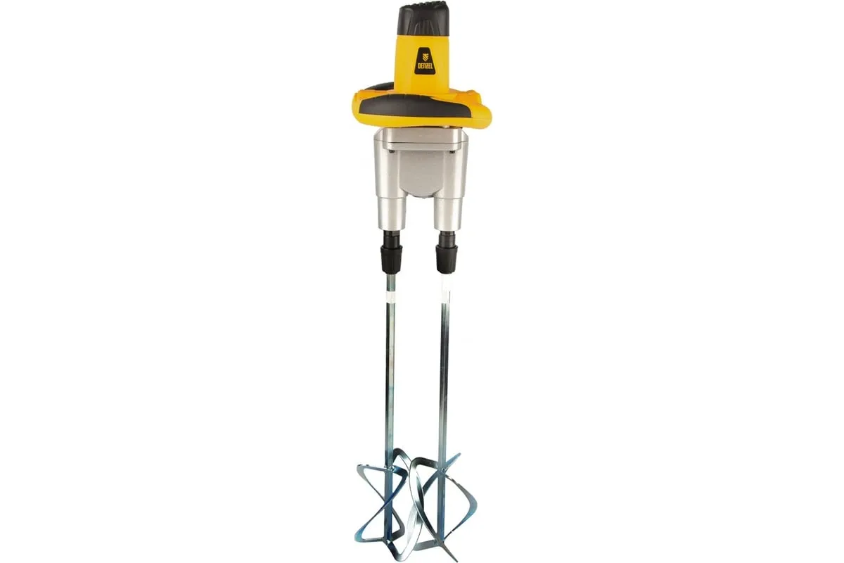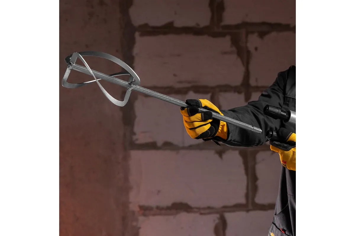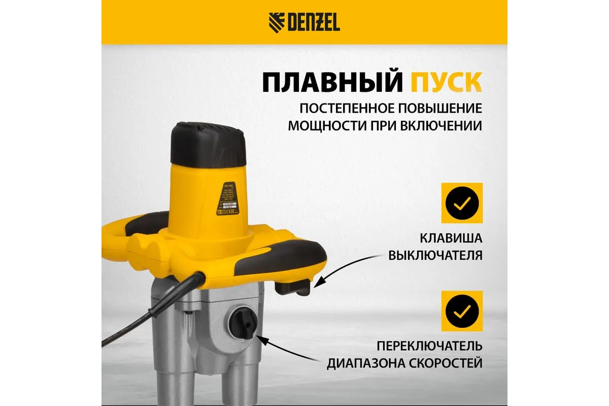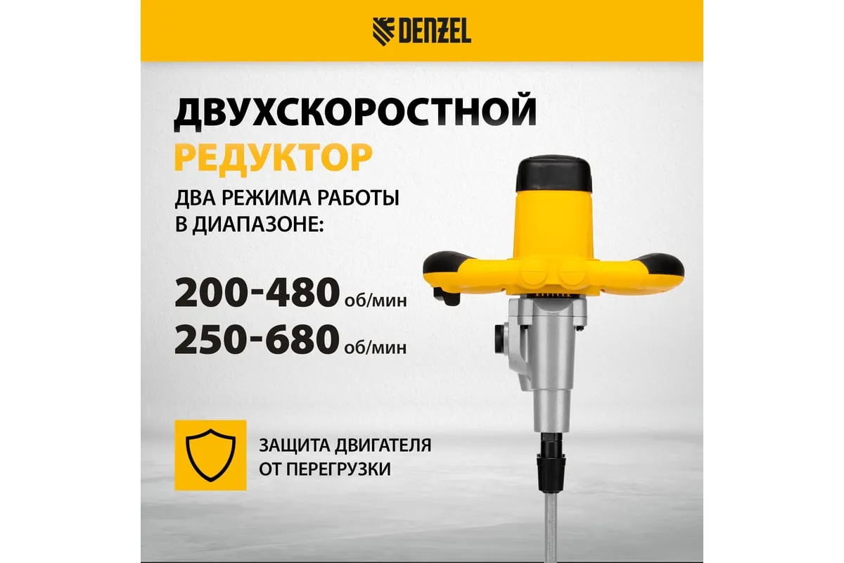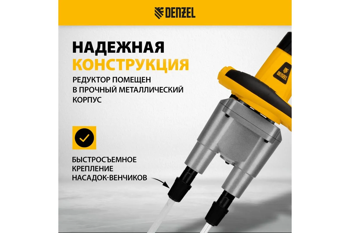 Строительный миксер DENZEL EM-2-1600 27911 используется во время строительных работ.