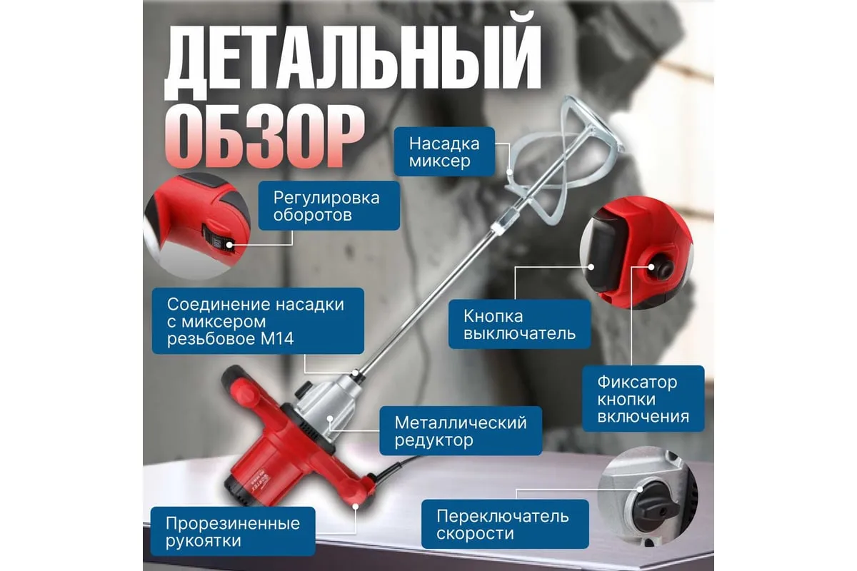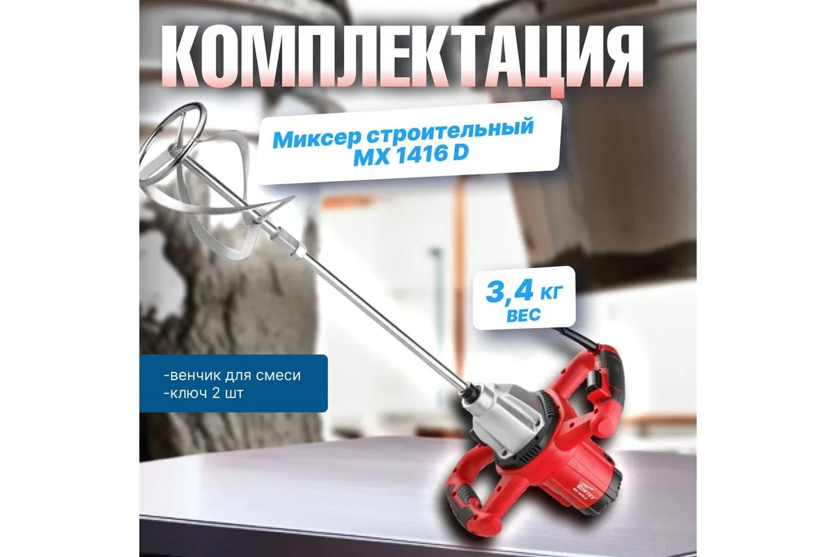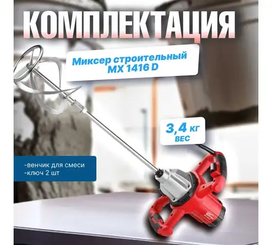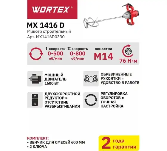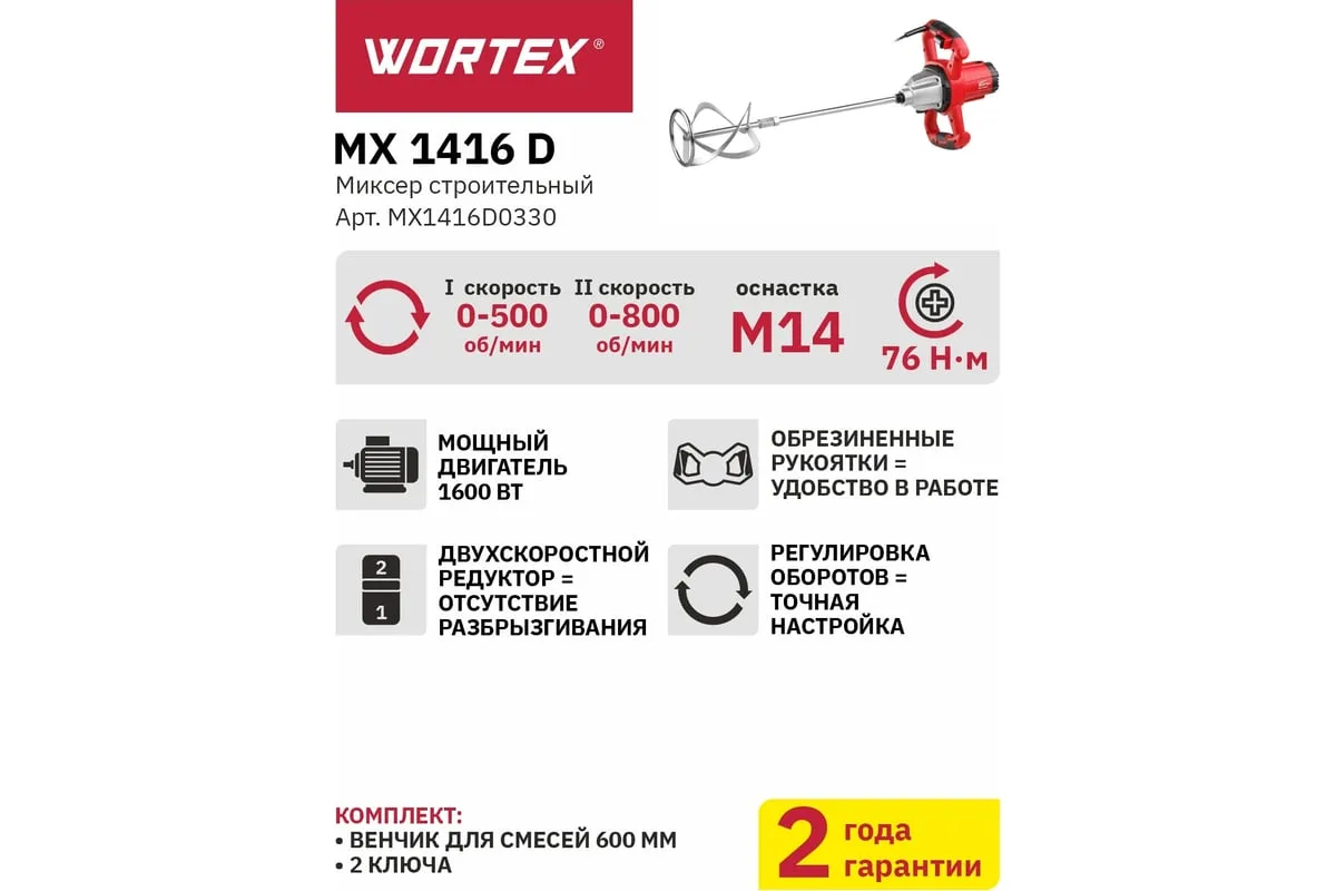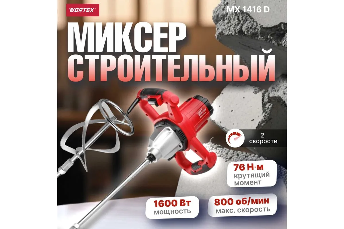 Строительный миксер WORTEX MX 1416 D MX1416D0330 – надежный инструмент подходящий для размешивания красок, лаков, клеев, строительных растворов.