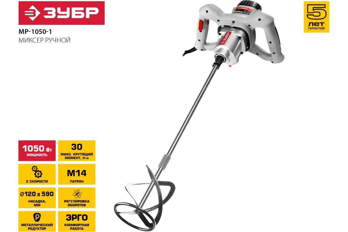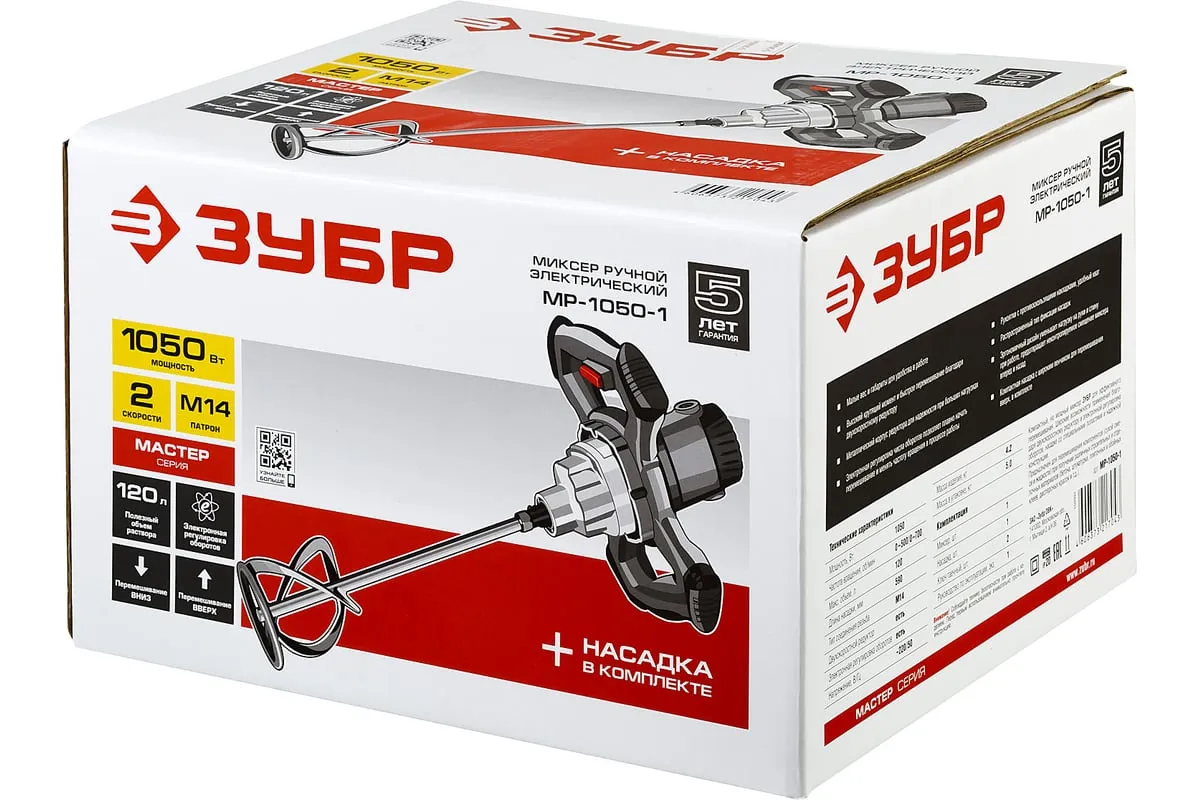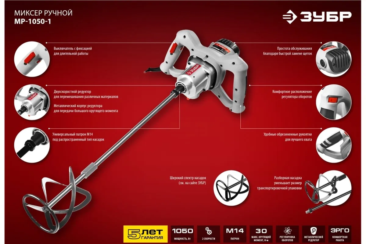 Строительный миксер Зубр МР-1050-1 предназначен для размешивания красок, лаков, клеев, строительных растворов и смесей. Две рабочих скорости и электронная регулировка оборотов способствуют оптимальной настройке инструмента под конкретные рабочие нужды. Для быстрого доступа к угольным щеткам предусмотрена сервисная крышка.