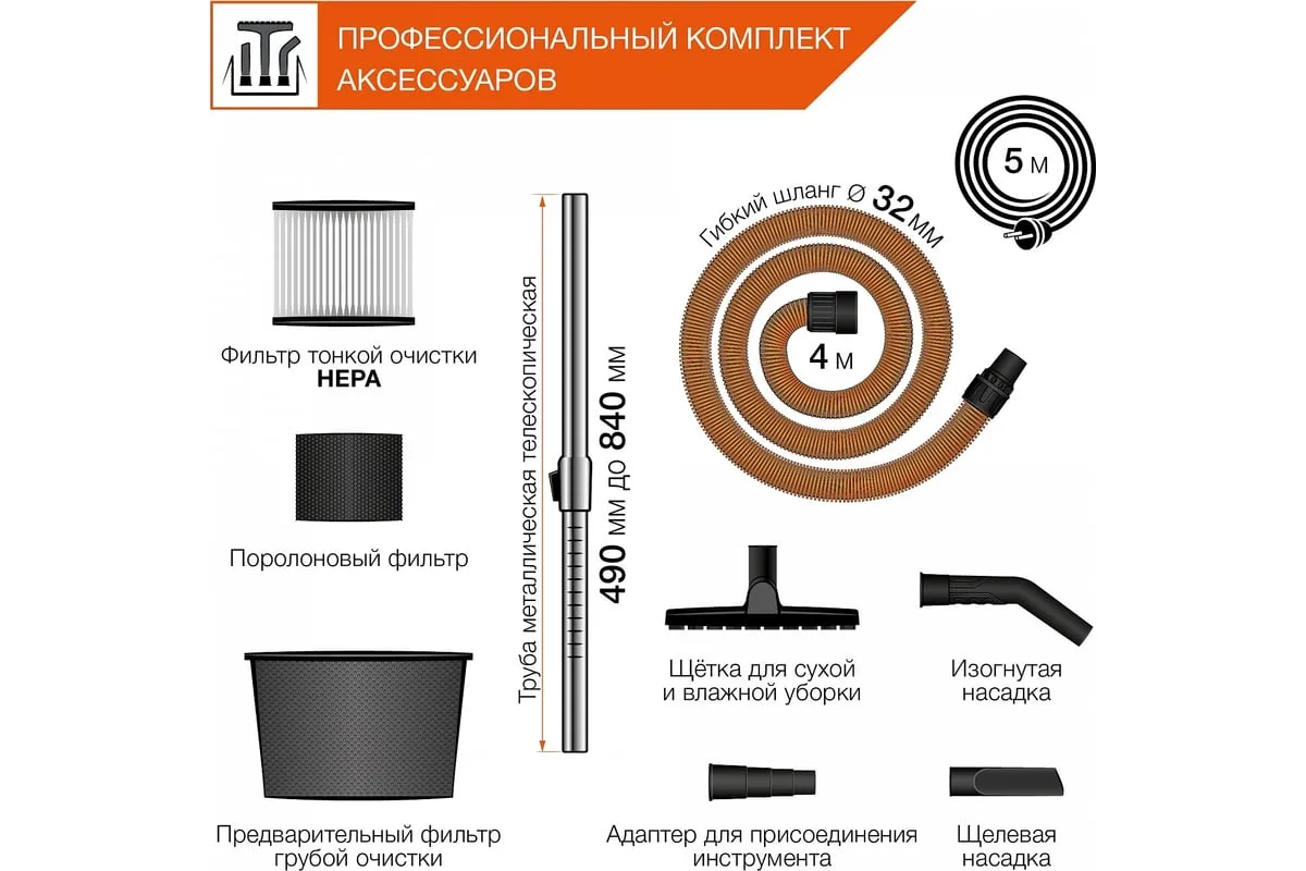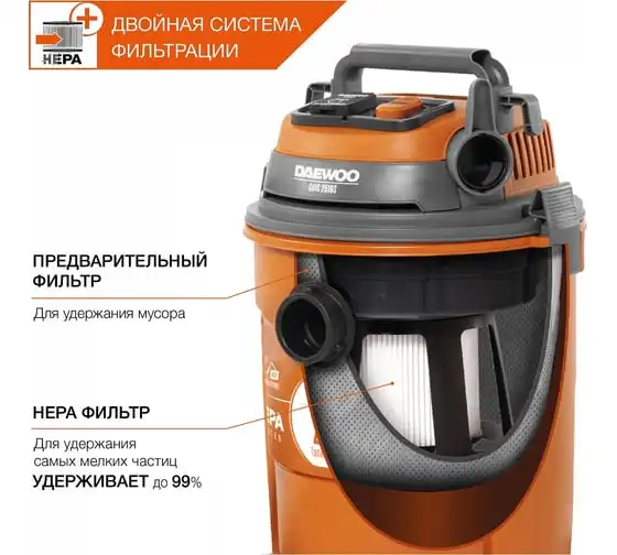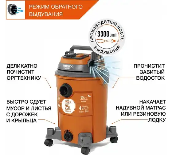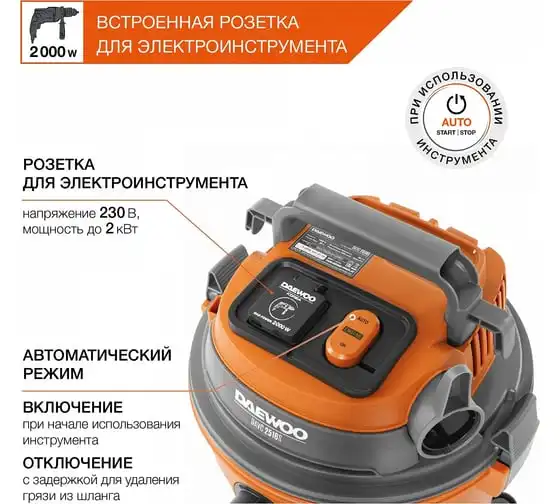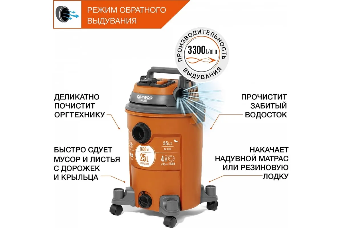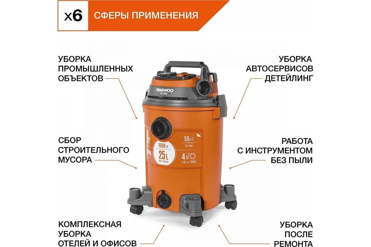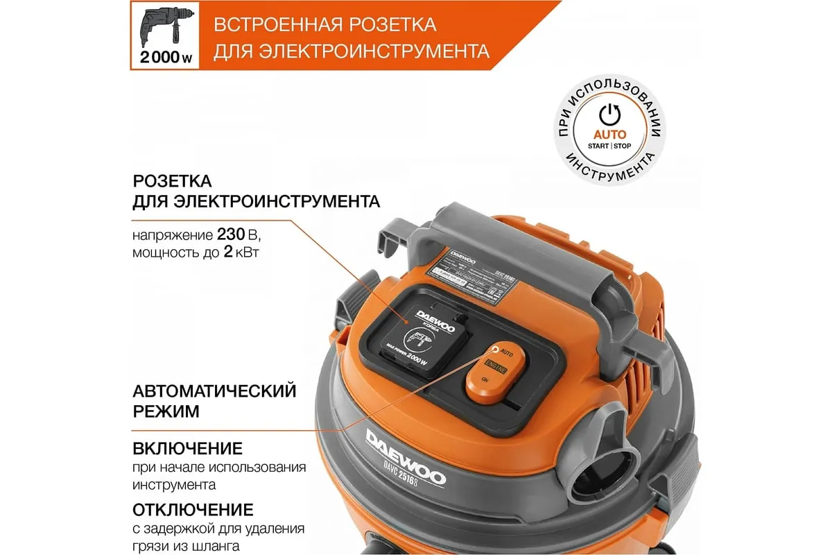 Строительный пылесос с шлангом DAEWOO 4 м DAVC 2516S предназначен для очистки помещений во время строительных работ.