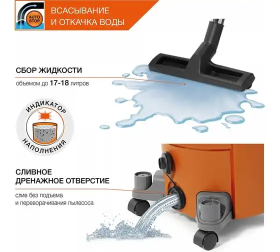 Наличие сливного отверстия позволяет удалить жидкость не переворачивая наполненный пылесос.