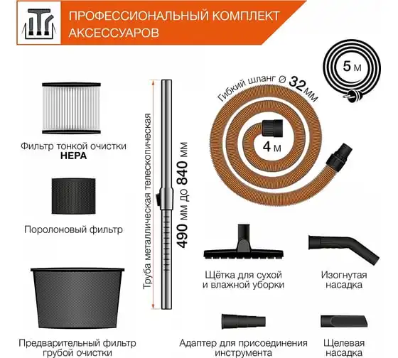 Шланг длиной 4 метра и телескопическая стальная штанга позволяют собирать мусор в труднодоступных местах.