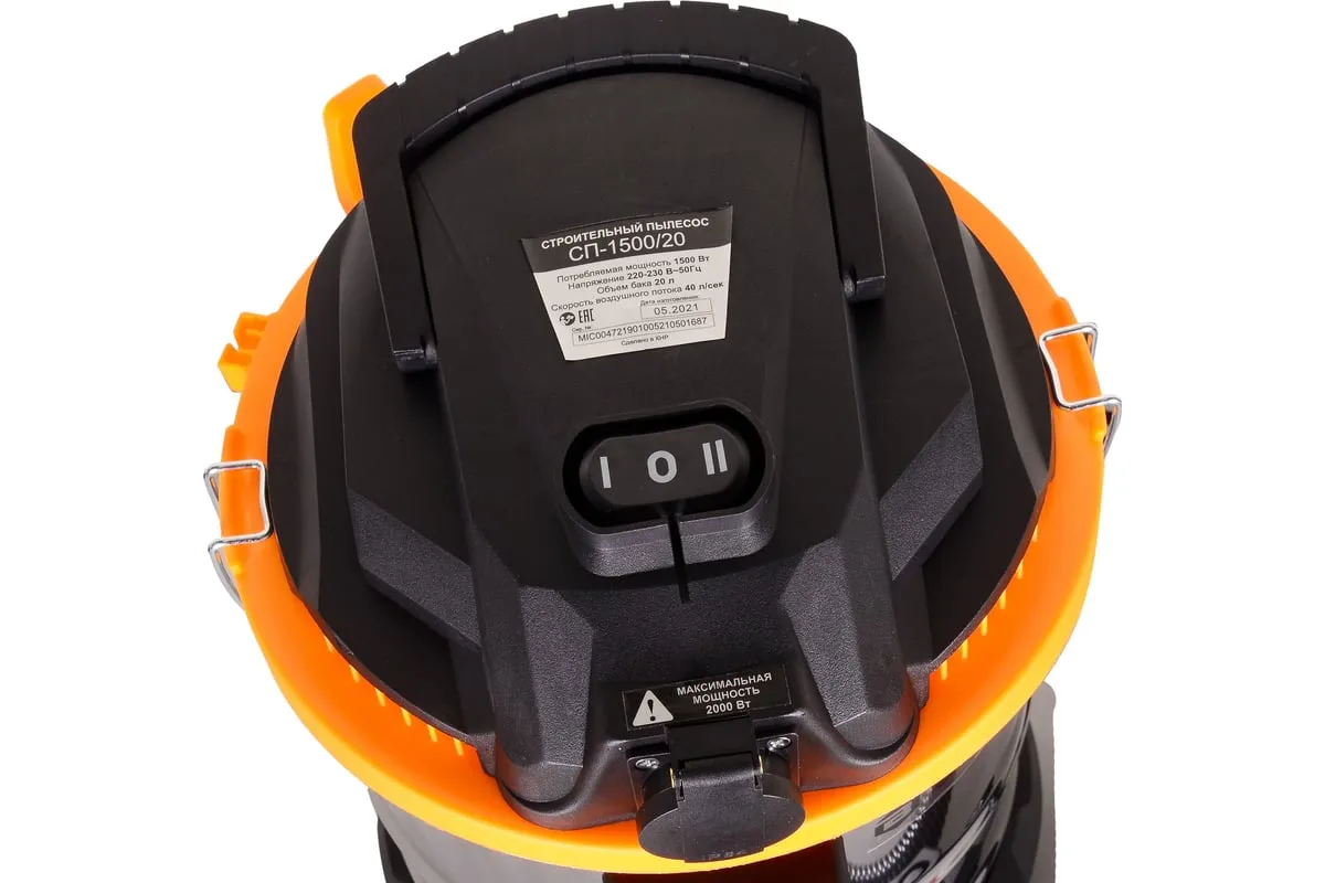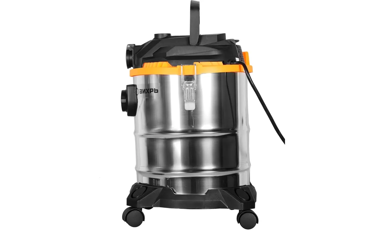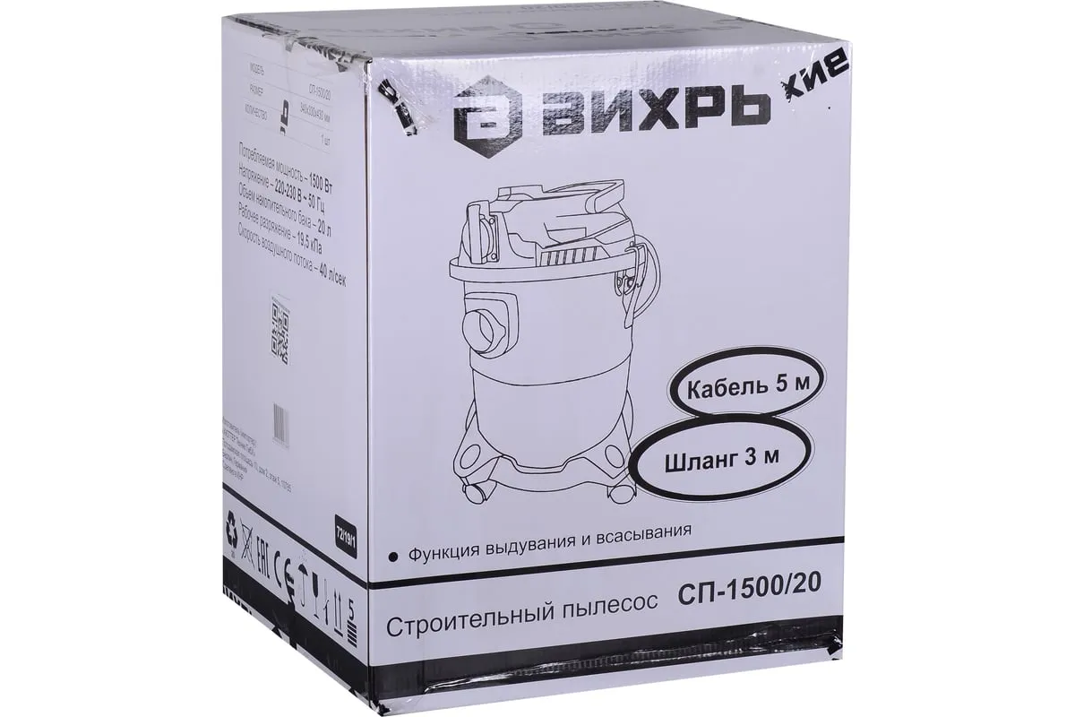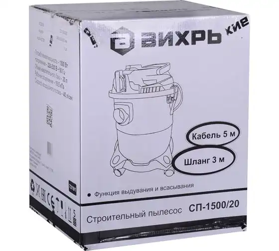 Мощность электродвигателя модели СП-1500/20 Вихрь составляет 1.5 кВт. Он обеспечивает уровень разряжения в пределах 19.5кПа при скорости потока воздуха потока 40л/сек. Строительный пылесос укомплектован гофрированным шлангом длиной 3м для стыковки агрегата к электроинструменту, сетевым кабелем – 5м и колёсами, обеспечивающими хорошую мобильность и высокий уровень устойчивости. Питание осуществляется от сети 220В, 50Гц.