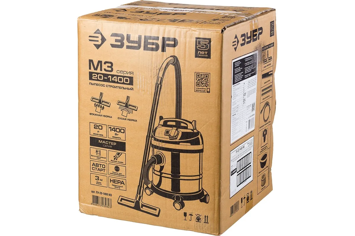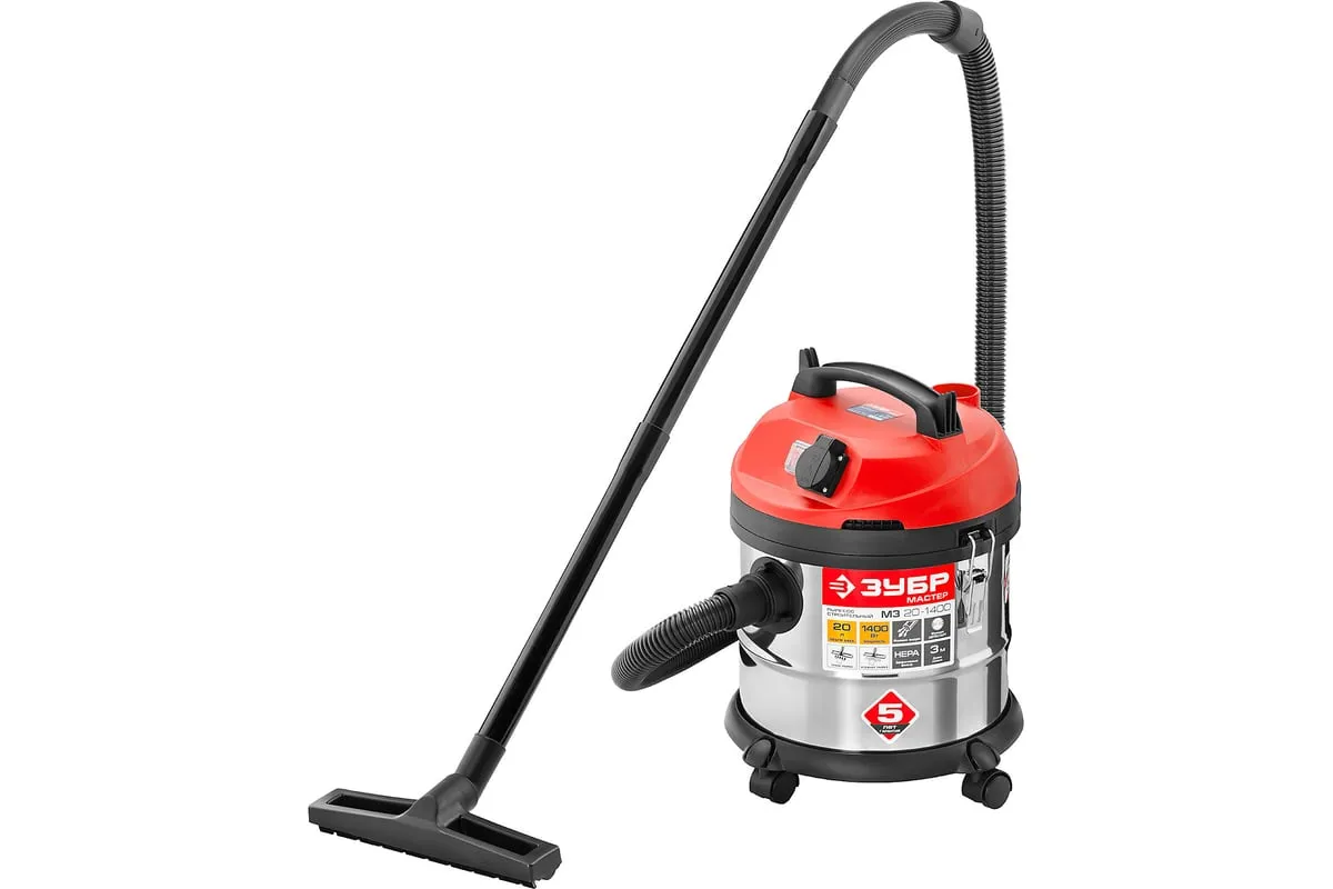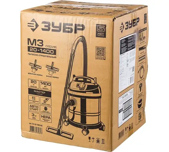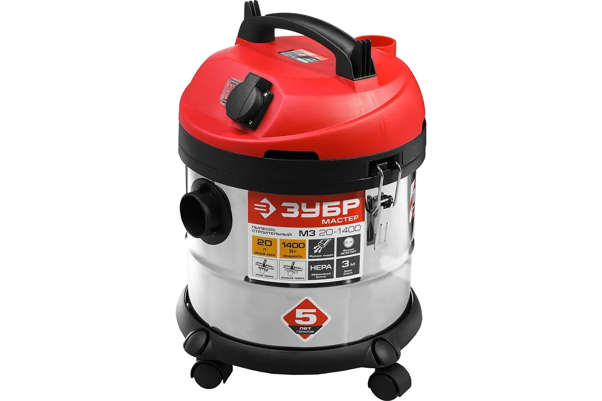 Строительный пылесос ЗУБР МАСТЕР М3-20 ПУ-20-1400 М3 используется для уборки производственных помещений и строительных площадок. Мощный двигатель 1400 Вт обеспечивает отличную производительность и большую силу всасывания. Благодаря наличию встроенной розетки к пылесосу можно подключать электроинструмент мощностью 100-2000 Вт. Корпус бака сделан из нержавеющей стали, что гарантирует долгий срок службы и устойчивость к коррозии.