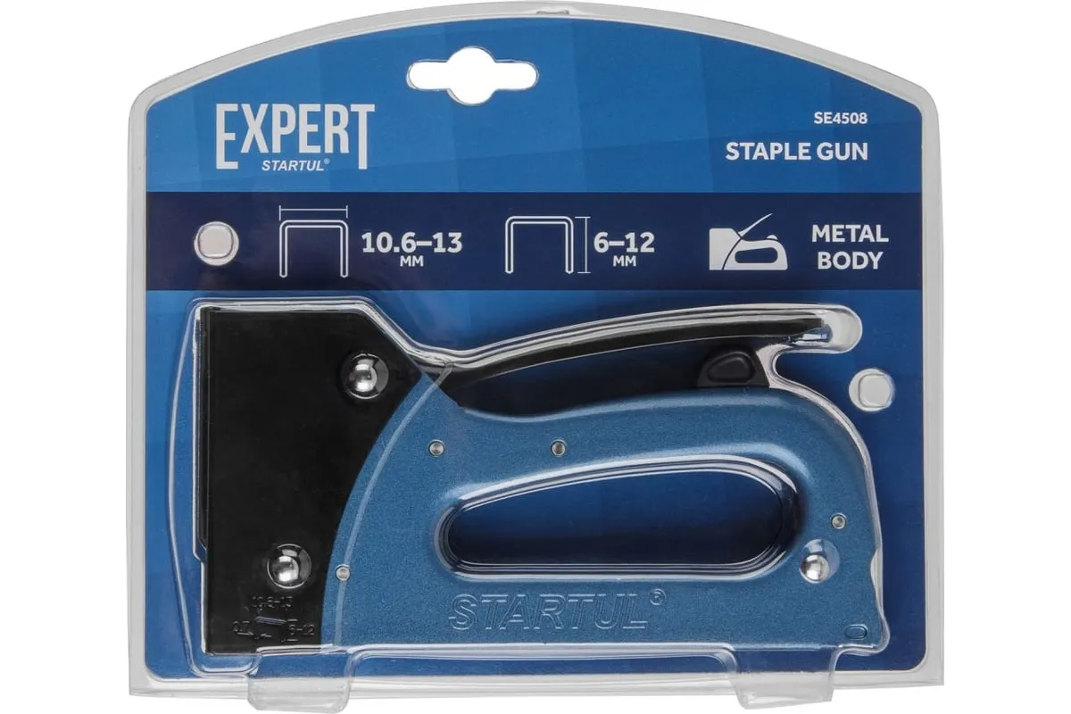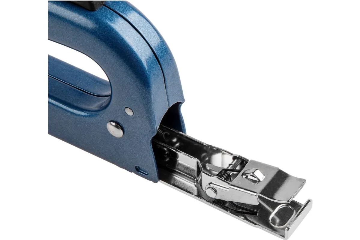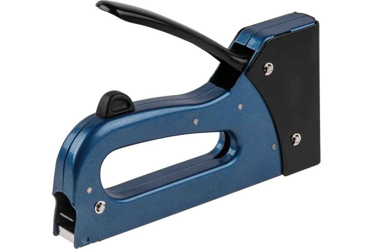 Строительный степлер используется для моментального крепления всевозможных материалов к дереву, древесноволокнистой поверхности, пластику, гипсокартону и т.д. Имеет прочную металлическую конструкцию с запатентованной системой блокировки ручки без фиксаторов. Степлер используется со всеми видами скоб шириной 10,6-13 мм (тип 53, тип 140 и т.д.). Тип ударного механизма: пластинчатая пружина.