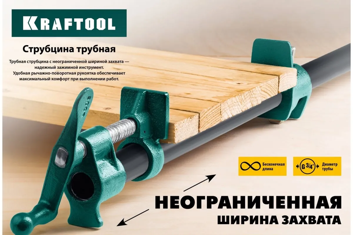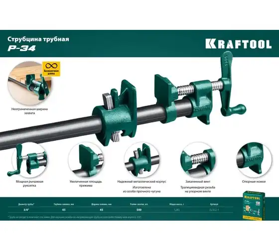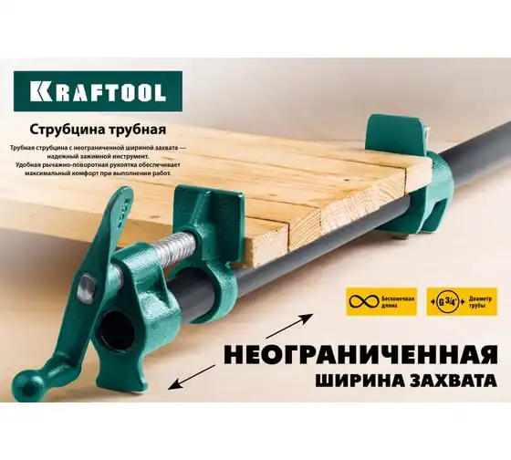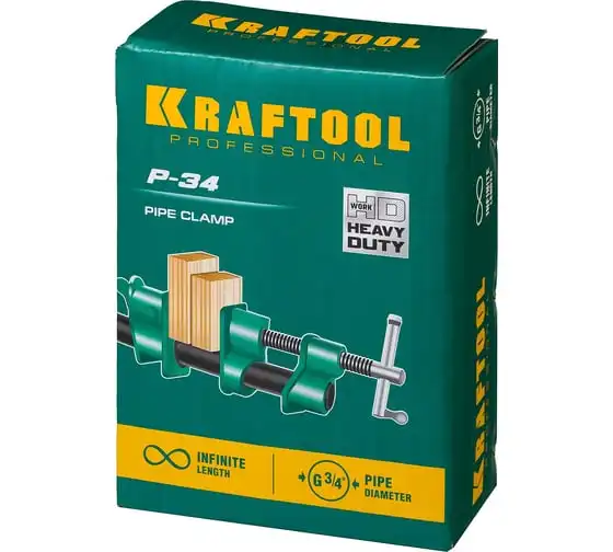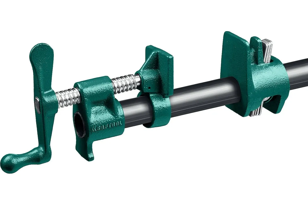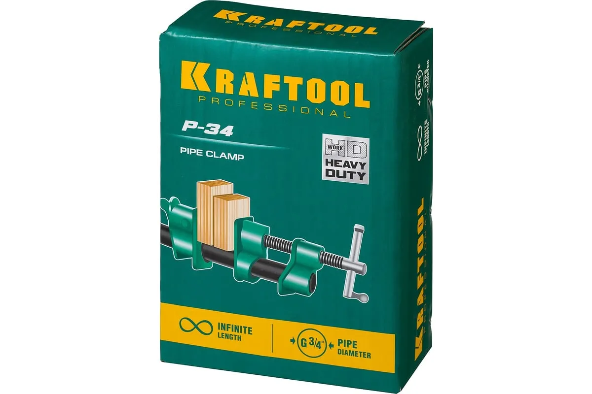 Струбцина KRAFTOOL P-34 3/4, трубная 32302-1 предназначена для склеивания больших щитов, из которых обычно делают двери или столешницы. Трубная струбцина KRAFTOOL P-34 с неограниченной шириной захвата - надежный зажимной/распорный инструмент. Удобная рычажно-поворотная рукоятка, широкие ножки в основании, обеспечивает максимальный комфорт при выполнении работ. Усилие - до 500 кгс.