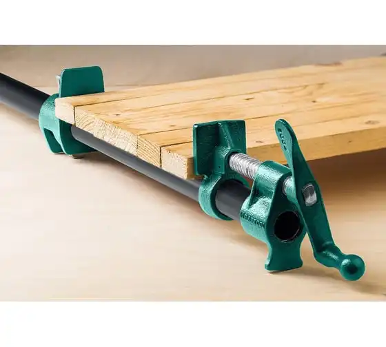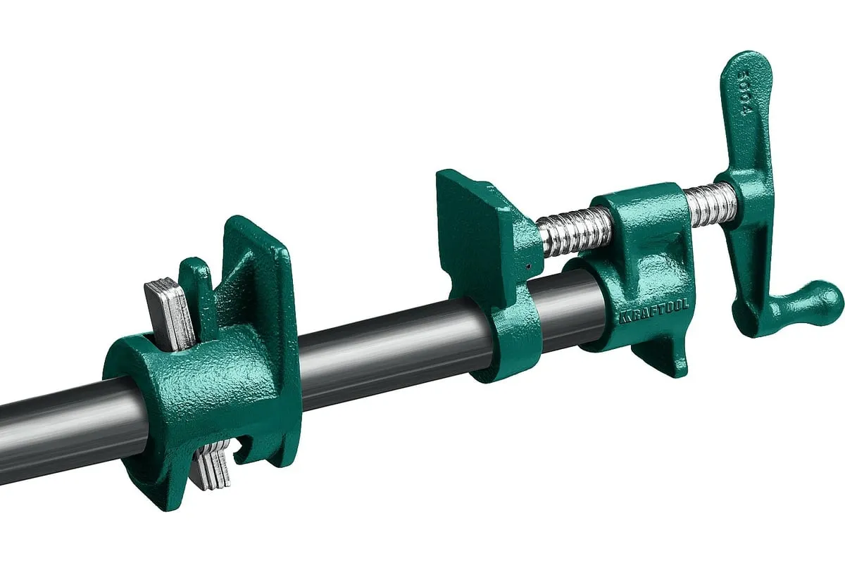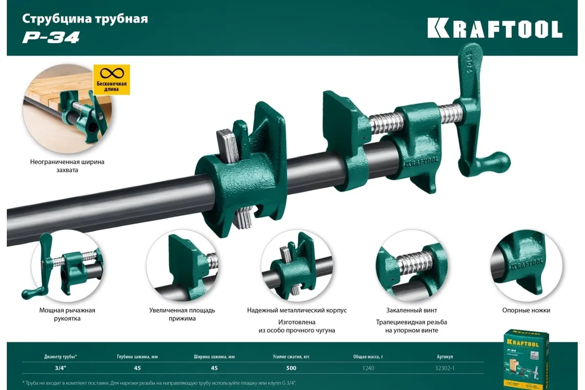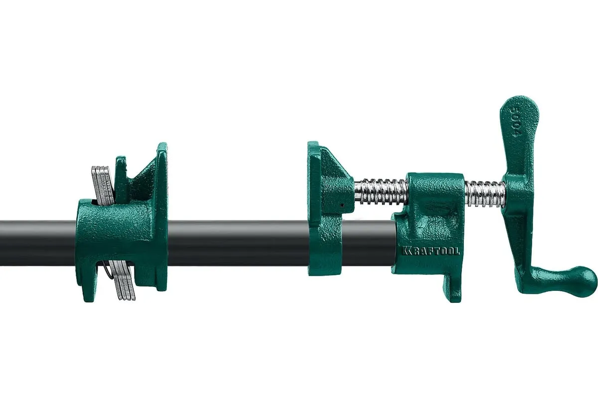 Струбцина KRAFTOOL P-34 3/4, трубная 32302-1 предназначена для склеивания больших щитов, из которых обычно делают двери или столешницы. Трубная струбцина KRAFTOOL P-34 с неограниченной шириной захвата - надежный зажимной/распорный инструмент. Удобная рычажно-поворотная рукоятка, широкие ножки в основании, обеспечивает максимальный комфорт при выполнении работ. Усилие - до 500 кгс.
