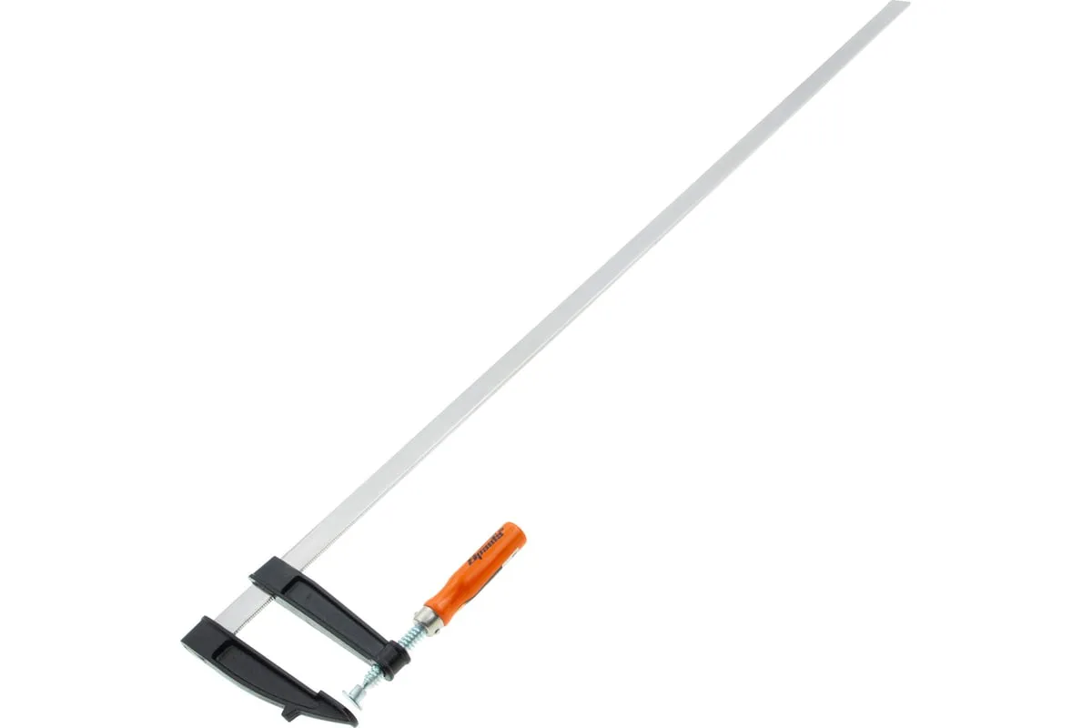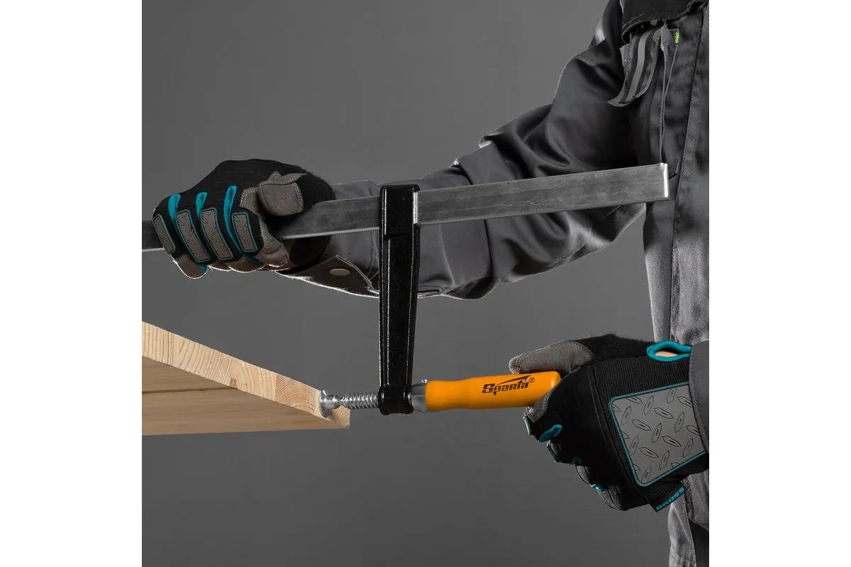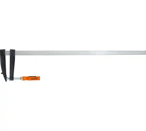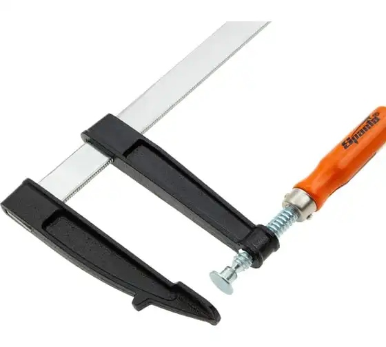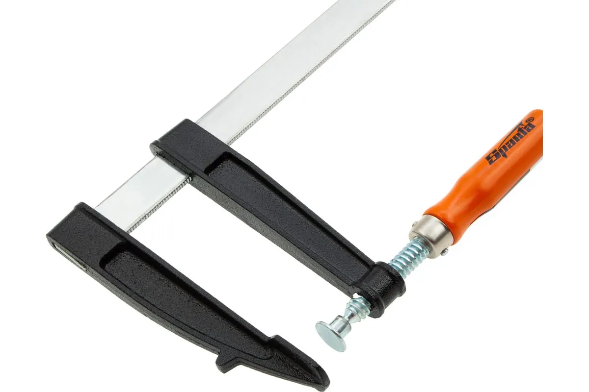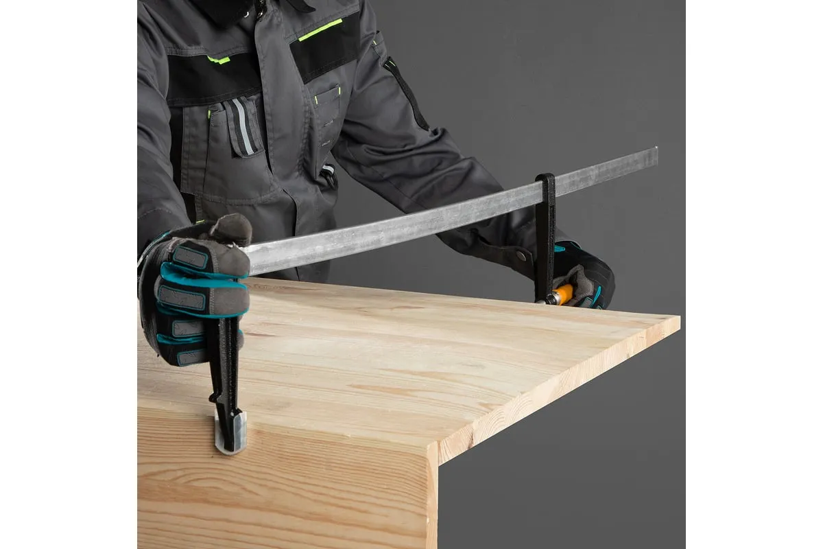 F-образная струбцина используется в столярном и слесарном деле и позволяет фиксировать заготовки из металла, древесины и других материалов для их соединения или обработки. Деталь помещают между губками, одна из которых подвижна и служит для регулировки величины захвата. Винтовой зажим позволяет прикладывать значительное усилие для надежности фиксации. Защитные накладки предотвращают повреждение детали. Элементы конструкции выдерживают высокую температуру, поэтому струбцина подходит для проведения сварочных работ, при этом пластиковые накладки необходимо снять.