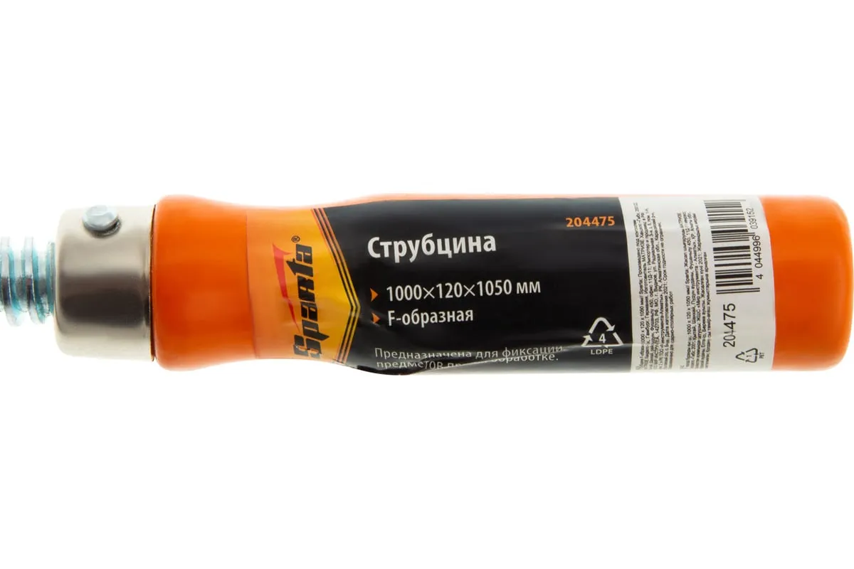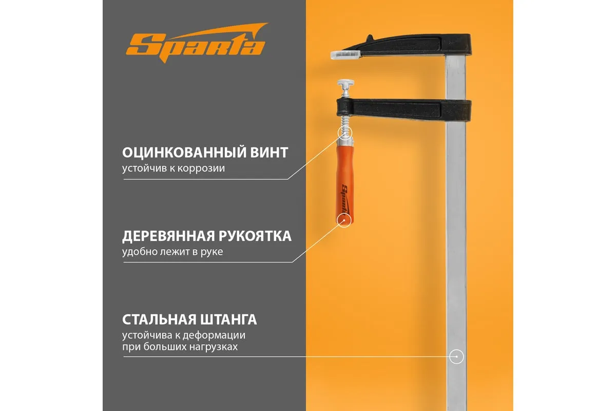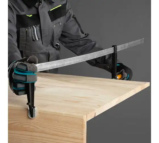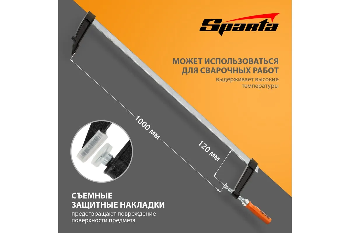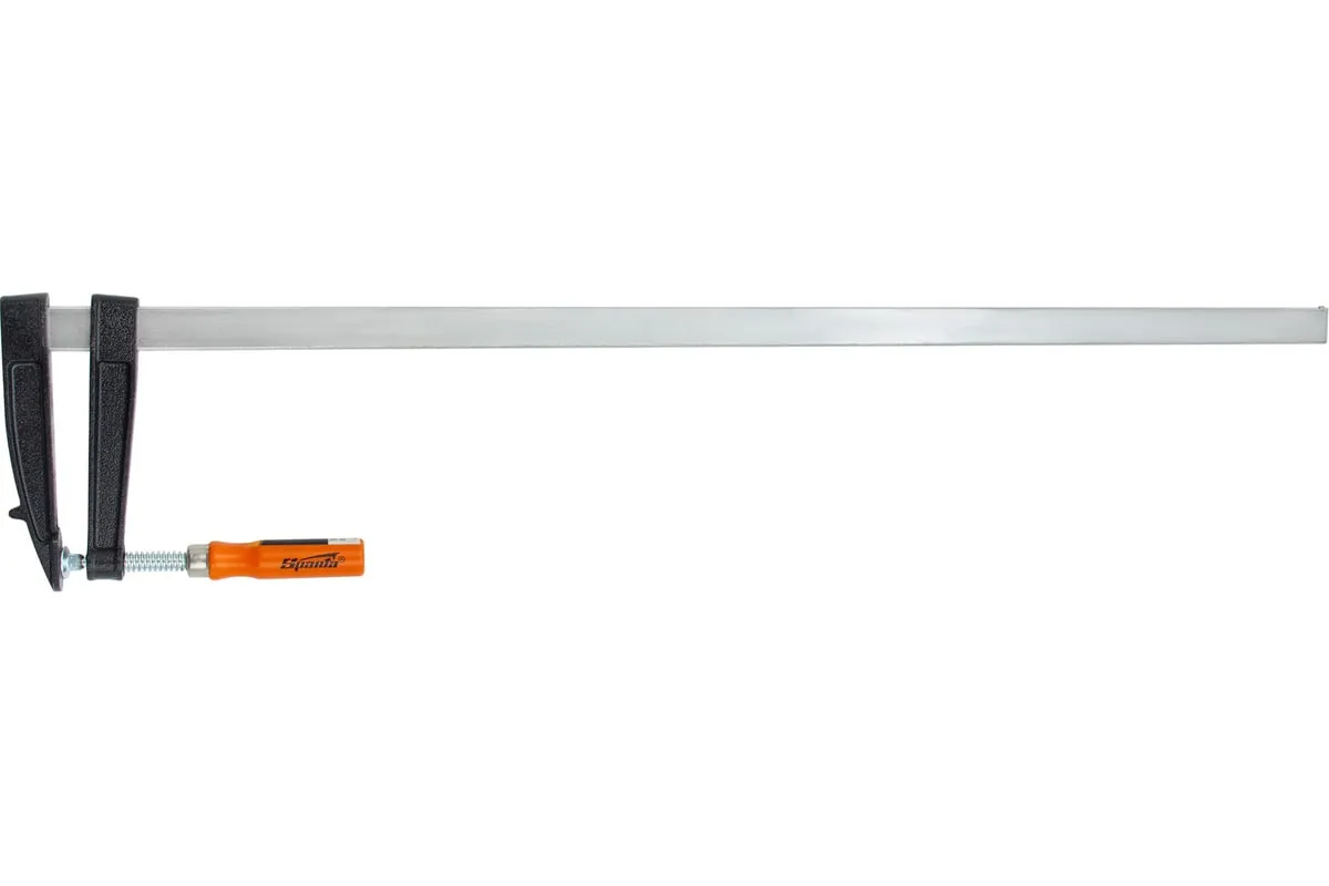 F-образная струбцина используется в столярном и слесарном деле и позволяет фиксировать заготовки из металла, древесины и других материалов для их соединения или обработки. Деталь помещают между губками, одна из которых подвижна и служит для регулировки величины захвата. Винтовой зажим позволяет прикладывать значительное усилие для надежности фиксации. Защитные накладки предотвращают повреждение детали. Элементы конструкции выдерживают высокую температуру, поэтому струбцина подходит для проведения сварочных работ, при этом пластиковые накладки необходимо снять.