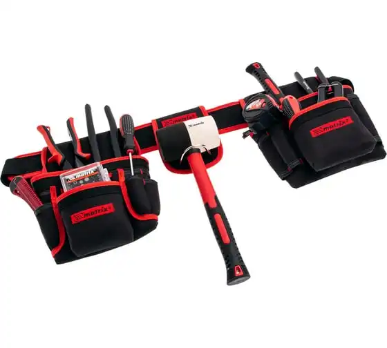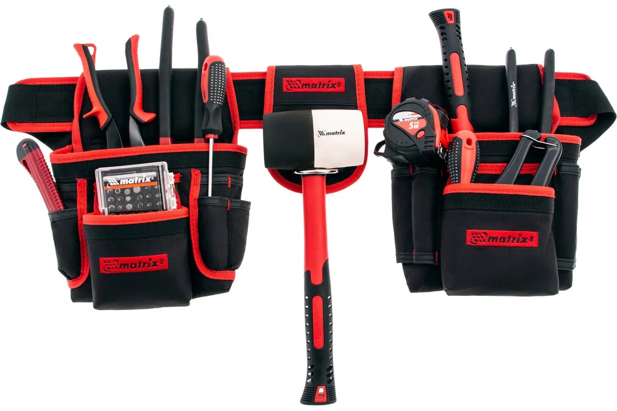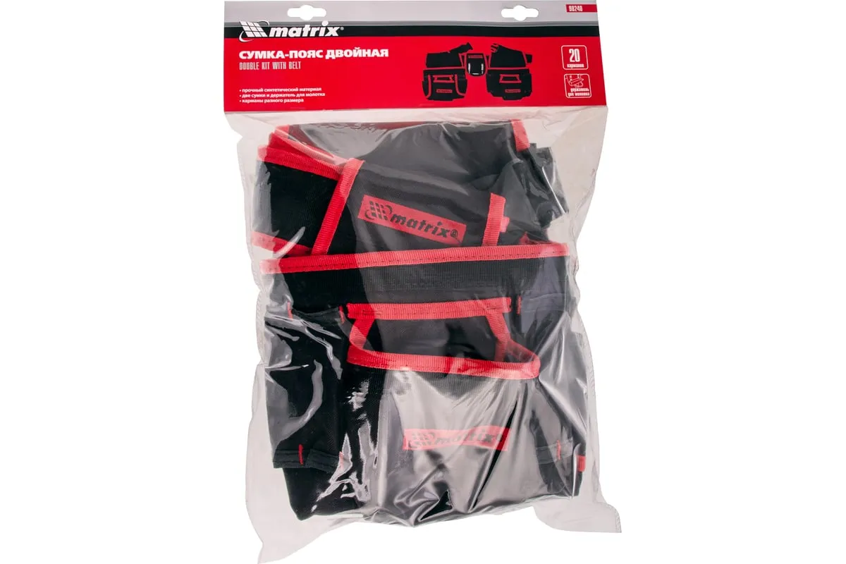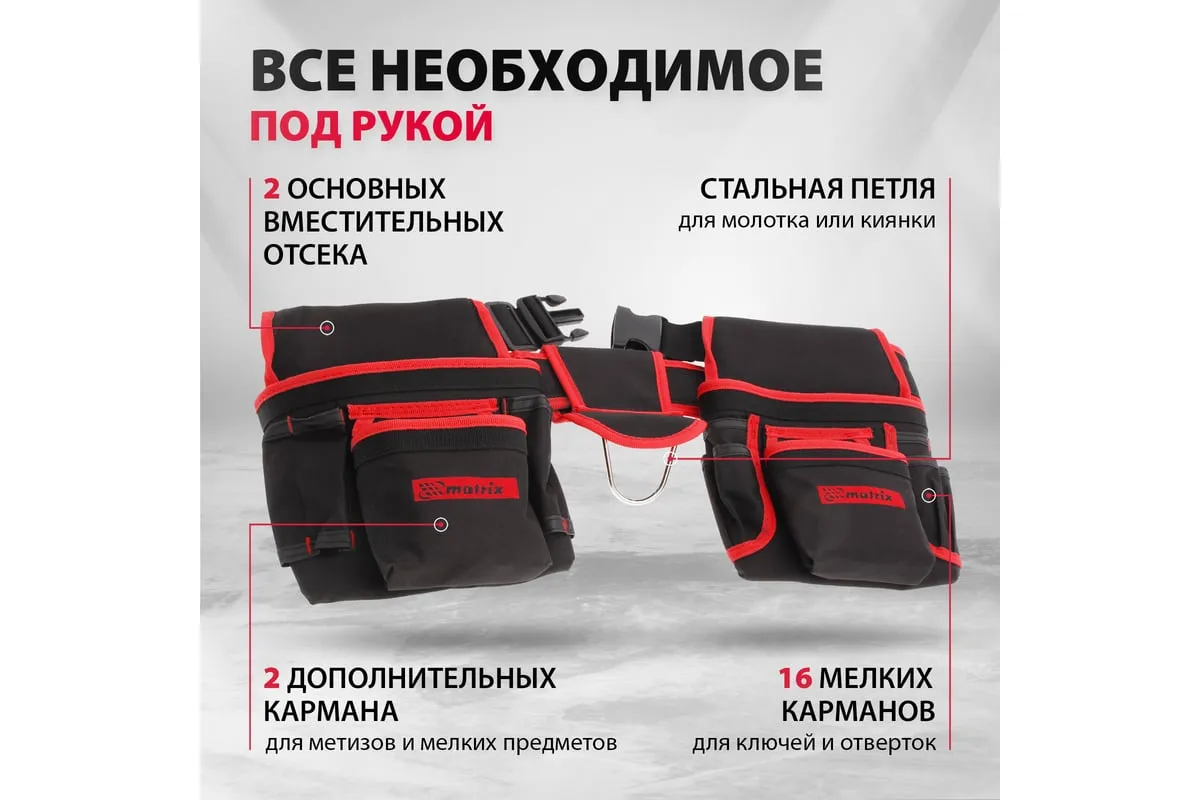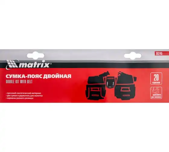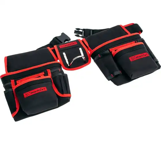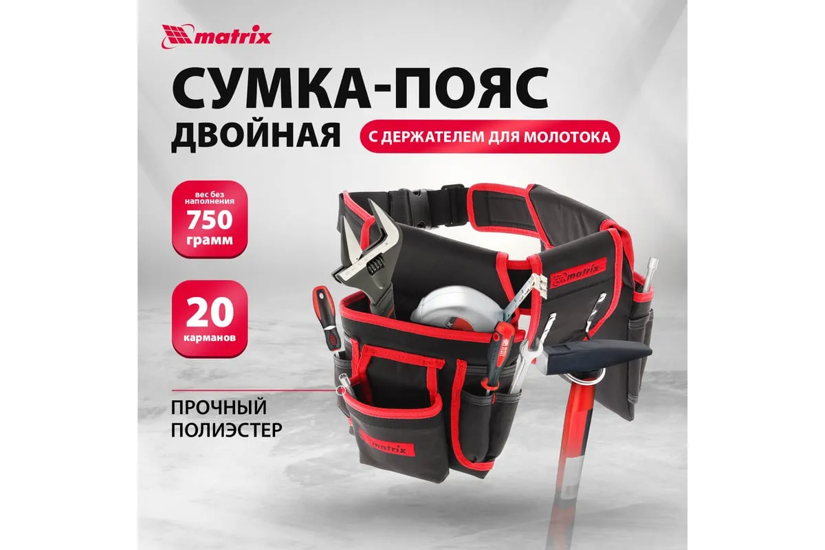 Двойная сумка-пояс Matrix 90240 с 20 карманами и держателем для молотка позволяет всегда иметь при себе необходимые инструменты, при этом оставляя руки свободными. Особенно удобна при проведении работ на стремянках или подмостях.