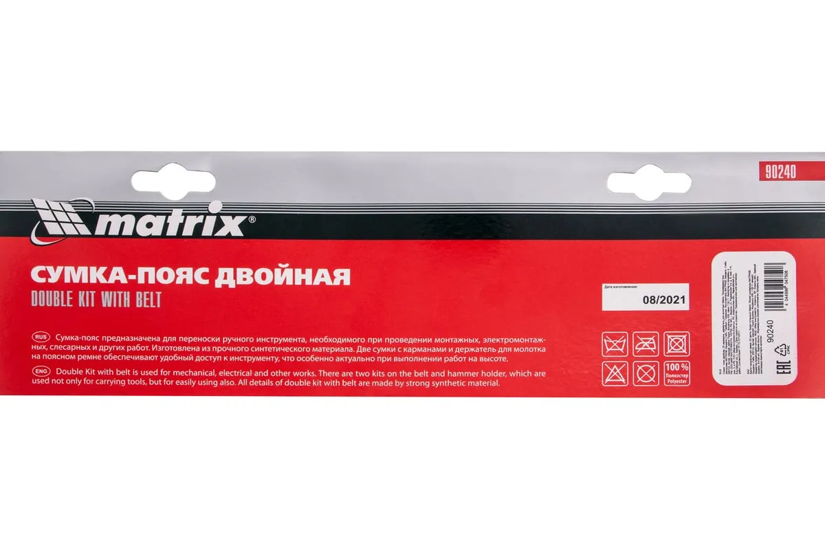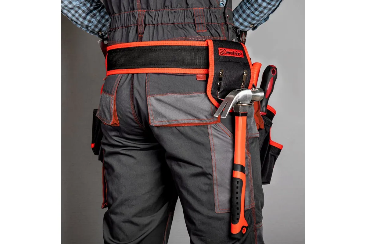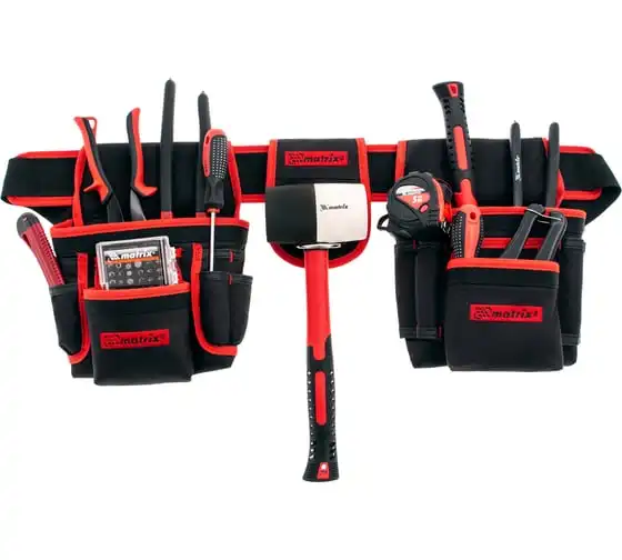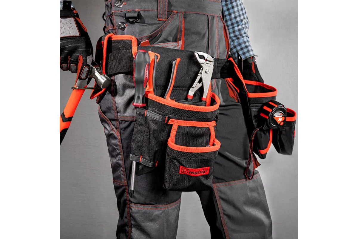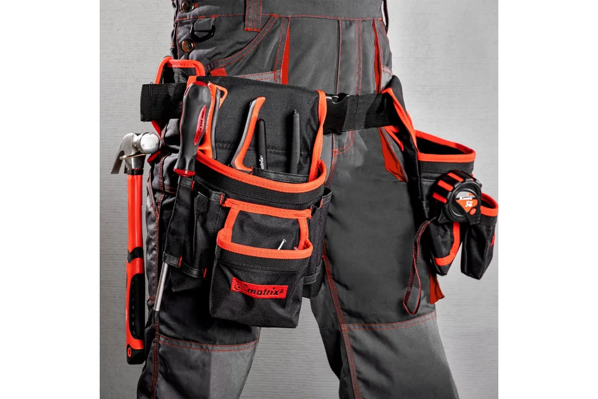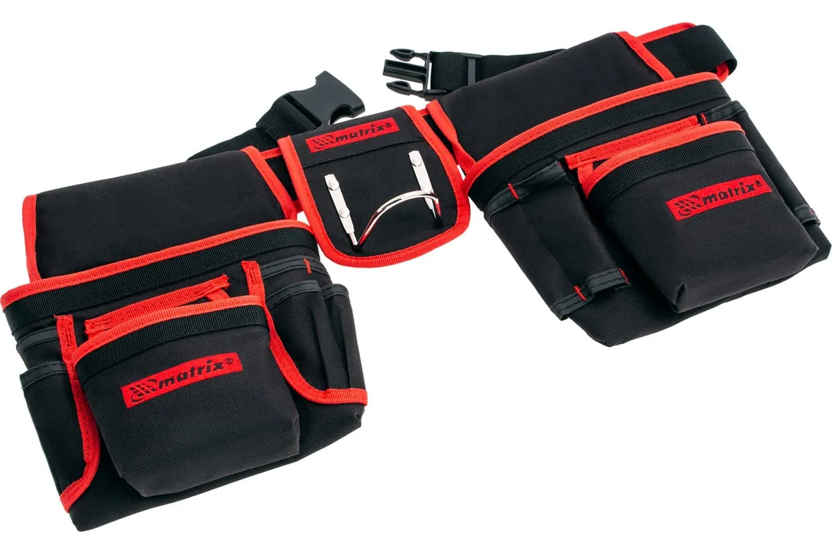 Двойная сумка-пояс Matrix 90240 с 20 карманами и держателем для молотка позволяет всегда иметь при себе необходимые инструменты, при этом оставляя руки свободными. Особенно удобна при проведении работ на стремянках или подмостях.