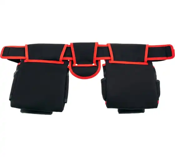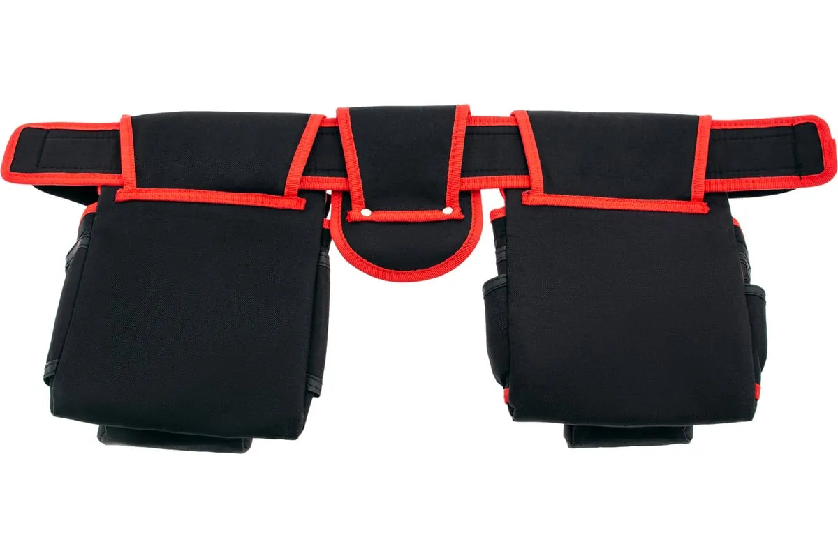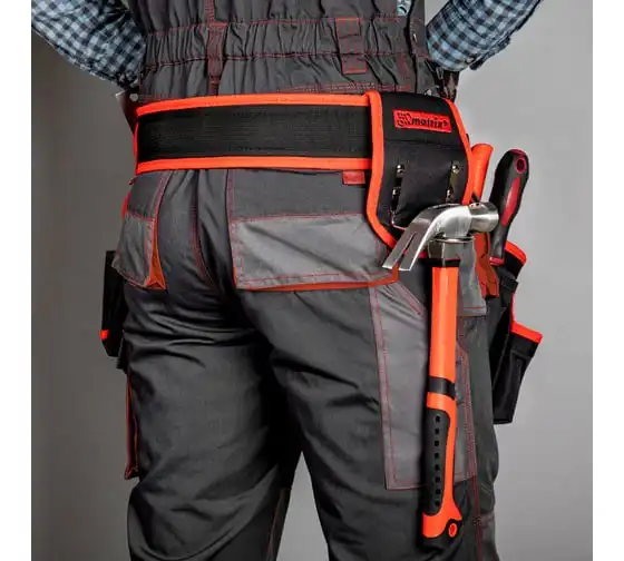 На пояс надеты 2 сумки, между которыми имеется отдельный держатель для молотка, поэтому инструменты можно распределить равномерно. 20 карманов.