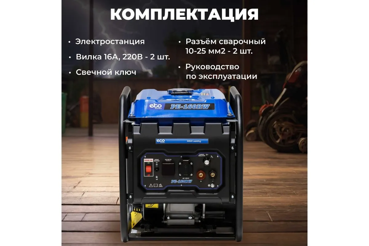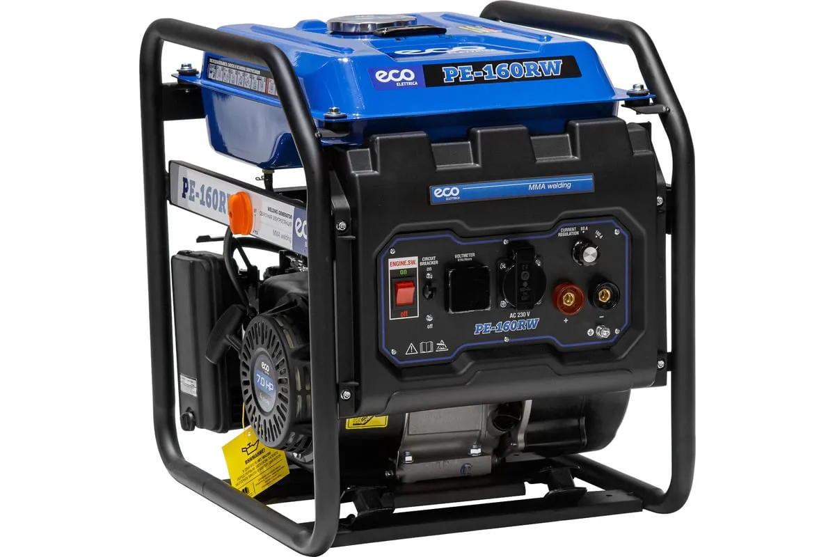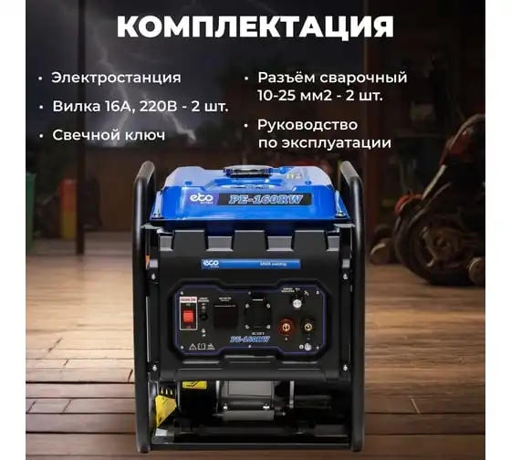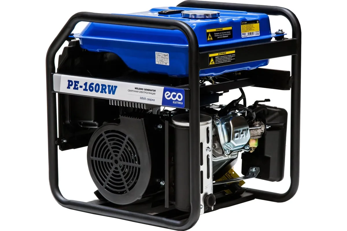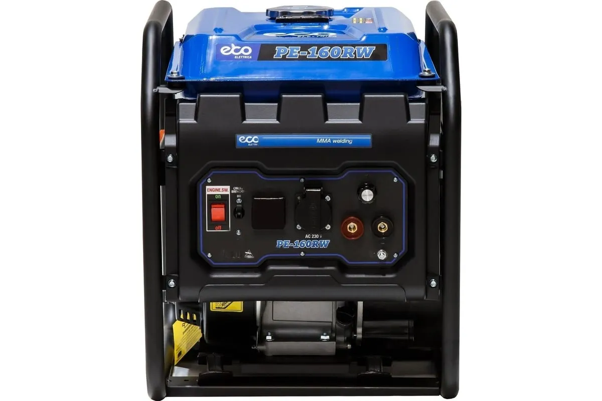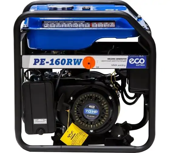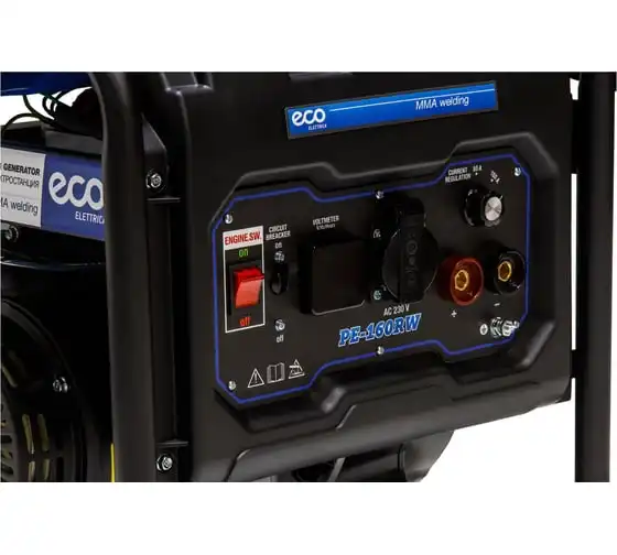 Генератор сварочный бензиновый ECO PE-160RW (EC1564-0) со встроенным источником электрической энергии и двигателем внутреннего сгорания предназначена для использования в качестве автономного источника ручной дуговой сварки или подключения электрооборудования мощностью до 1,1 кВт. Бензиновая станция с функцией сварки представляет собой комбинированную электростанцию для сварки и энергоснабжения.