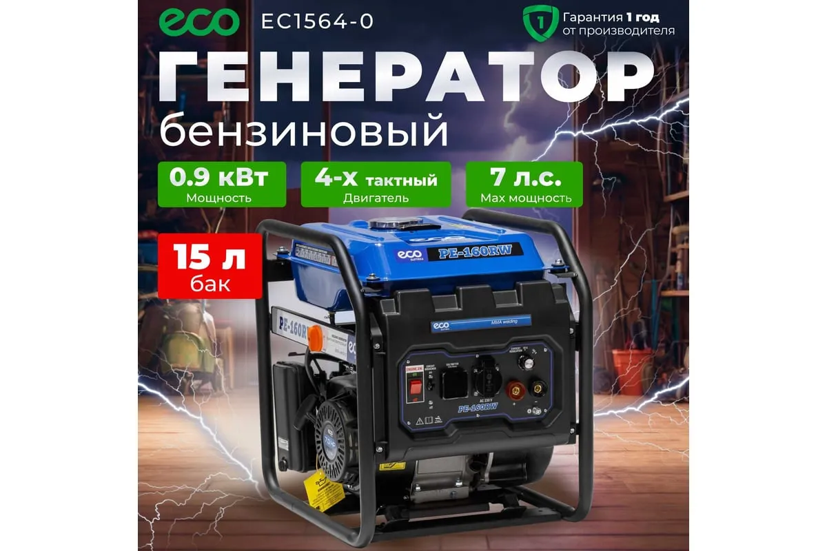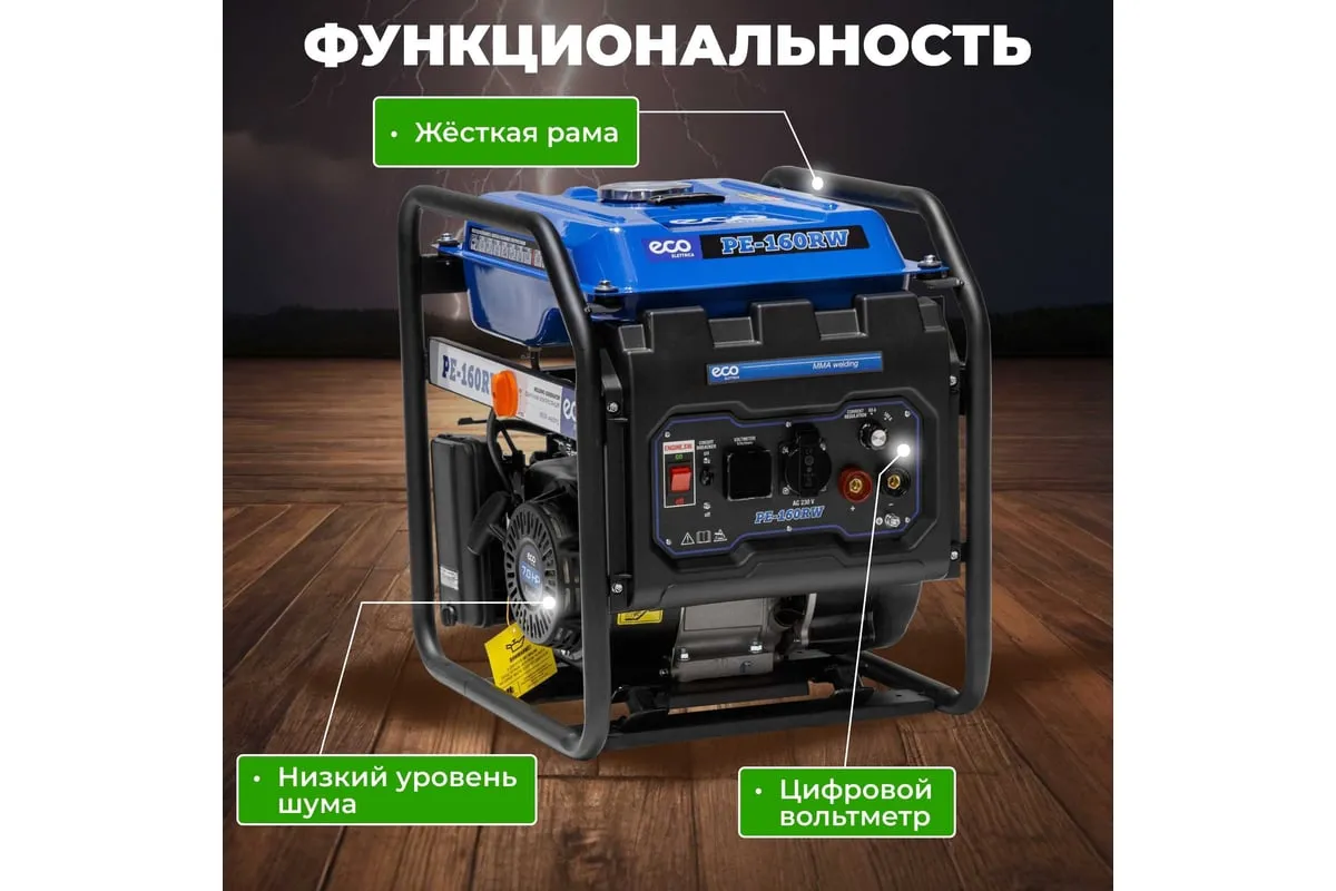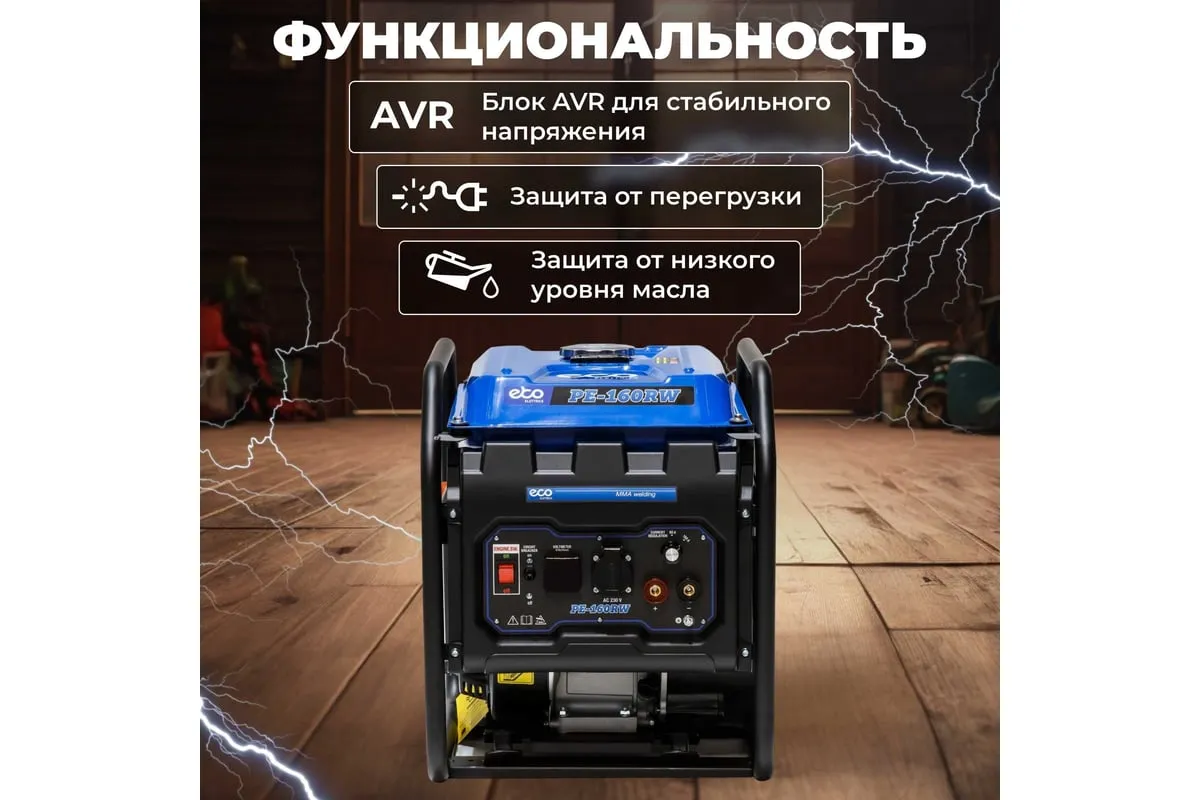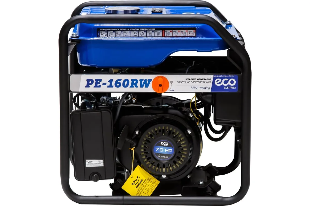 Генератор сварочный бензиновый ECO PE-160RW (EC1564-0) со встроенным источником электрической энергии и двигателем внутреннего сгорания предназначена для использования в качестве автономного источника ручной дуговой сварки или подключения электрооборудования мощностью до 1,1 кВт. Бензиновая станция с функцией сварки представляет собой комбинированную электростанцию для сварки и энергоснабжения.