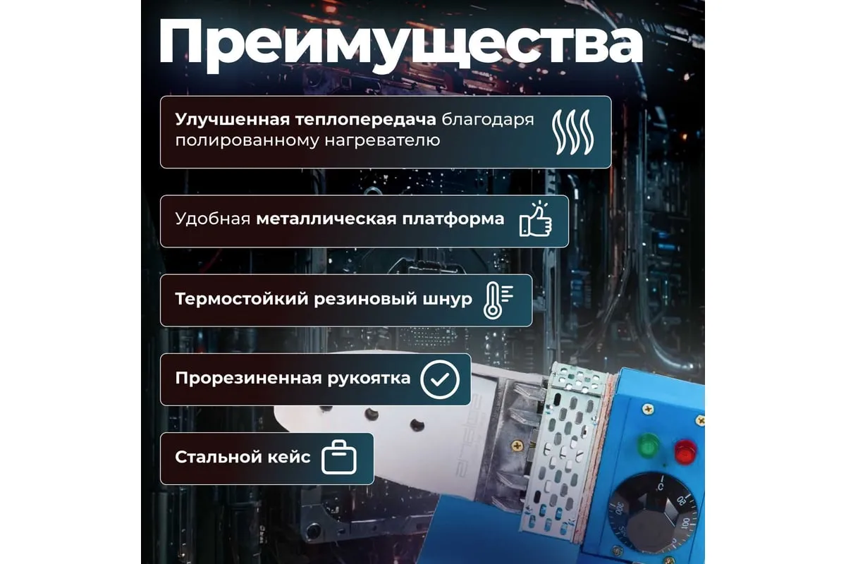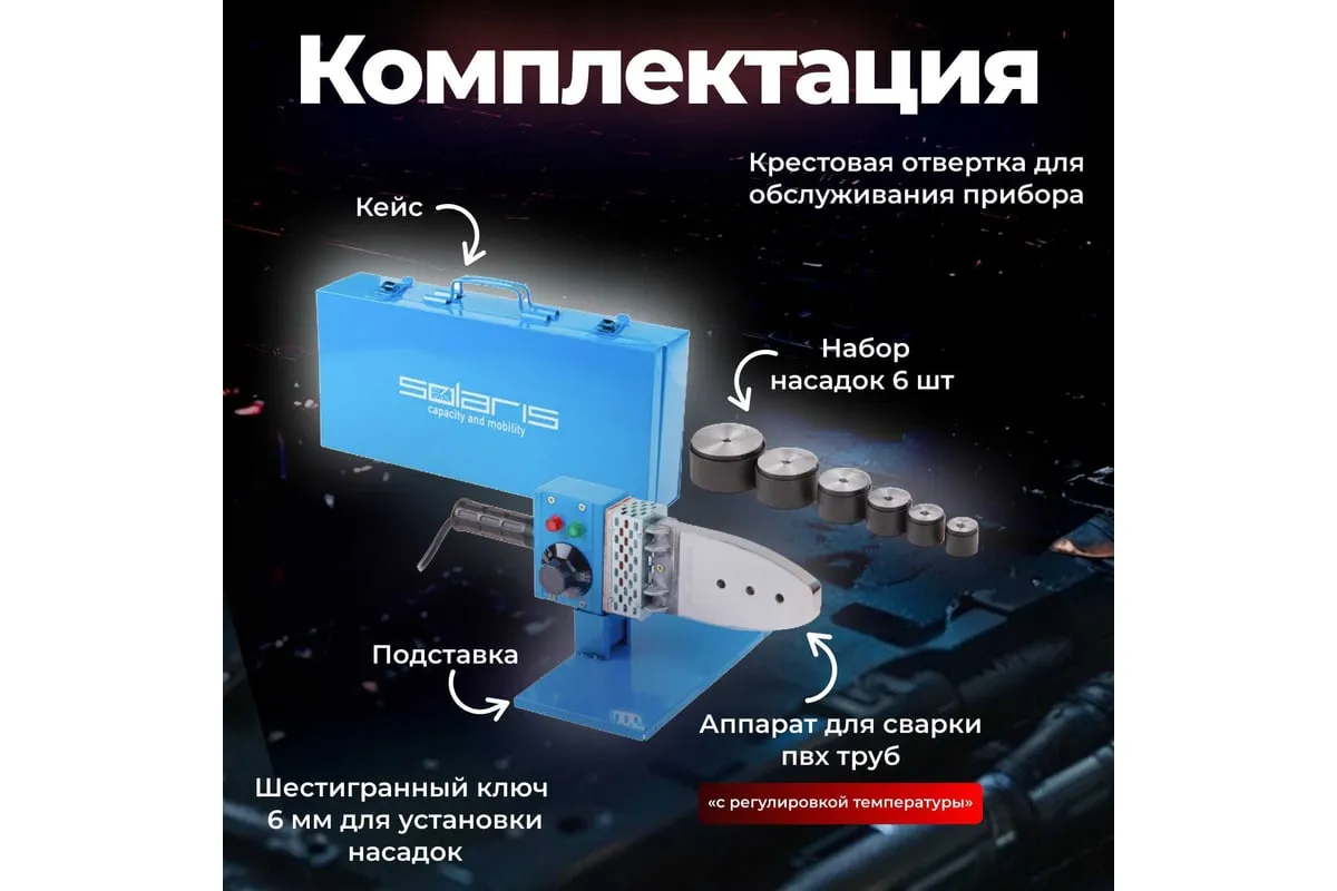 Сварочный аппарат для полимерных труб SOLARIS PW-1002 - это бытовой инструмент, который пригодится при выполнении ремонтно-монтажных сантехнических работ. Аппарат для сварки пластиковых труб имеет встроенный терморегулятор, который позволяет автоматически поддерживать заданную температуру.