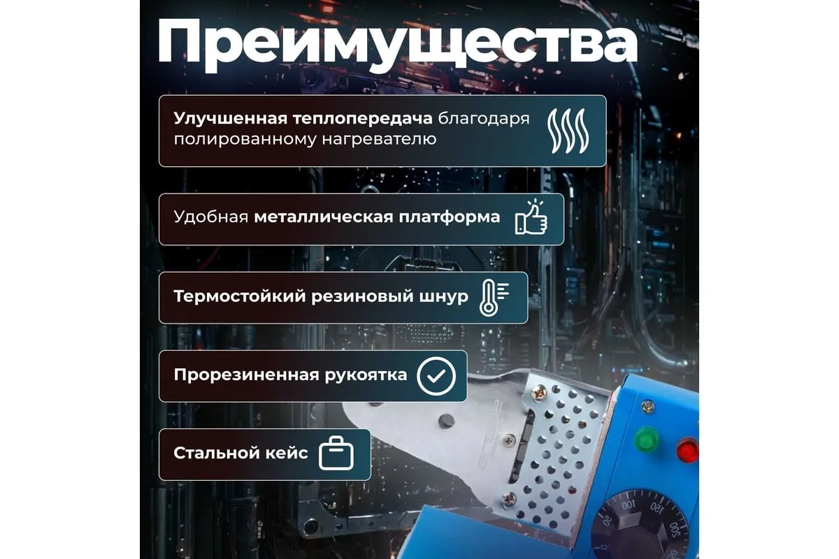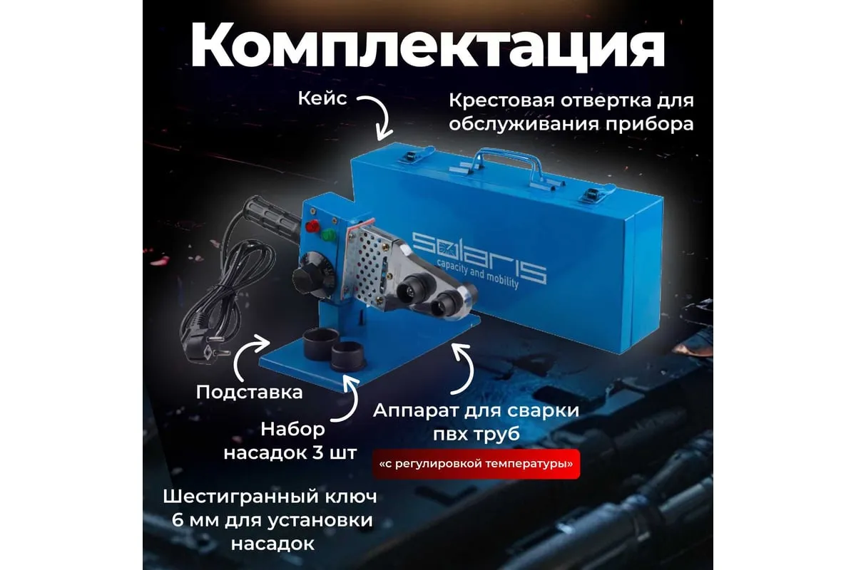 Сварочный аппарат для полимерных труб SOLARIS PW-602 - это бытовой инструмент, который пригодится при выполнении ремонтно-монтажных сантехнических работ. Аппарат для сварки пластиковых труб имеет встроенный терморегулятор, который позволяет автоматически поддерживать заданную температуру.
