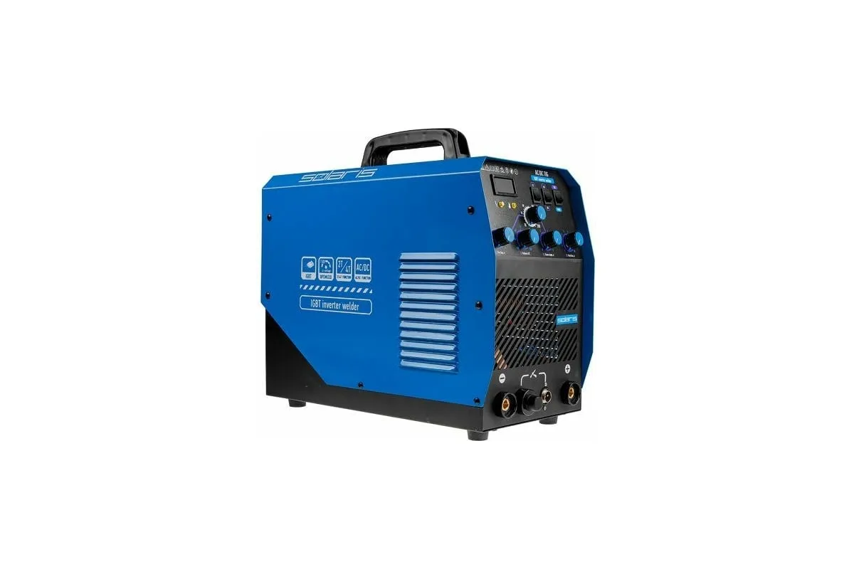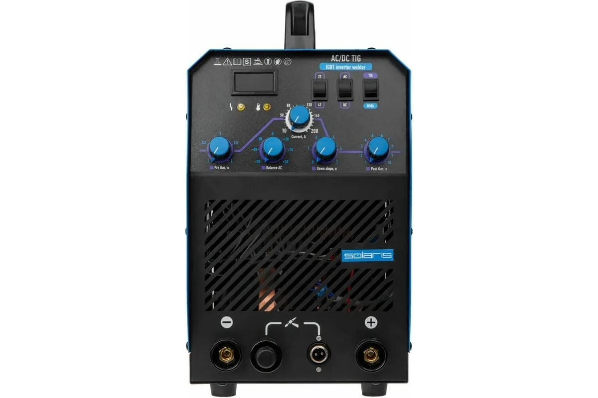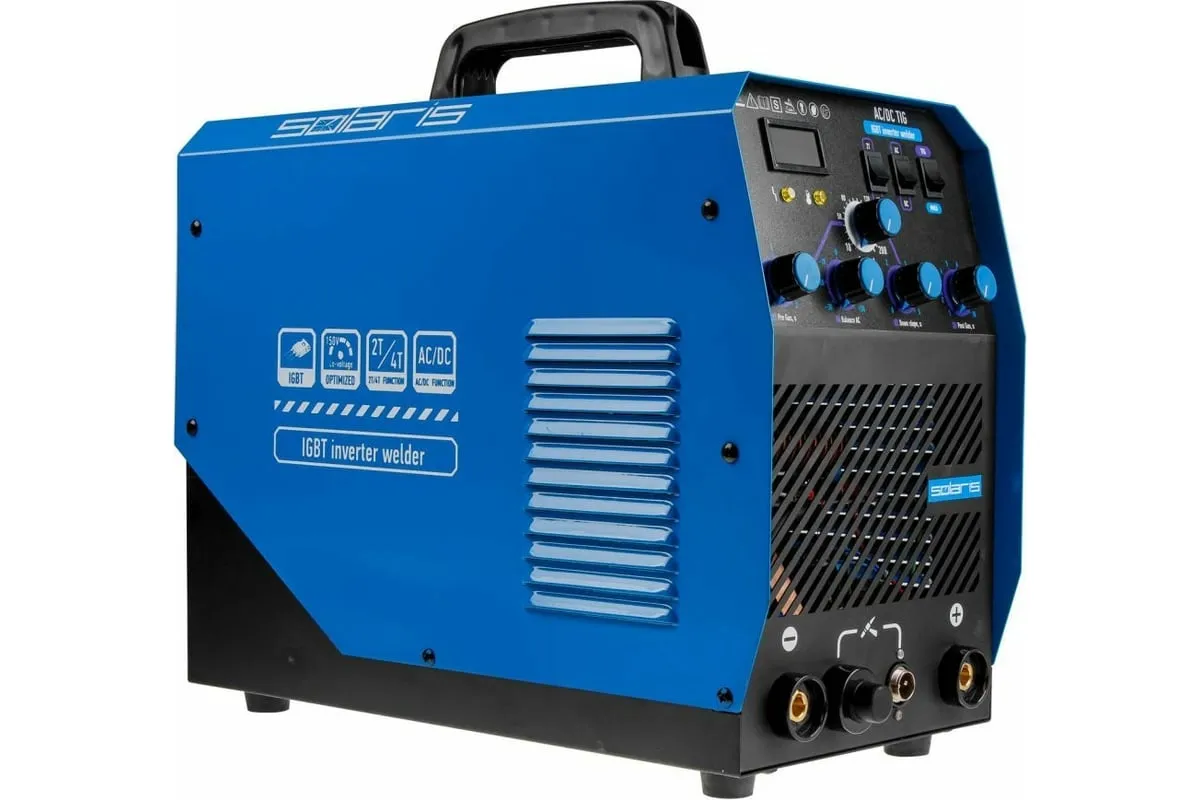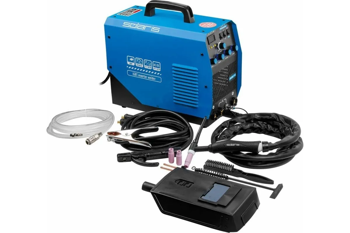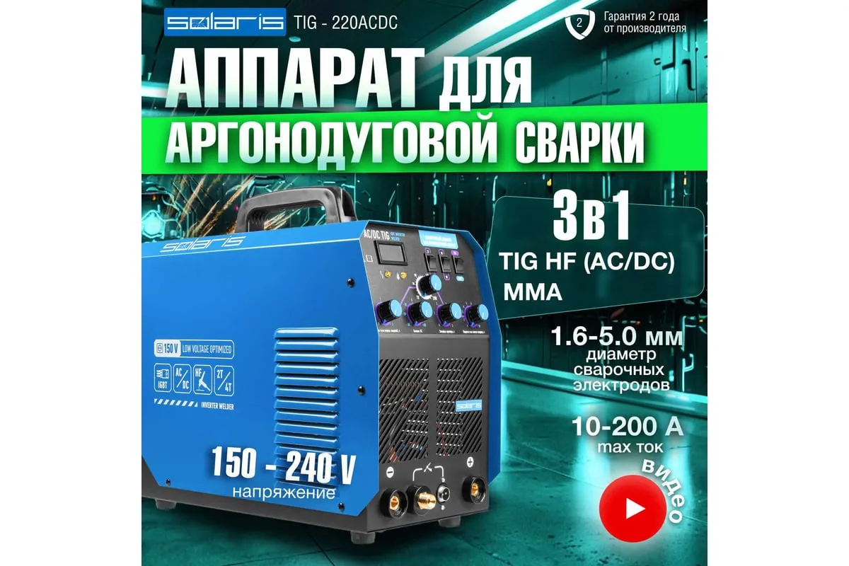 Сварочный инвертор SOLARIS TIG-220 AC/DC TIG-220ACDC подходит для аргонодуговой сварки (TIG) и ручной дуговой сварки покрытым электродом (ММА), сварки неплавящимся вольфрамовым электродом в среде защитного газа (преимущественно аргона) постоянным током (DC). Аппарат отлично подходит для сварки любой углеродистой низколегированной или высоколегированной стали, в том числе и нержавеющей стали, тяжелых цветных металлов, таких как медь, никель, титан и их сплавов. AC TIG - режим переменного тока позволяет справиться даже с такими трудными материалами, как алюминий, латунь, бронза и их различные сплавы. Модель обеспечивает аккуратный, точный и мелкий сварочный шов. Наличие цифрового дисплея позволяет полностью контролировать сварочный процесс. Для комфортного использования устройство оснащено регулировкой сварочного тока, регулировкой частоты и базового тока. Функция Down Slope (заварка кратера) позволяет избежать образования воронки в конце сварочного шва. Внимание! Аппарат поставляется без вилки. В случае работы на максимальных токах, аппарат необходимо оснащать силовой однофазной вилкой 32А 230В.