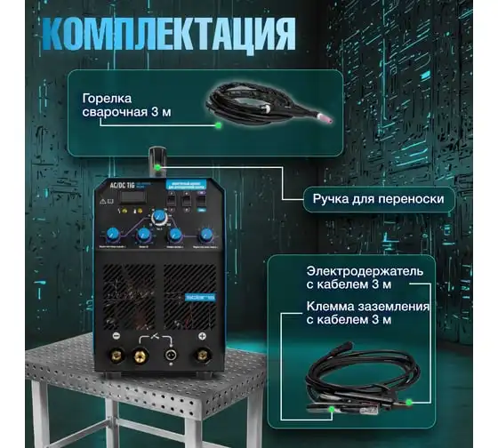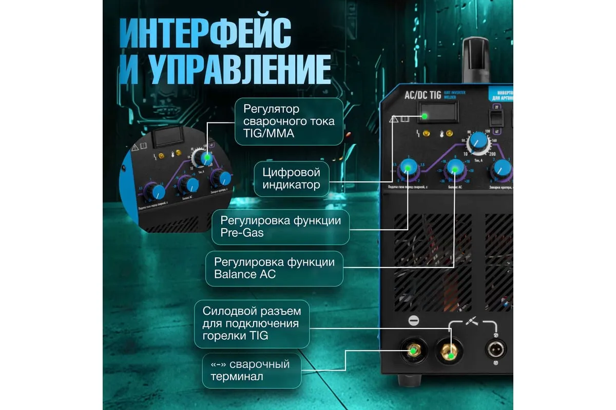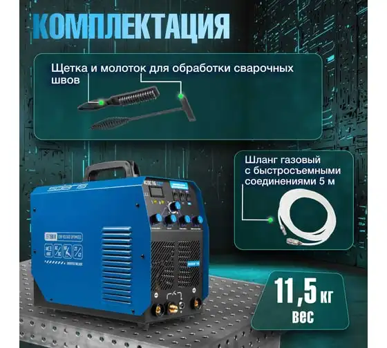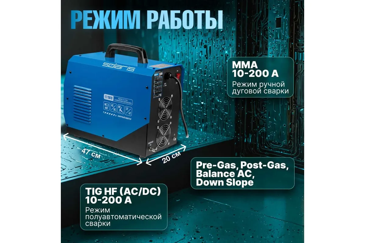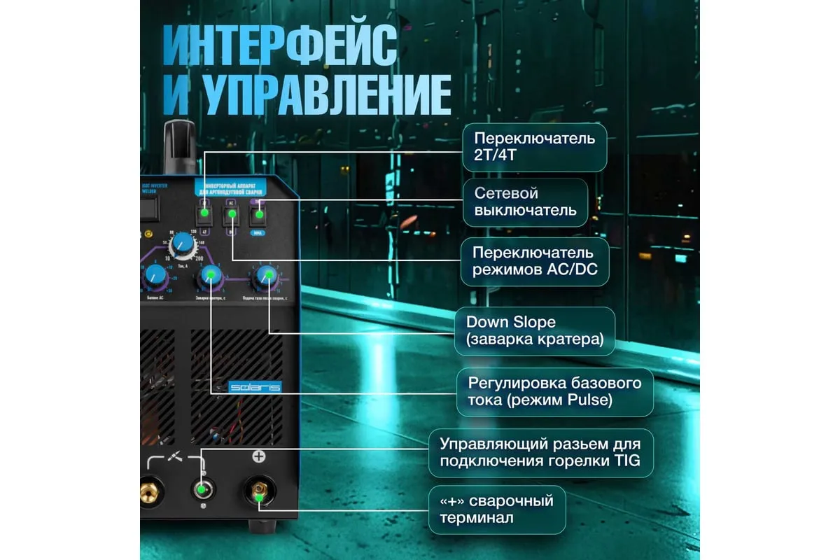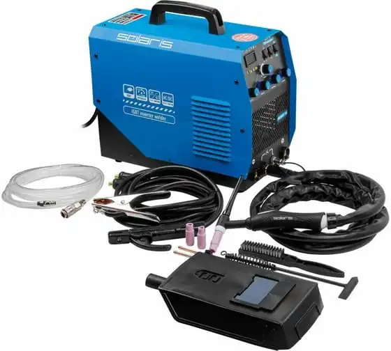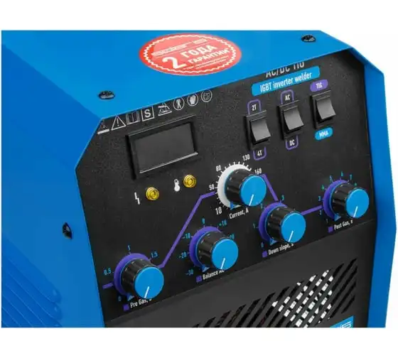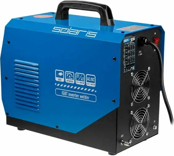 Сварочный инвертор SOLARIS TIG-220 AC/DC TIG-220ACDC подходит для аргонодуговой сварки (TIG) и ручной дуговой сварки покрытым электродом (ММА), сварки неплавящимся вольфрамовым электродом в среде защитного газа (преимущественно аргона) постоянным током (DC). Аппарат отлично подходит для сварки любой углеродистой низколегированной или высоколегированной стали, в том числе и нержавеющей стали, тяжелых цветных металлов, таких как медь, никель, титан и их сплавов. AC TIG - режим переменного тока позволяет справиться даже с такими трудными материалами, как алюминий, латунь, бронза и их различные сплавы. Модель обеспечивает аккуратный, точный и мелкий сварочный шов. Наличие цифрового дисплея позволяет полностью контролировать сварочный процесс. Для комфортного использования устройство оснащено регулировкой сварочного тока, регулировкой частоты и базового тока. Функция Down Slope (заварка кратера) позволяет избежать образования воронки в конце сварочного шва. Внимание! Аппарат поставляется без вилки. В случае работы на максимальных токах, аппарат необходимо оснащать силовой однофазной вилкой 32А 230В.