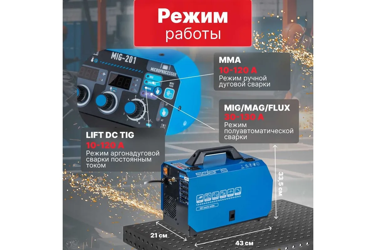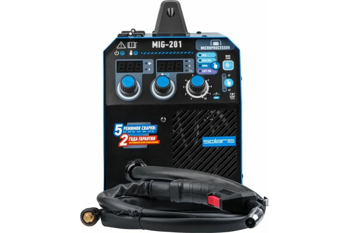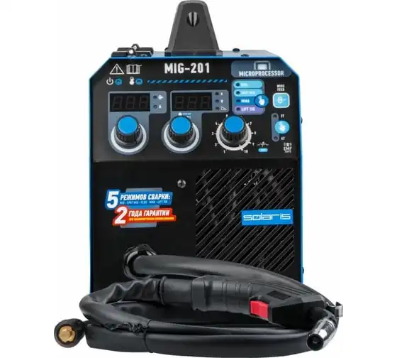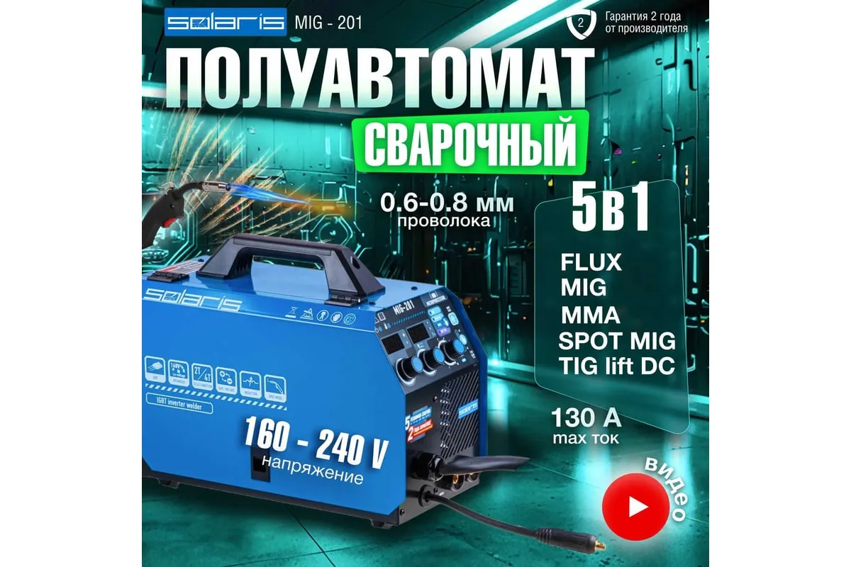 Сварочный полуавтомат SOLARIS MIG-201 обеспечивает качественный сварной шов при равномерной обработке металла. Аппарат имеет высокопрочный корпус с надежной вентиляцией - это повышает ПВ даже при наличии лишь пассивной системы охлаждения. Можно работать даже при высокой внешней температуре около 40 градусов. Аппарат легко настраивать и транспортировать. ВНИМАНИЕ! Аппарат поставляется без вилки. В случае работы на максимальных токах, аппарат необходимо оснащать силовой однофазной вилкой 32А 230В (не входит в комплект). Hежим точечной сварки SPOT идеально подойдет для сварки тонколистового металла (например, кузовов автомобилей). Необходимо настроить время сварки одной точки, и после этого все точечные швы будут сварены одинаково хорошо и качественно.