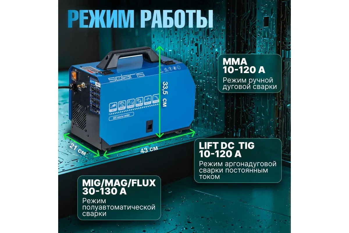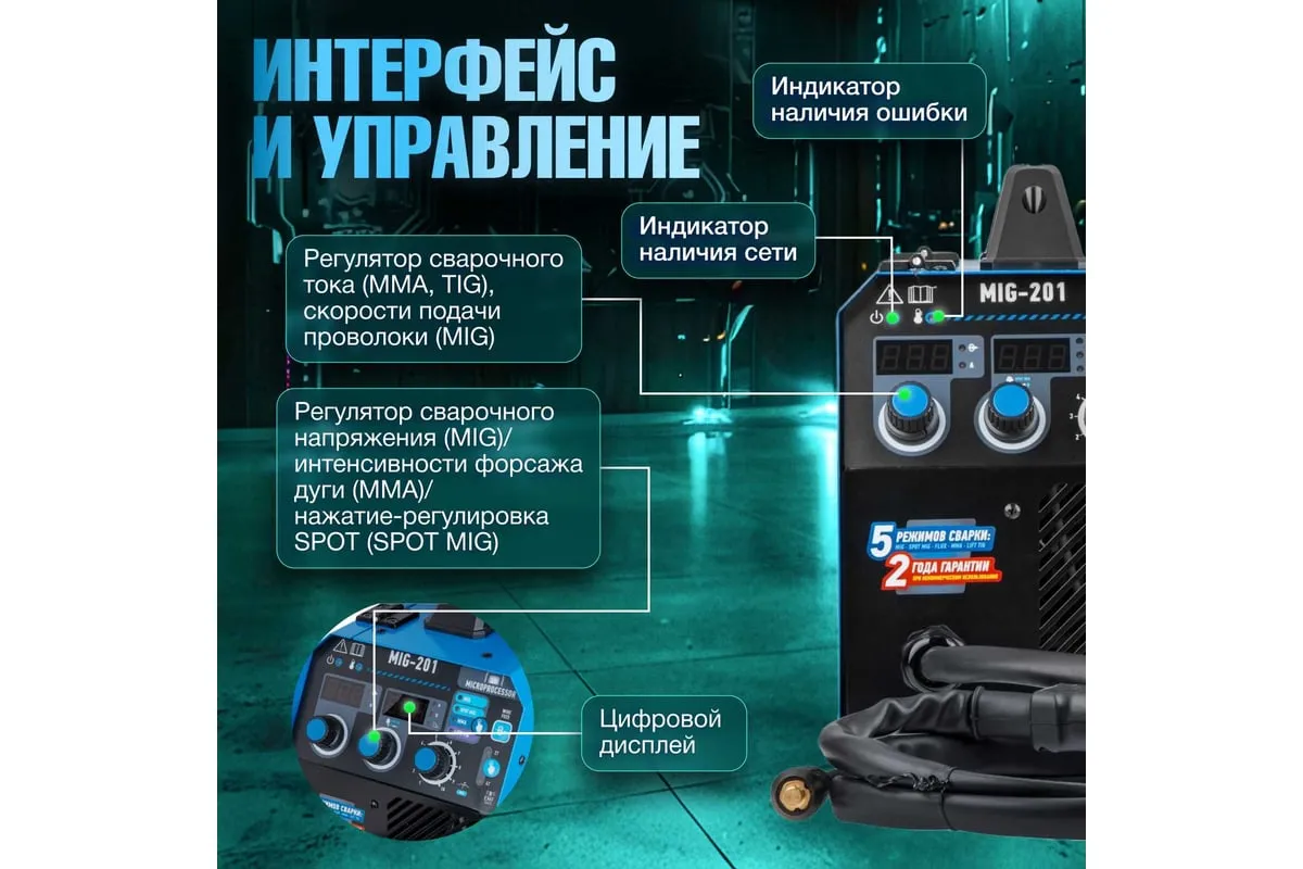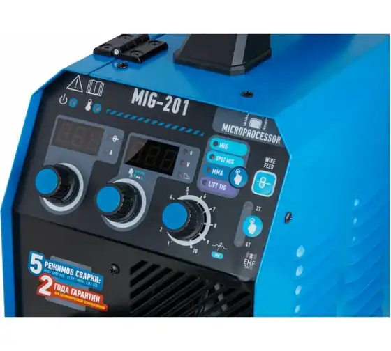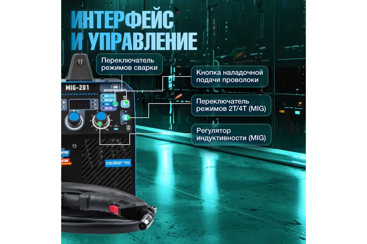 Сварочный полуавтомат SOLARIS MIG-201 обеспечивает качественный сварной шов при равномерной обработке металла. Аппарат имеет высокопрочный корпус с надежной вентиляцией - это повышает ПВ даже при наличии лишь пассивной системы охлаждения. Можно работать даже при высокой внешней температуре около 40 градусов. Аппарат легко настраивать и транспортировать. ВНИМАНИЕ! Аппарат поставляется без вилки. В случае работы на максимальных токах, аппарат необходимо оснащать силовой однофазной вилкой 32А 230В (не входит в комплект). Hежим точечной сварки SPOT идеально подойдет для сварки тонколистового металла (например, кузовов автомобилей). Необходимо настроить время сварки одной точки, и после этого все точечные швы будут сварены одинаково хорошо и качественно.