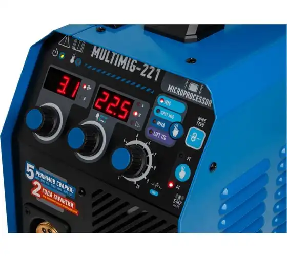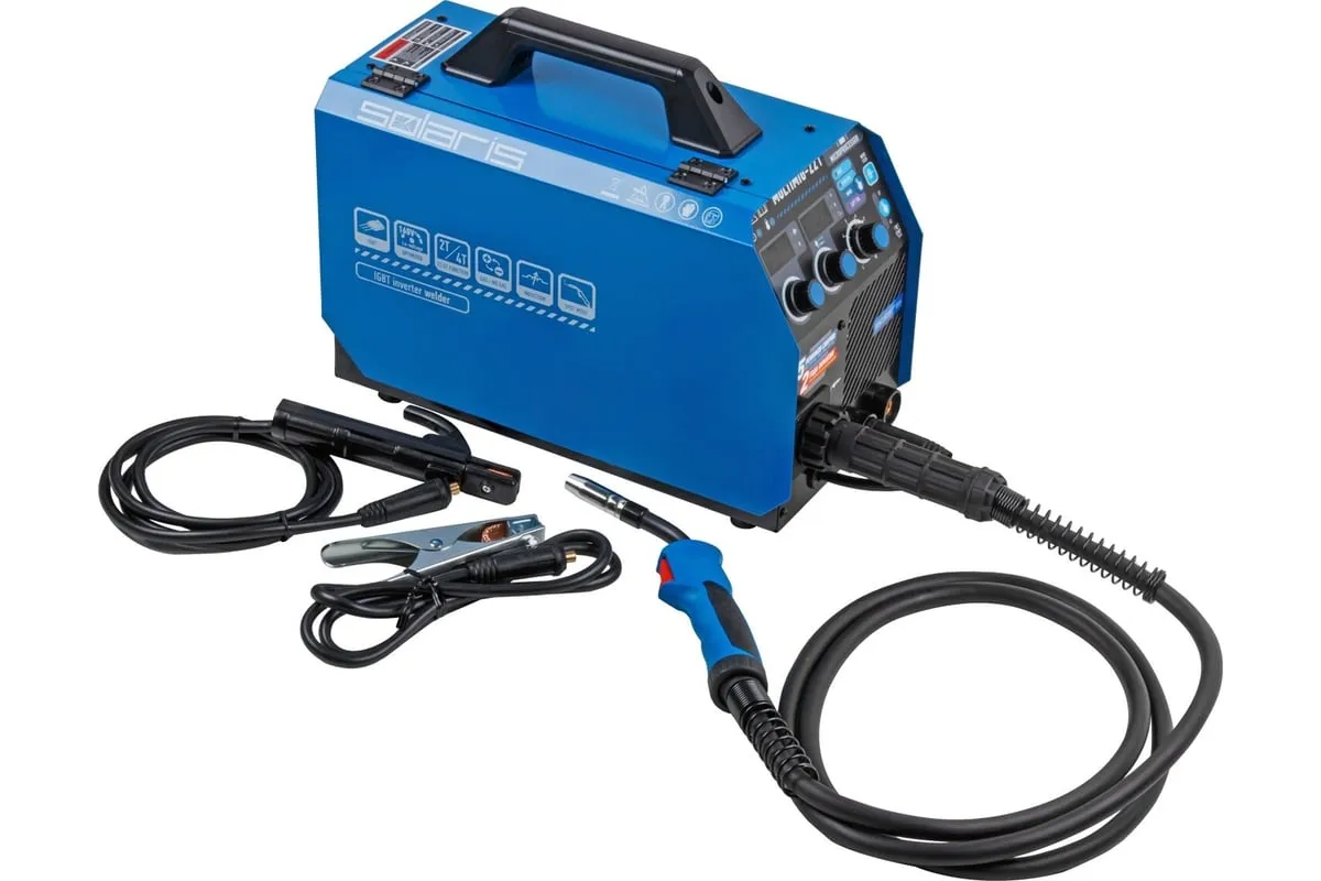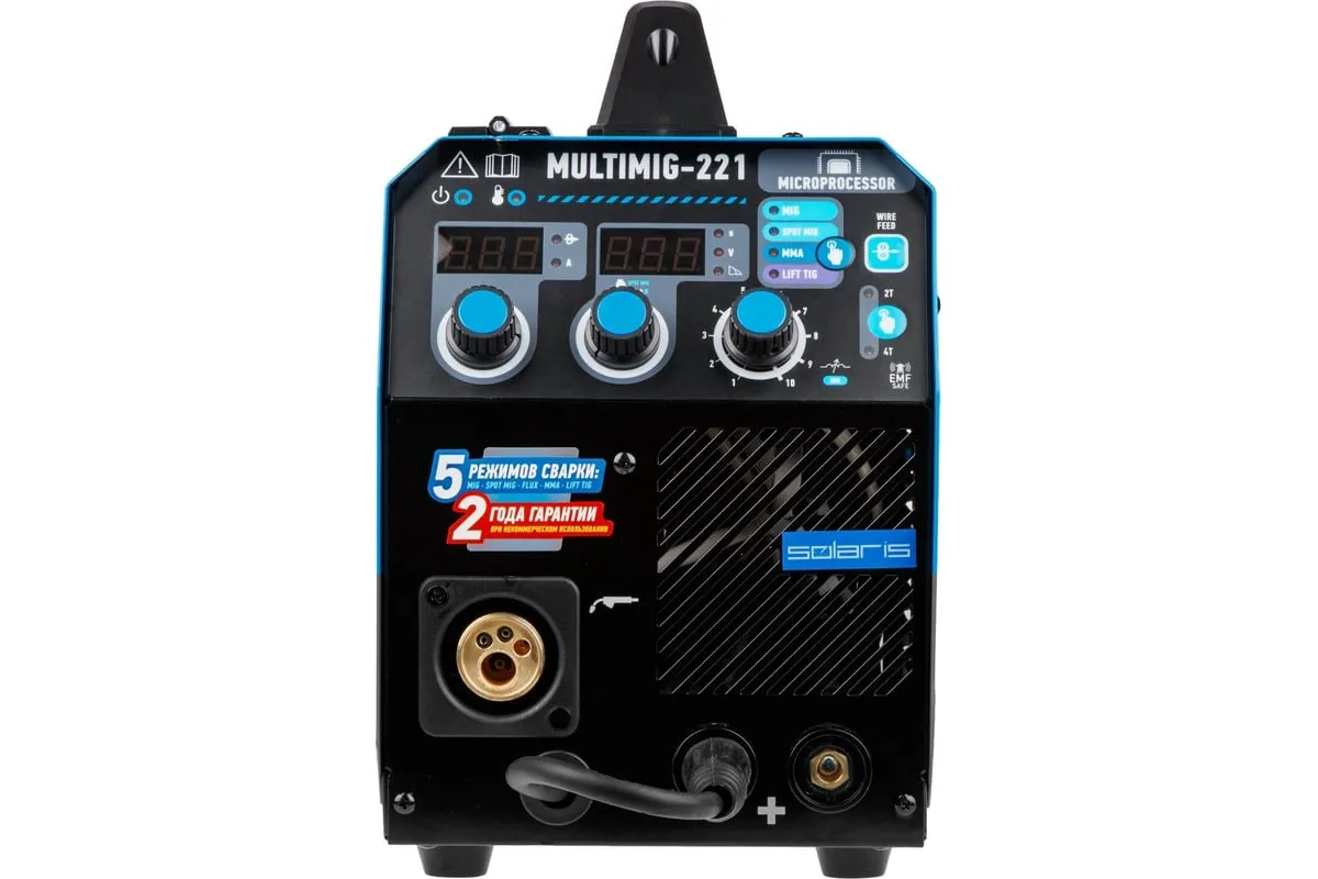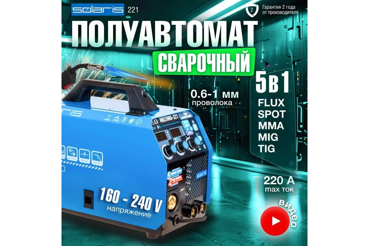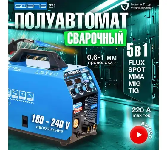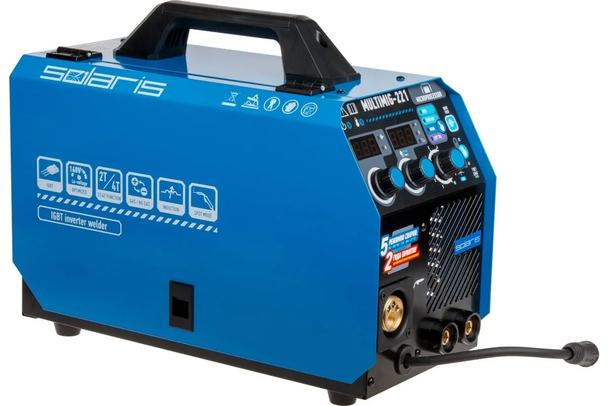 Сварочный полуавтомат SOLARIS MULTIMIG-221 предназначен для сварки проволокой в среде защитных газов (MIG/MAG) и ручной электродуговой сварки с применением плавких электродов (ММА) различных металлов. Микропроцессорное управление сварочным током обеспечивает отличные рабочие характеристики и оперативное подстраивание к любым условиям процесса и типам сварки. Аппарат работает на 4 IGBT-транзисторах, что обеспечивает его надежность и долговечность. Аппарат обеспечивает стабильную работу в сетях с пониженных напряжением от 160 В. На сварочном полуавтомате SOLARIS MULTIMIG-221 есть возможность сварки алюминия в режиме полуавтоматической сварки MIG, однако для этого понадобится алюминиевая сварочная проволока (приобретается дополнительно), а также дополнительные аксессуары (не входят в комплект поставки): специальный подающий ролик и горелку MIG с тефлоновым рукавом подачи проволоки. Внимание! Аппарат поставляется без вилки! В случае работы на максимальных токах, аппарат необходимо оснащать силовой однофазной вилкой 32 А 220 В.