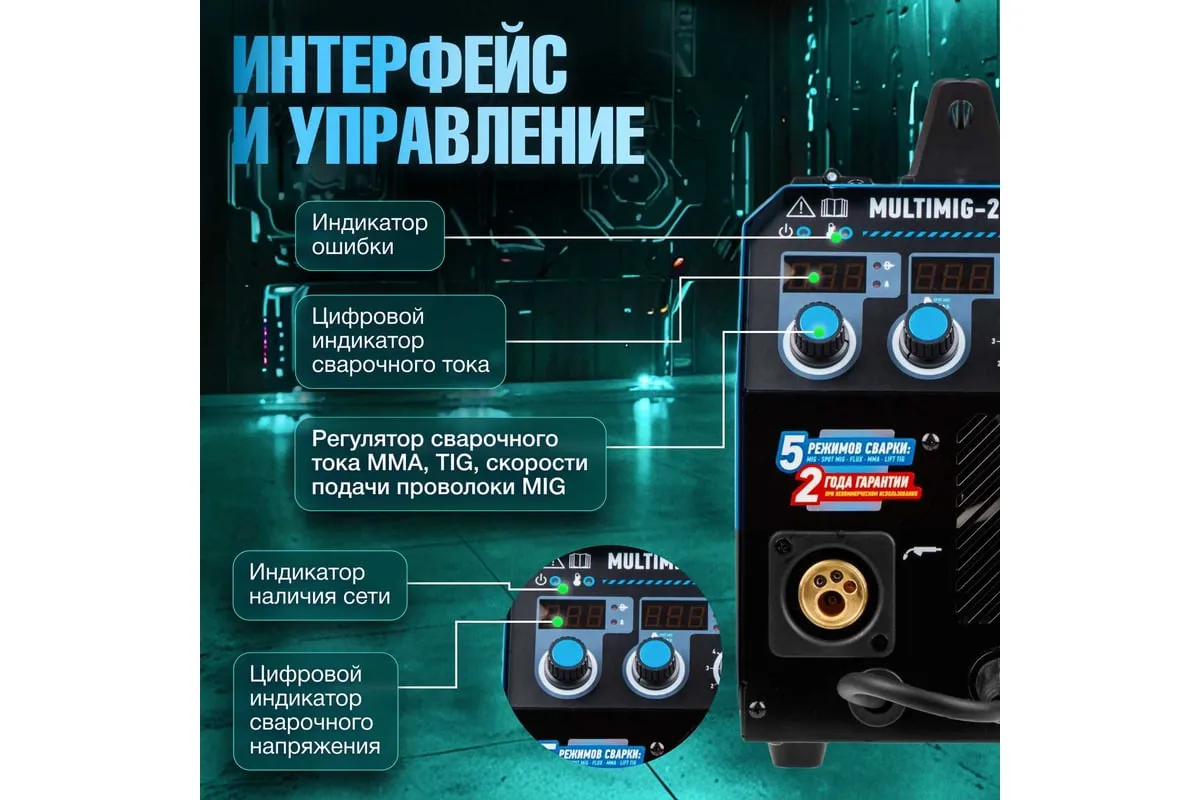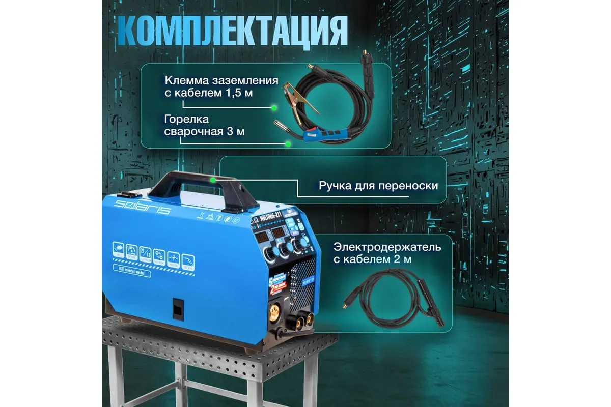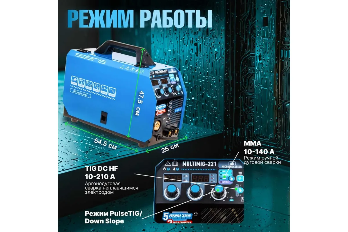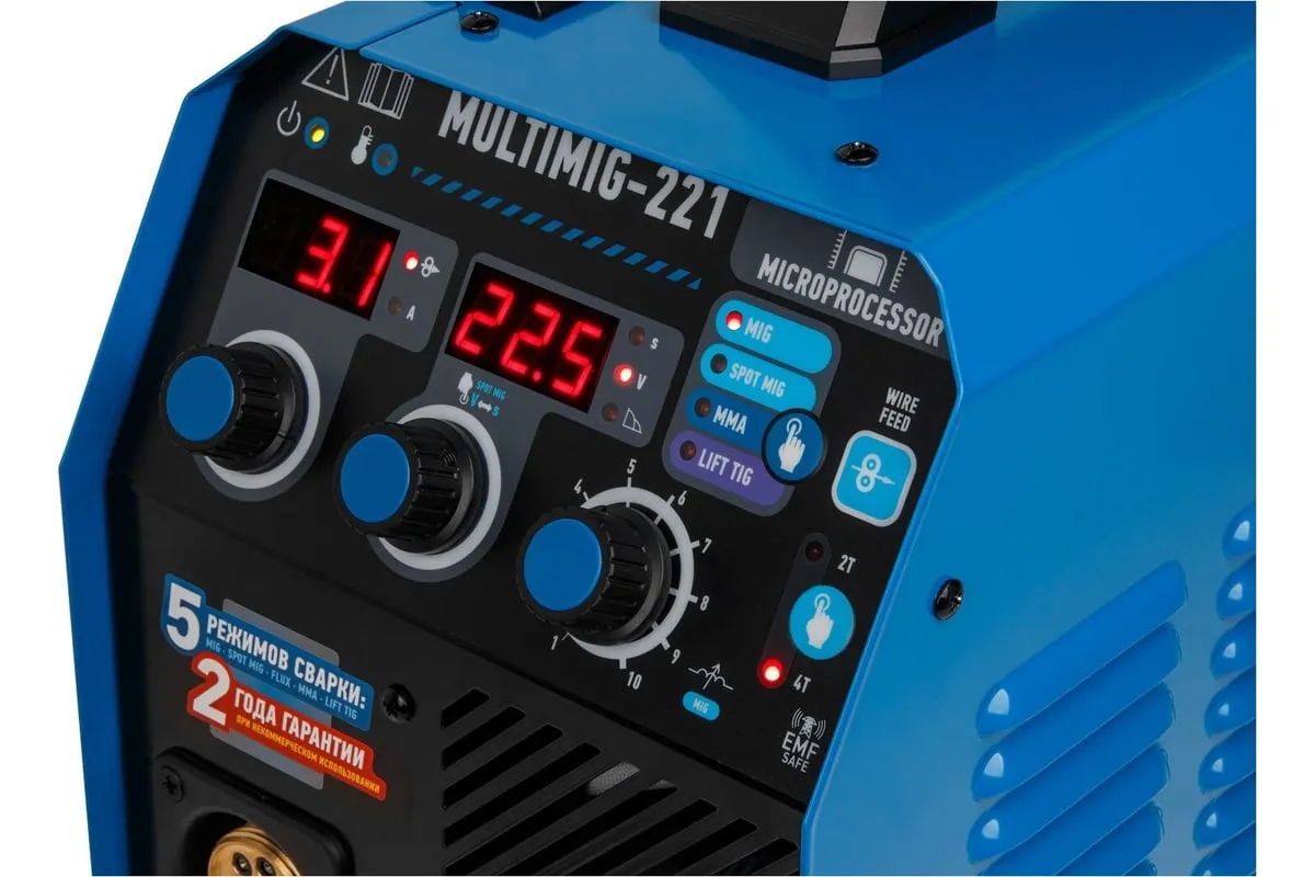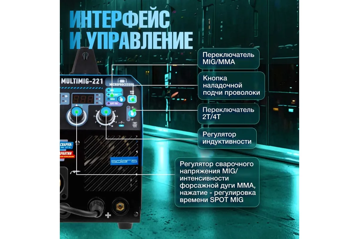 Сварочный полуавтомат SOLARIS MULTIMIG-221 предназначен для сварки проволокой в среде защитных газов (MIG/MAG) и ручной электродуговой сварки с применением плавких электродов (ММА) различных металлов. Микропроцессорное управление сварочным током обеспечивает отличные рабочие характеристики и оперативное подстраивание к любым условиям процесса и типам сварки. Аппарат работает на 4 IGBT-транзисторах, что обеспечивает его надежность и долговечность. Аппарат обеспечивает стабильную работу в сетях с пониженных напряжением от 160 В. На сварочном полуавтомате SOLARIS MULTIMIG-221 есть возможность сварки алюминия в режиме полуавтоматической сварки MIG, однако для этого понадобится алюминиевая сварочная проволока (приобретается дополнительно), а также дополнительные аксессуары (не входят в комплект поставки): специальный подающий ролик и горелку MIG с тефлоновым рукавом подачи проволоки. Внимание! Аппарат поставляется без вилки! В случае работы на максимальных токах, аппарат необходимо оснащать силовой однофазной вилкой 32 А 220 В.