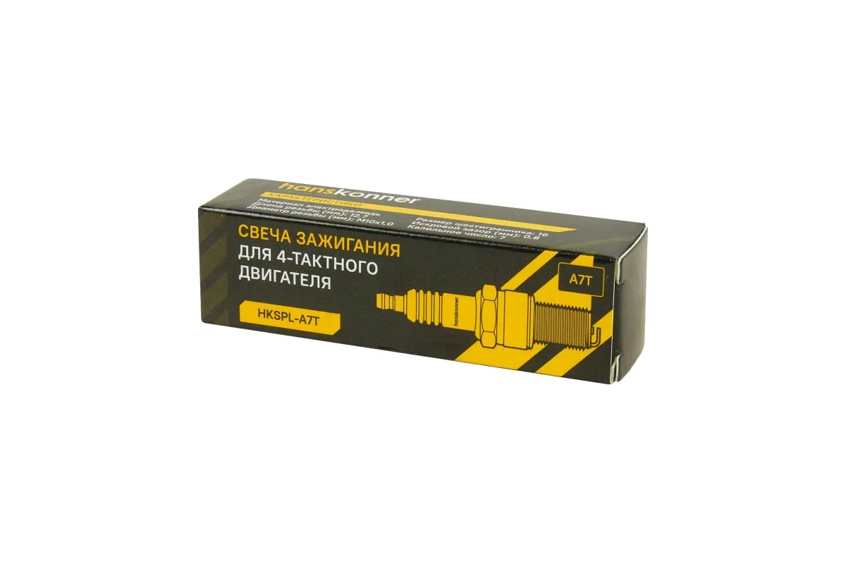 Свеча зажигания Hanskonner HKSPL-A7T предназначена для использования в 4-х тактных двигателях снегоуборщиков, генераторов, культиваторов, газонокосилок и другой бензиновой техники.
