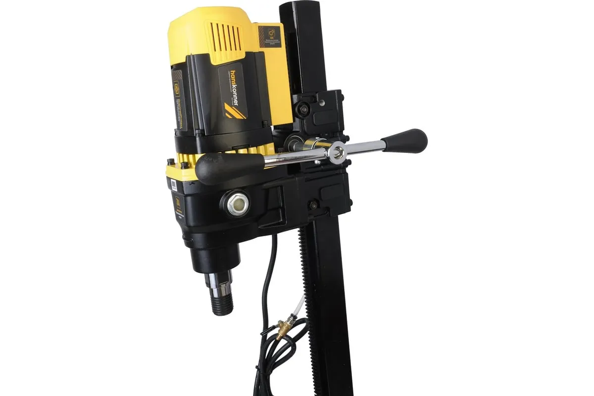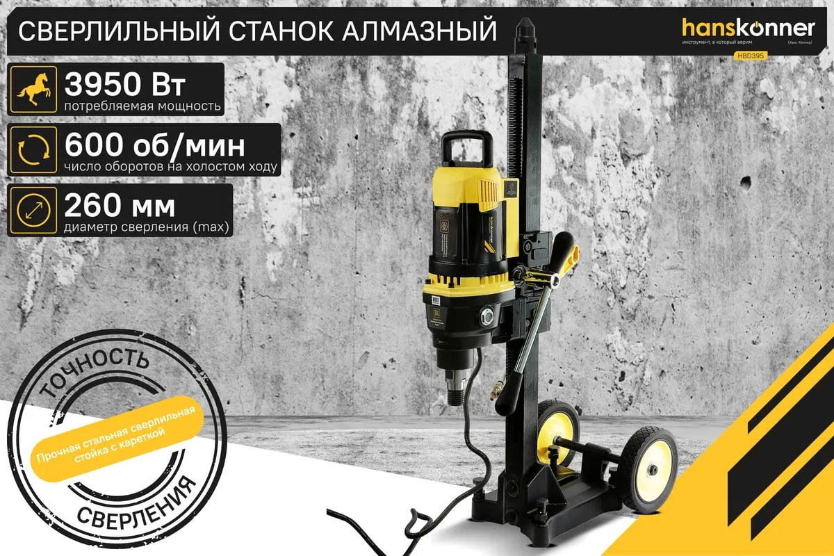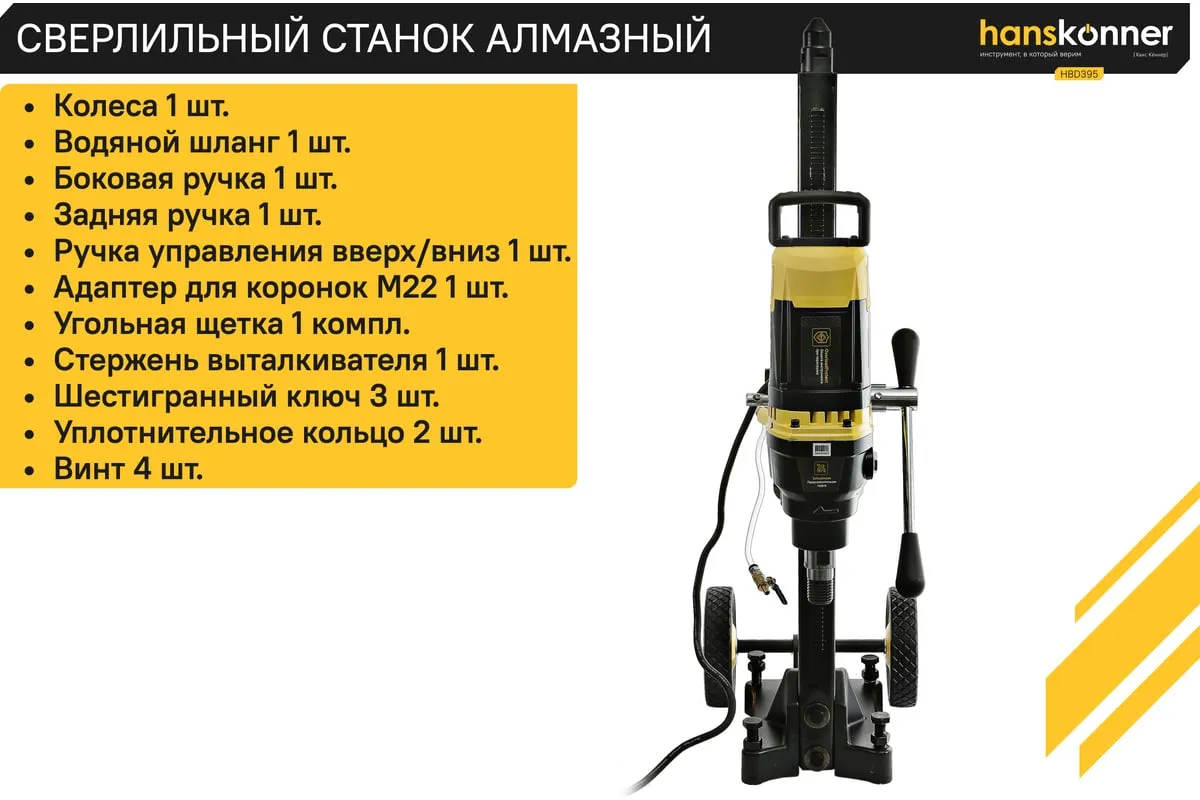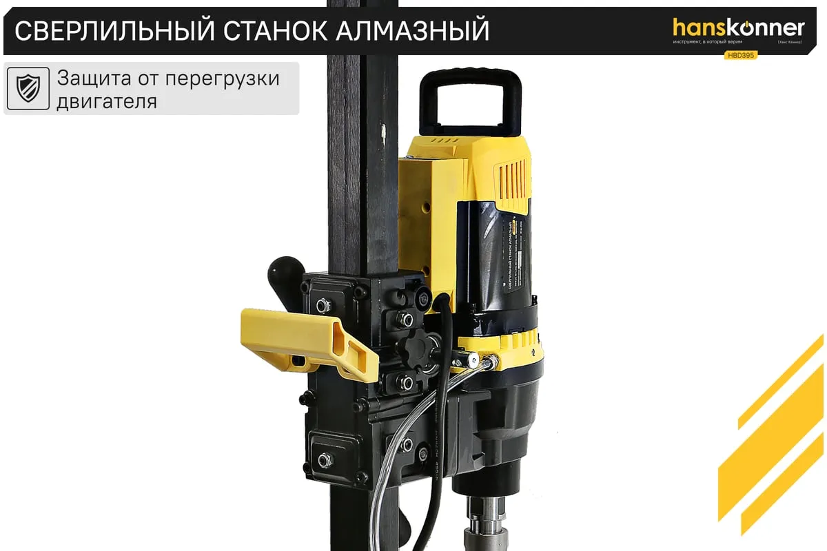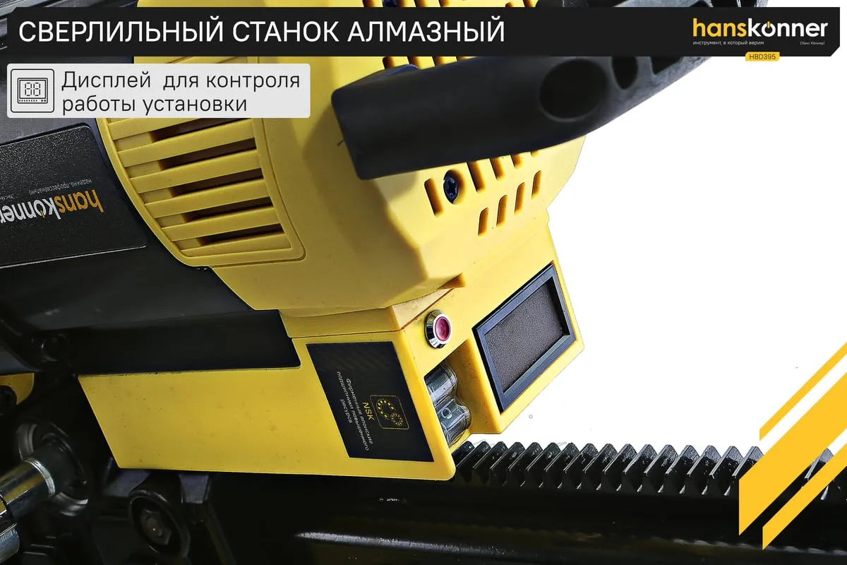 Станок алмазного сверления Hanskonner HBD395 — надежный и мощный электроинструмент для мокрого сверления алмазными коронками отверстий в таких материалах: бетон, железобетон, искусственный и натуральный камень, кирпич. Данная модель оснащена LCD дисплеем, что позволяет контролировать обороты и нагрузку во время выполнения работы. В случае заклинивания коронки сработает предохранительная муфта SafetyClutch и предотвратит поломку механизмов и двигателя, при других видах перегруженности важна встроенная термозащита OverloadProtect, которая отключит машину ввиду возникшей необходимости. Применение в конструкции фирменных японских подшипников NSK повышенного ресурса способствует исправной и долговечной эксплуатации электроинструмента. Удобству в практическом обращении с машиной содействует адаптер алмазных коронок и прочная стальная сверлильная стойка, идущие в комплекте.Морозостойкий резиновый сетевой кабель длинной 4 м.