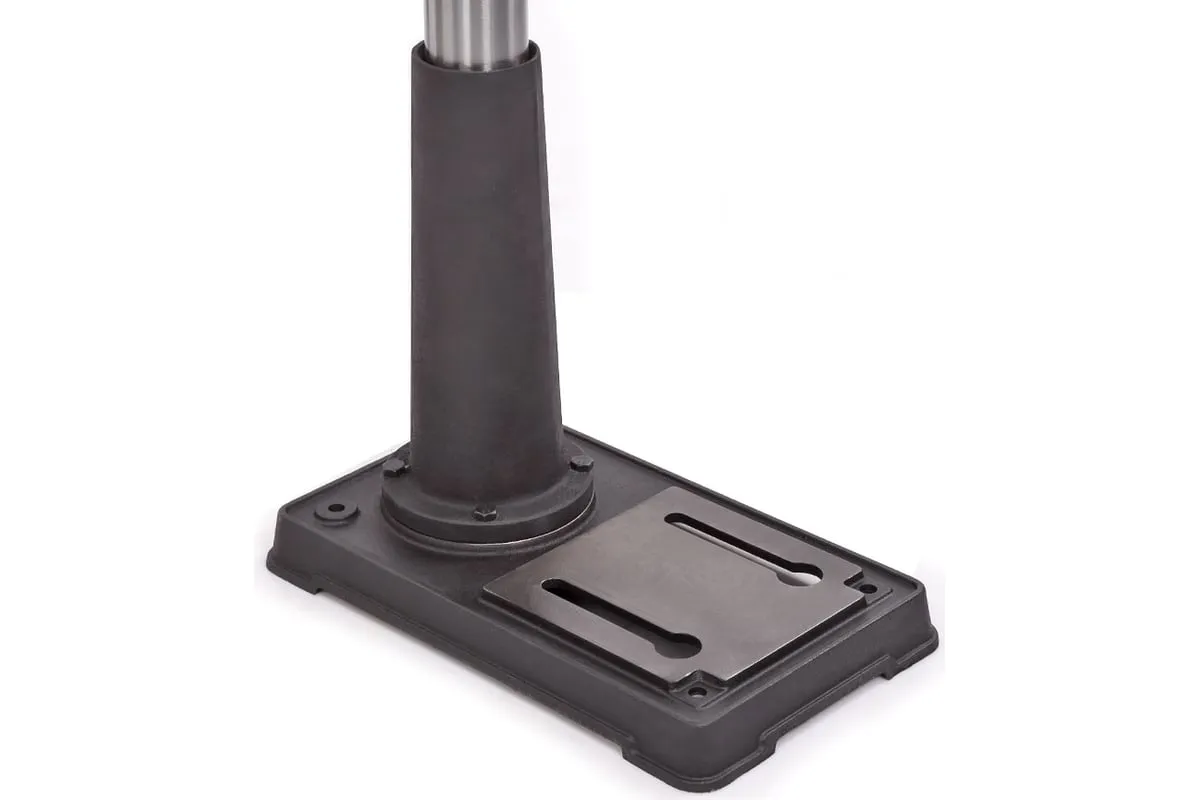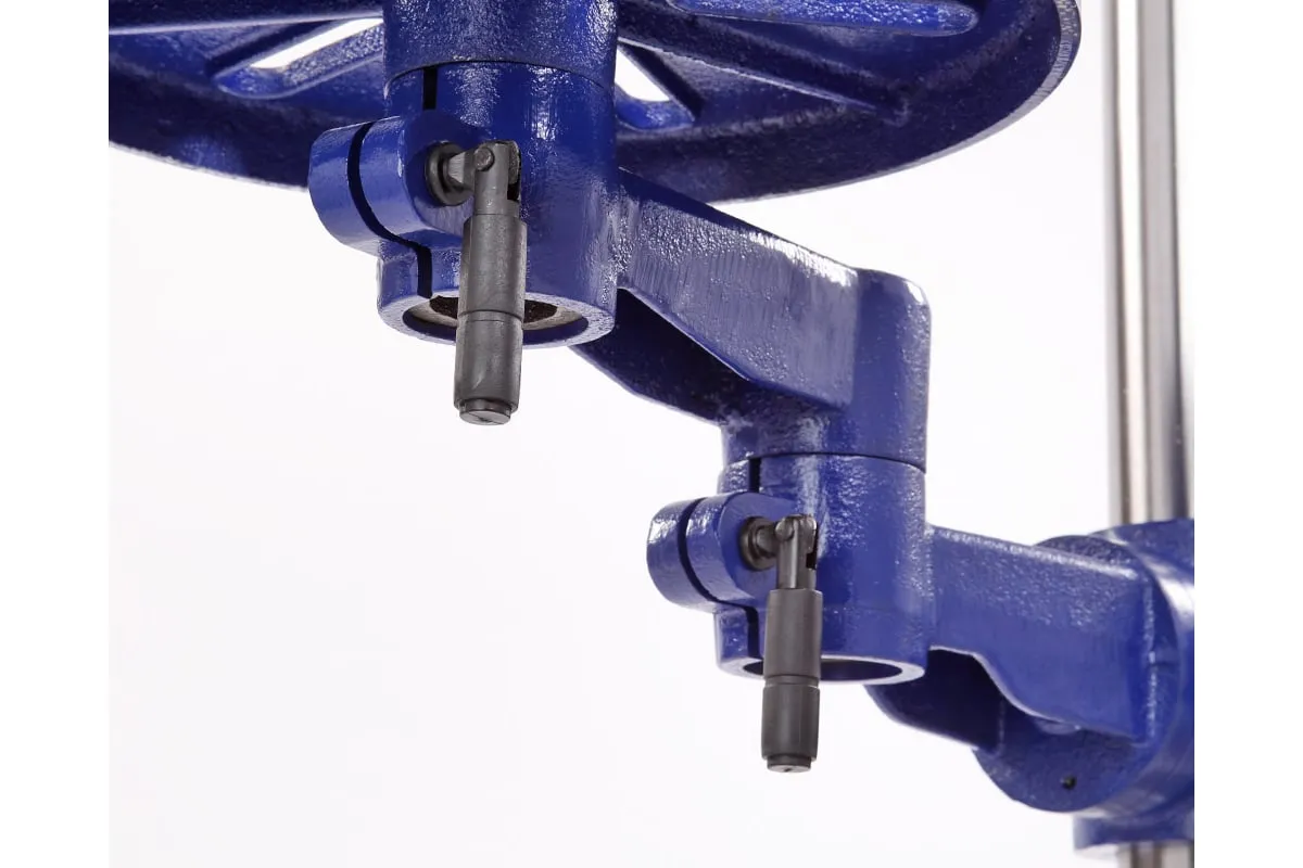 На стойке расположена зубчатая рейка, поднятие и опускание стола настраивается при помощи рукоятки. В опоре есть два монтажных отверстия для установки на верстак. Тиски (в комплекте) крепятся через специальные пазы на рабочем столе (6 шт.) и основании (2 шт.).