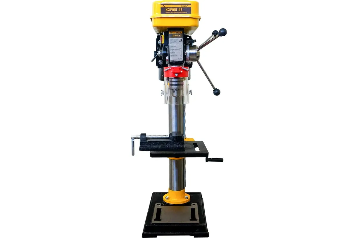 Сверлильный станок с тисками Энкор Корвет-47 90470 используется в столярном производстве или в частных домах для сверления или снятия в заготовках из древесины, деревосодержащих материалах (ДСП, ДВП), а также в металле и пластике. Экономичный электродвигатель не вызывает перегрузок в сети бытового электроснабжения. Малые габариты станка позволяют разместить его на рабочем столе или верстаке. Ременная передача снижает уровень шума при работе. Двенадцать скоростей вращения шпинделя обеспечивают оптимальный подход к обработке.