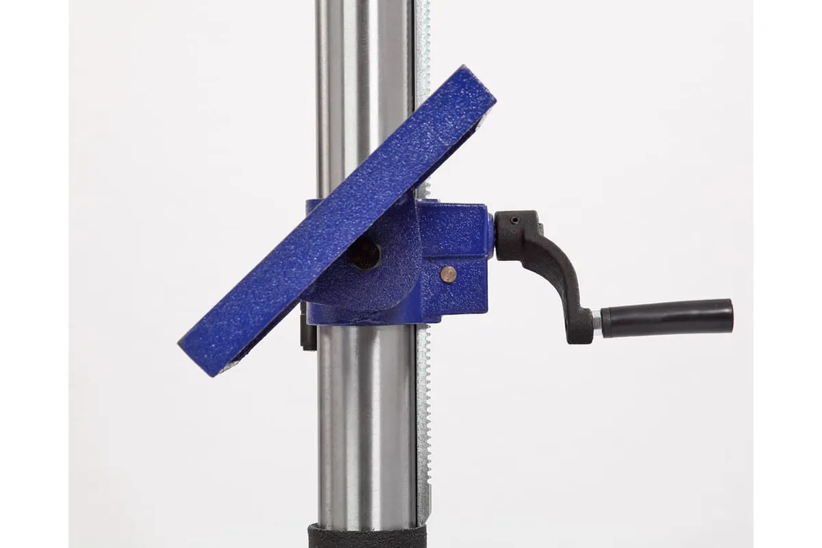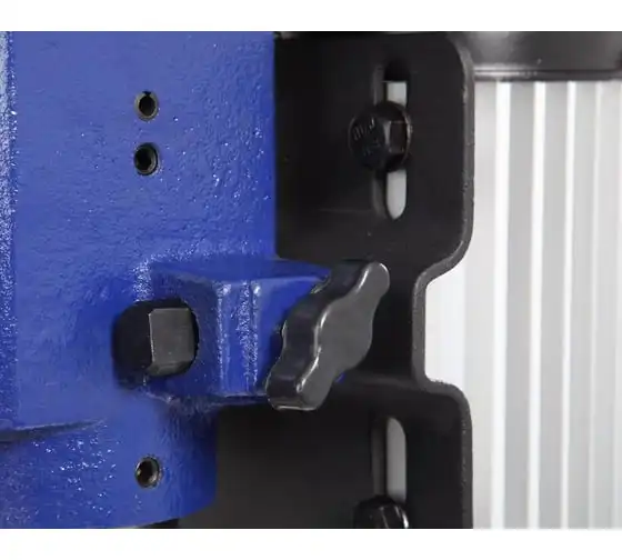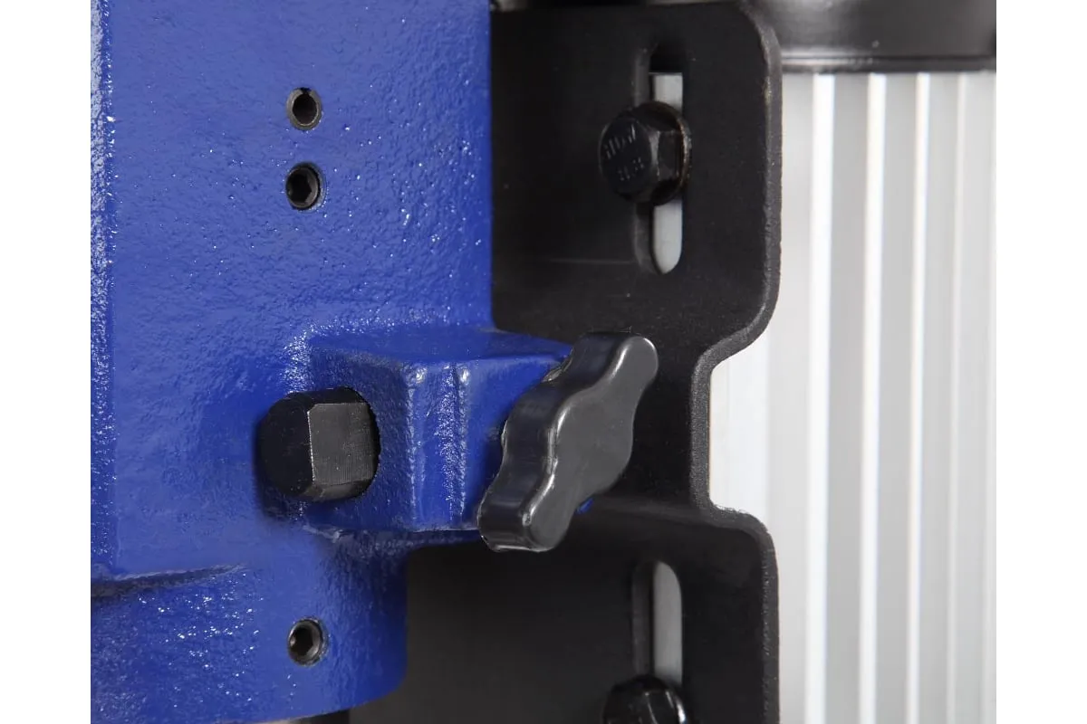 На стойке находится зубчатая рейка, поднятие и опускание стола регулируется с помощью рукоятки. В опоре есть два монтажных отверстия для установки на верстак. Тиски (в комплекте) крепятся через два паза на рабочем столе или основании.