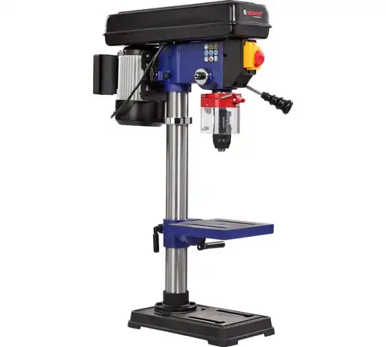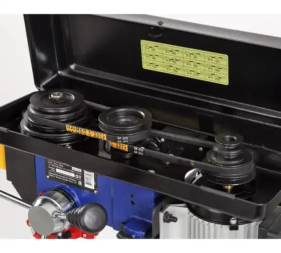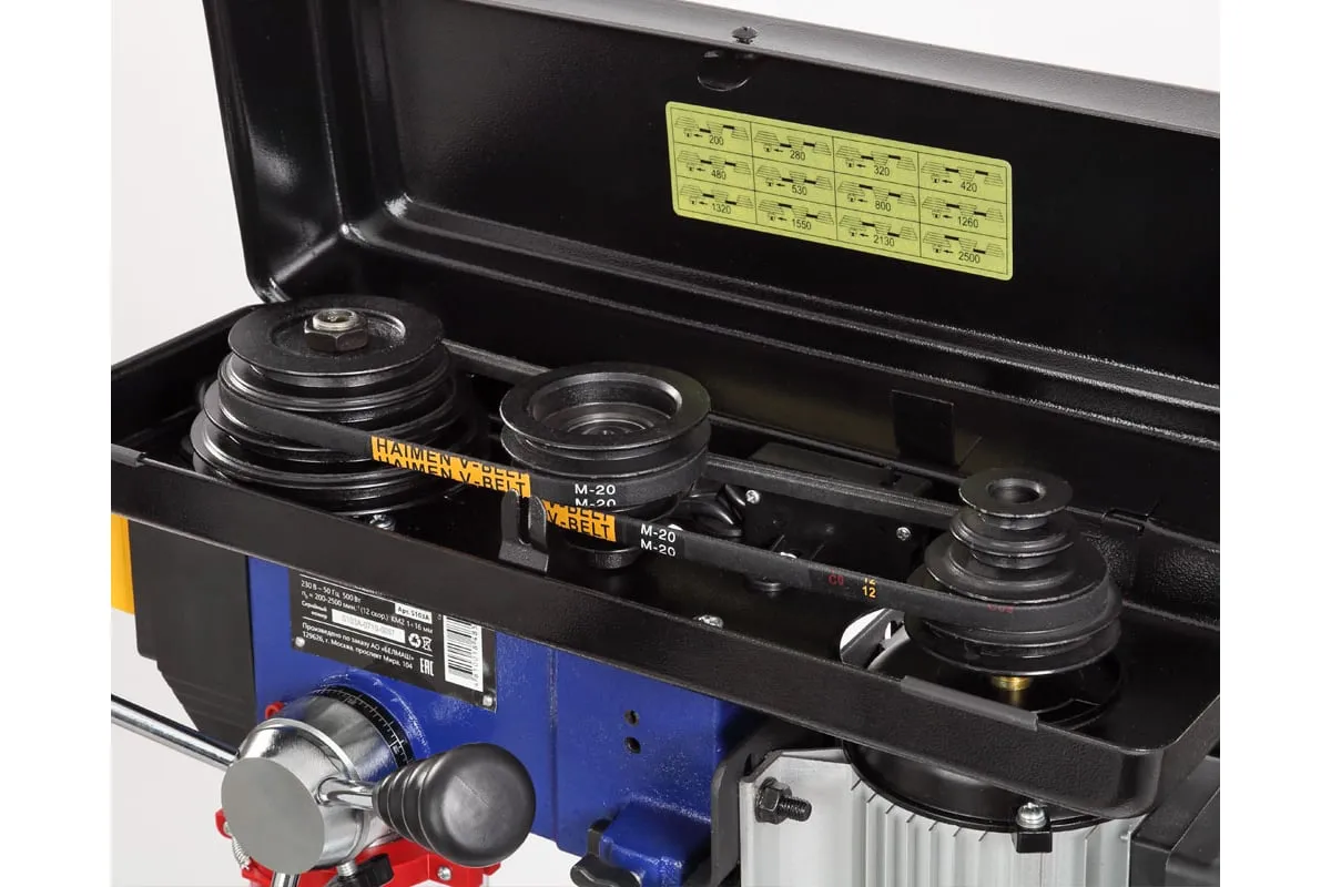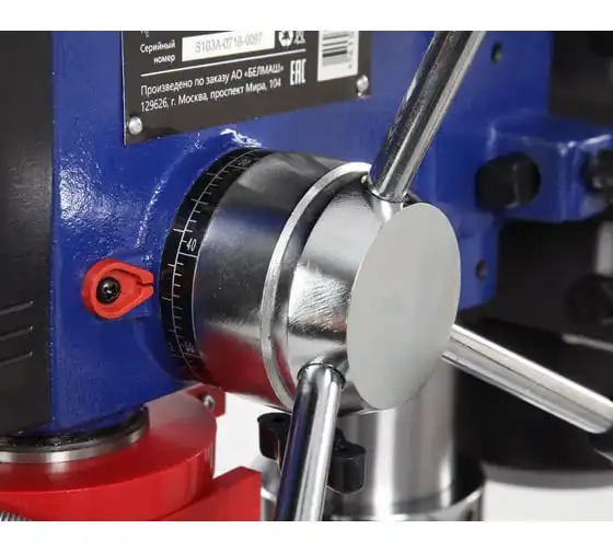 Скорость вращения шпинделя переключается при помощи переброски ремня. Заготовку можно закрепить на рабочем столе или основании в зависимости от ее размеров. Шкала с левой стороны от выключателя указывает на ход пиноли шпинделя.