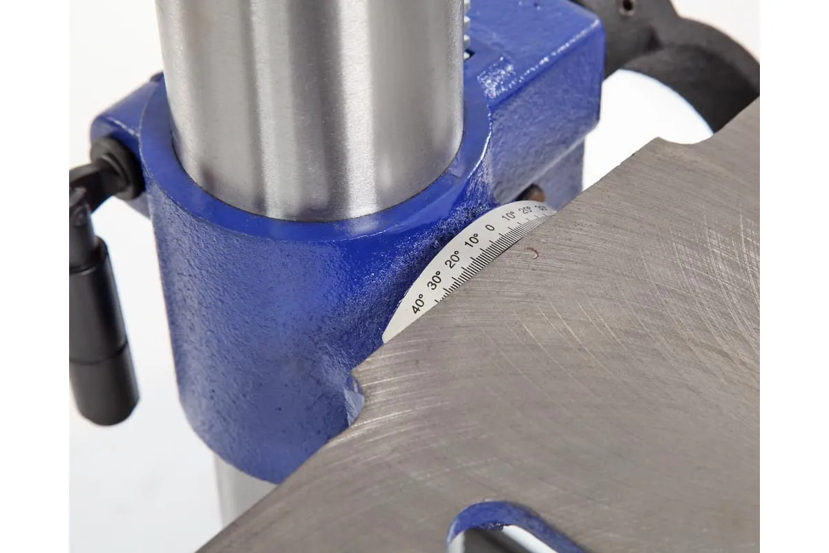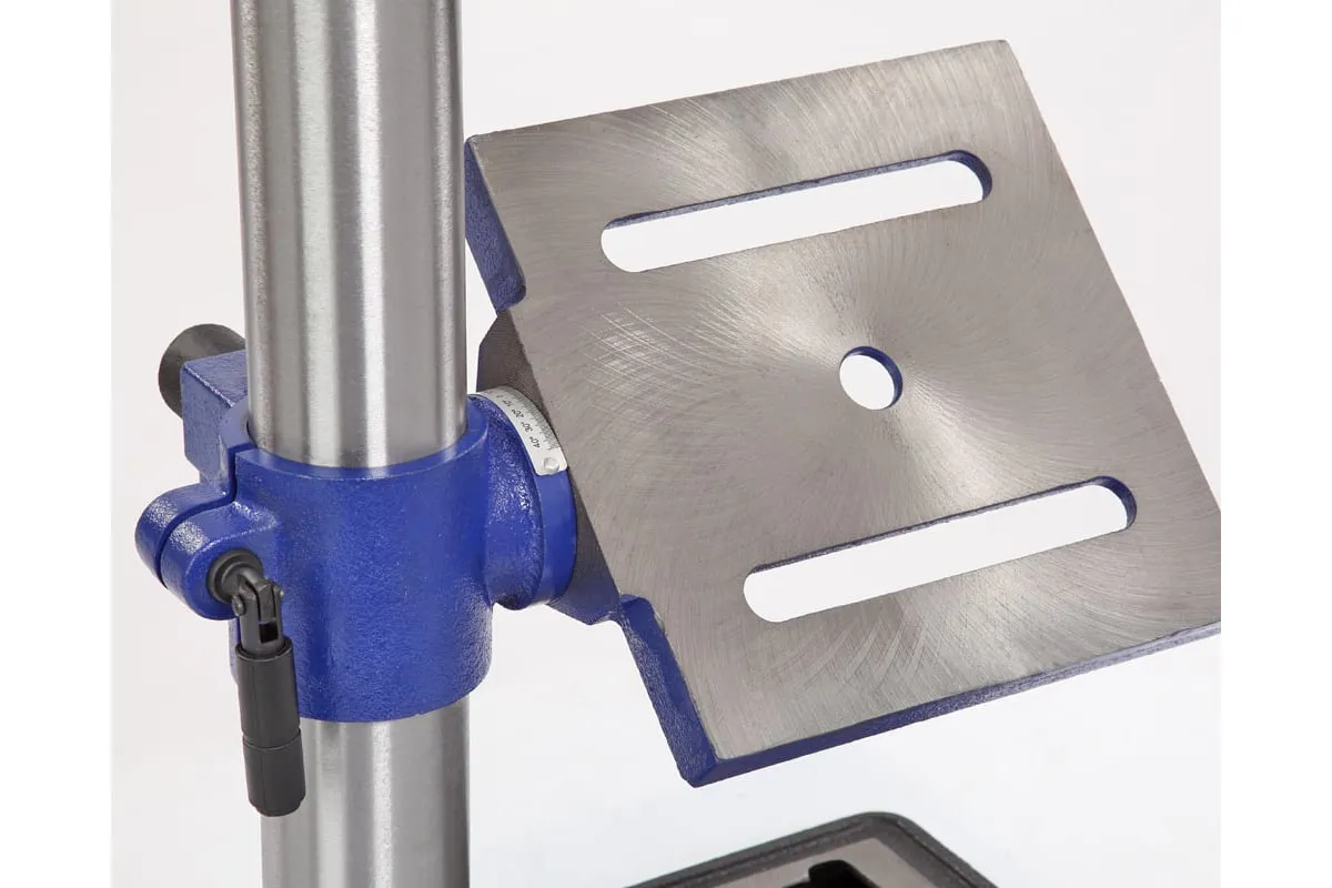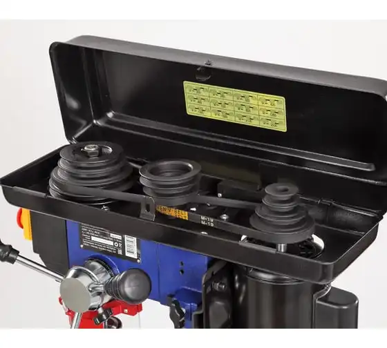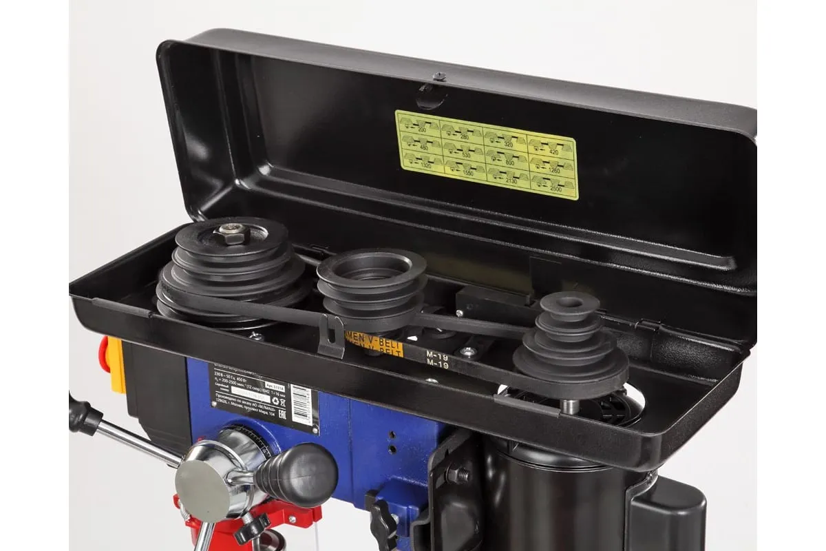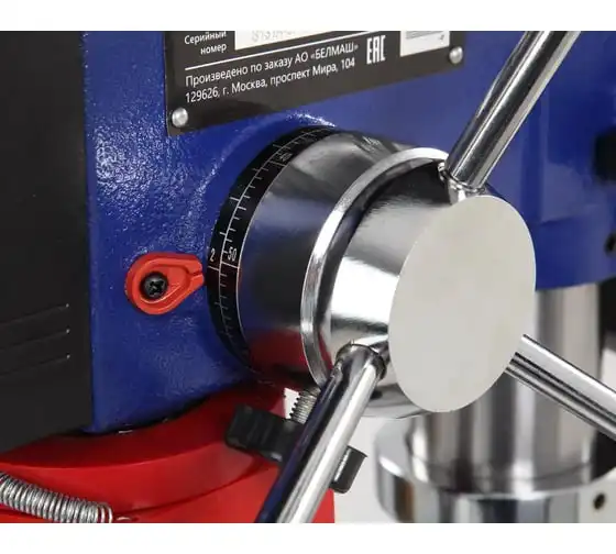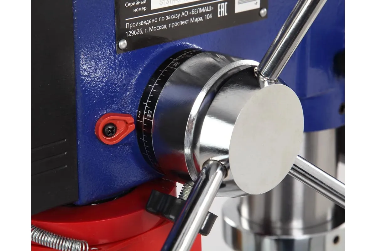Наклон стола регулируется от -45º до +45º, поднятие и опускание настраивается с помощью рукоятки. Для выполнения различных операций предусмотрено 12 ступеней скорости вращения шпинделя, переключение происходит за счет переброски ремней.