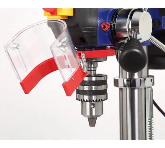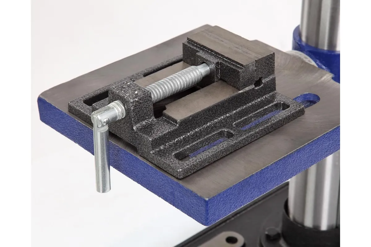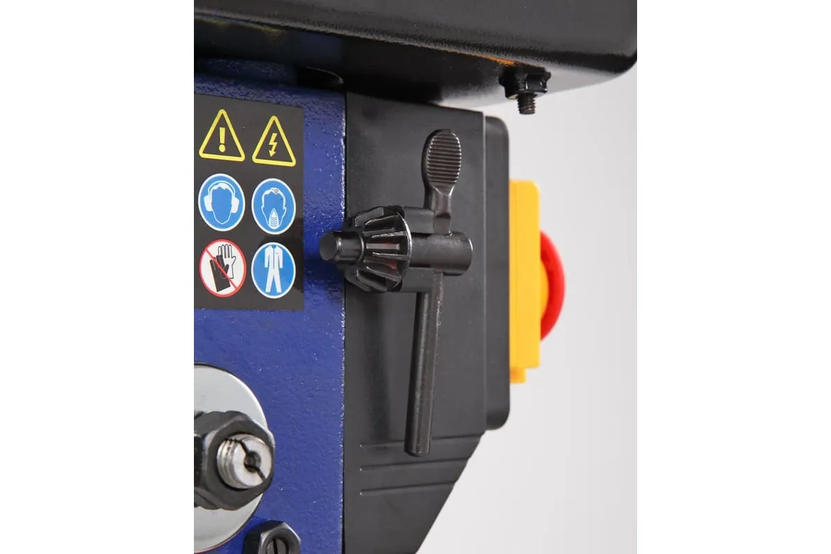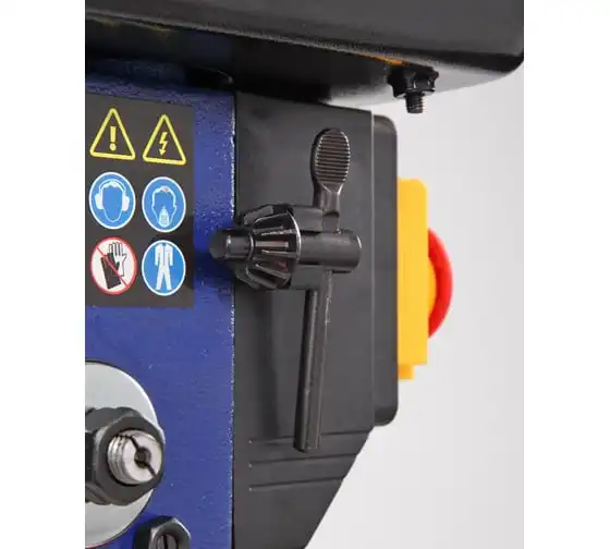Управление станком осуществляется двумя кнопками, выключатель снабжен защитной крышкой. Рабочий стол и основание оборудования оснащены пазами для крепления тисков (идут в комплекте).
