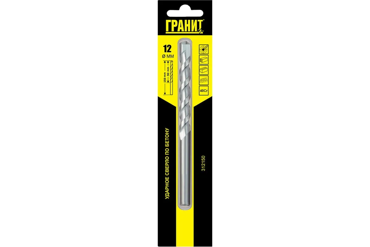 Сверло по бетону ГРАНИТ 312150 предназначено для ударных дрелей. Применяется для выполнения сквозных и глухих отверстий в бетоне и кирпиче. Наконечник сверла оснащен твердосплавной вставкой.