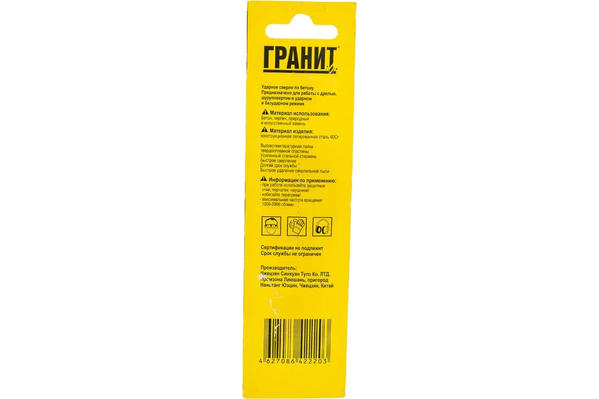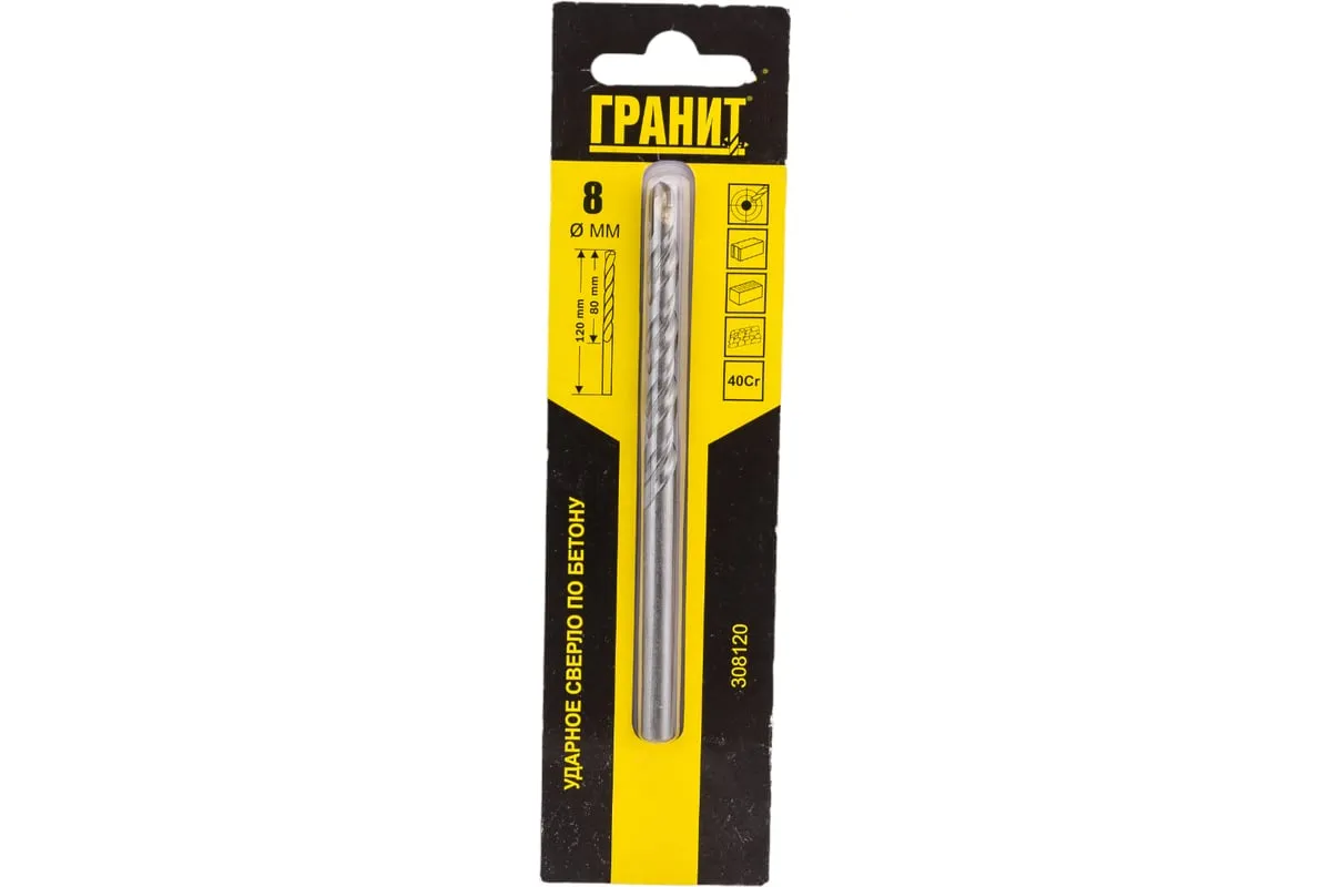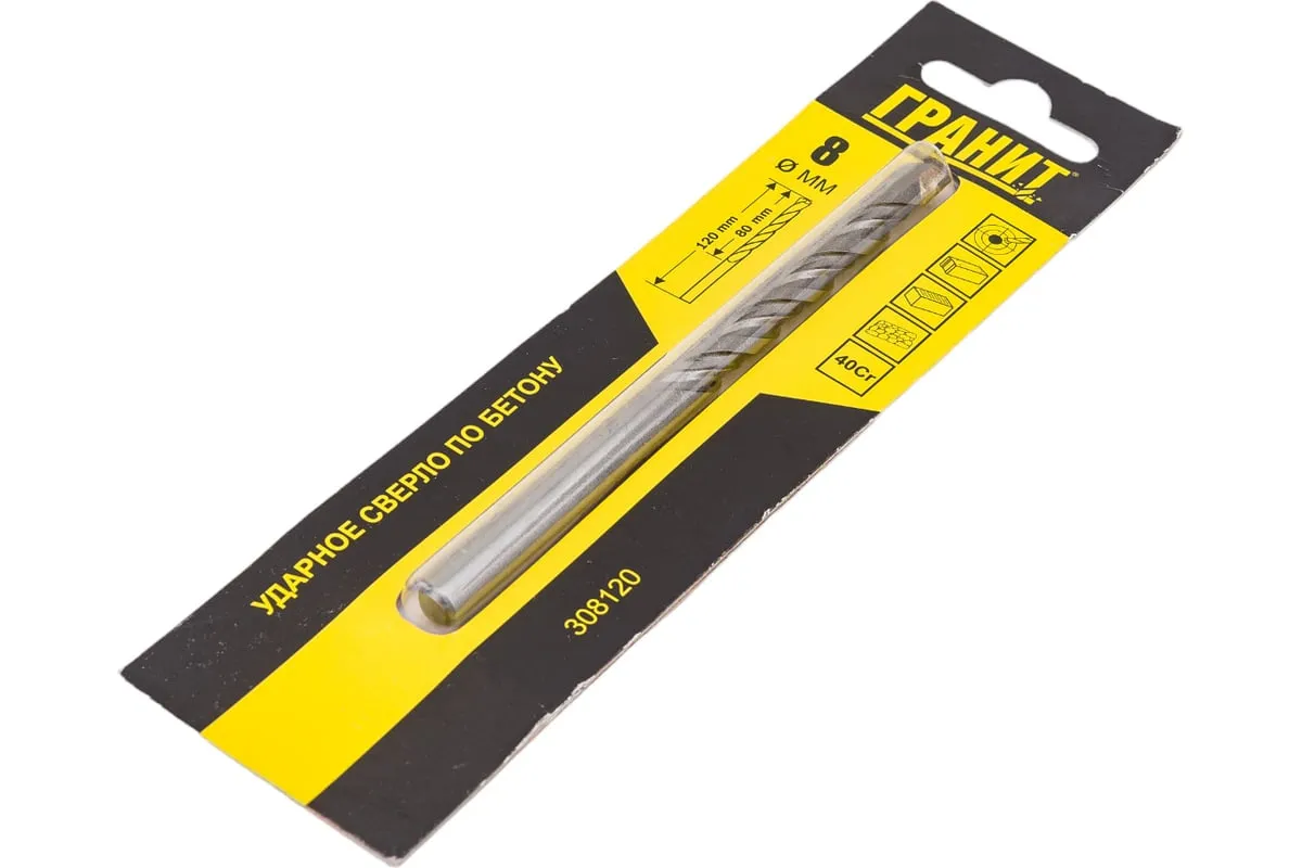 Сверло по бетону ГРАНИТ 308120 предназначено для ударных дрелей. Применяется для выполнения сквозных и глухих отверстий в бетоне и кирпиче. Наконечник сверла оснащен твердосплавной вставкой.