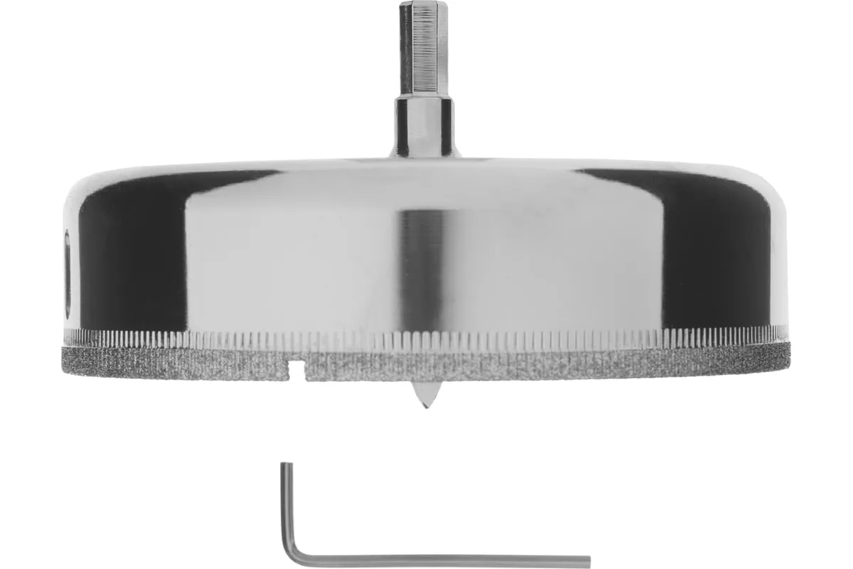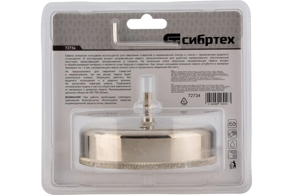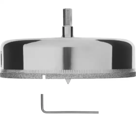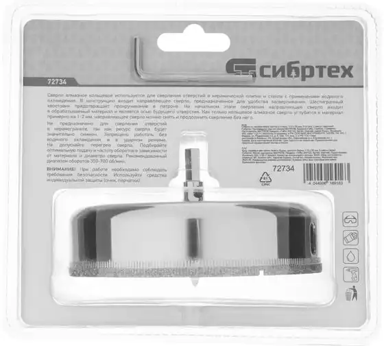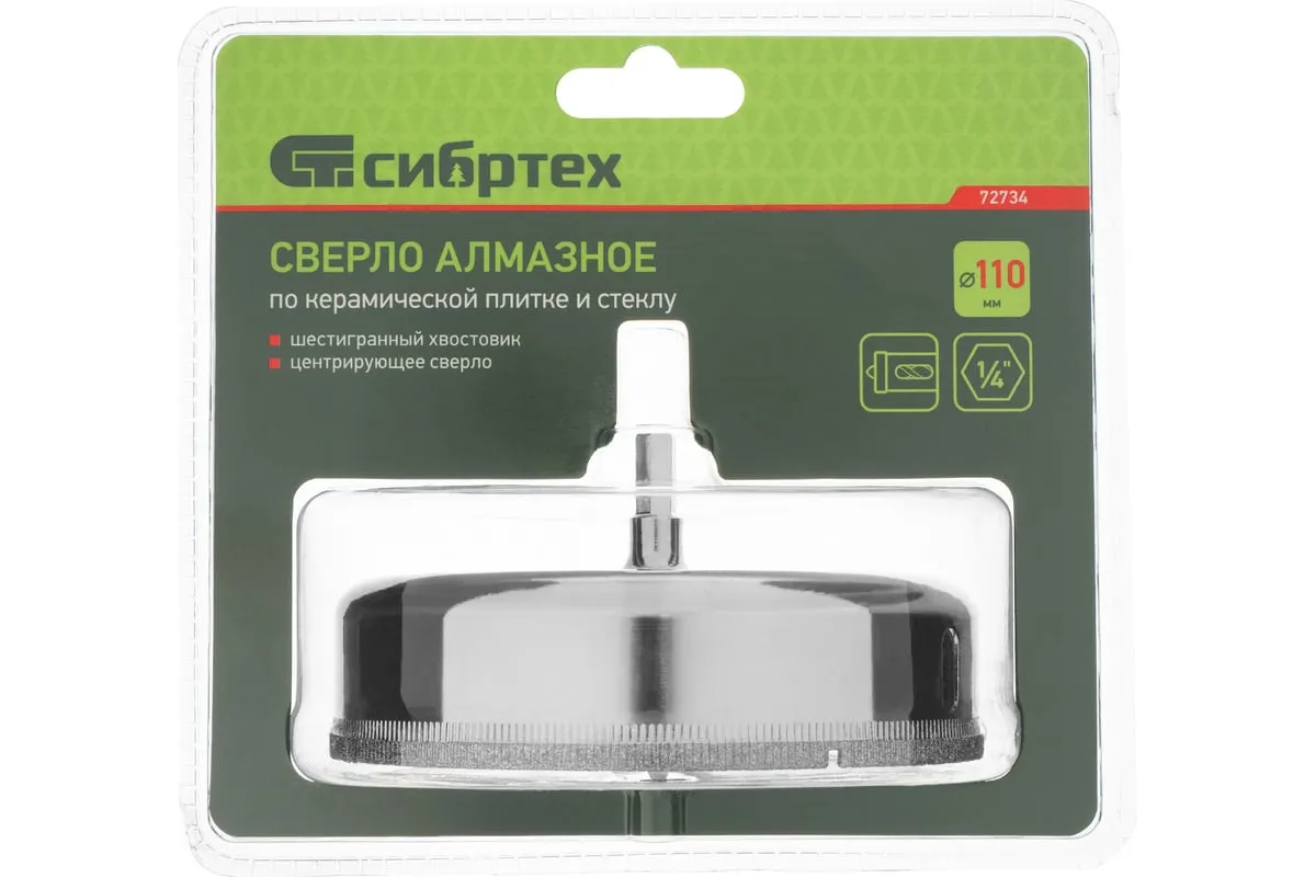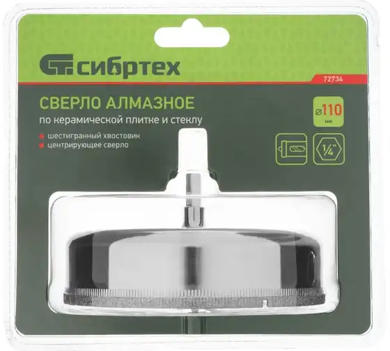 Сверло Сибртех 72734, 110 х 55 м, с 6-гранным хвостовиком и центрирующим сверлом позволяет сверлить отверстия в керамической плитке и стекле. Его устанавливают на дрель или шуруповерт, рекомендуемый диапазон рабочих оборотов 350-700 об/мин. Благодаря 6-гранному хвостовику сверло не проворачивается в патроне электроинструмента. После заглубления алмазной коронки на 1-2 мм рекомендуется снять центрирующее сверло, это поможет увеличить его ресурс. Применение водяного охлаждения значительно повышает срок службы оснастки. Ее используют при выполнении бытовых ремонтных и отделочных работ.