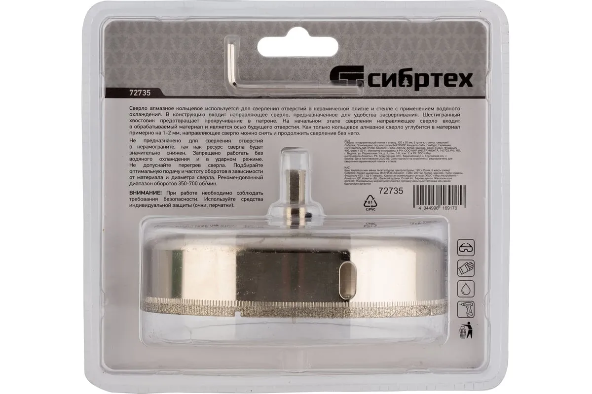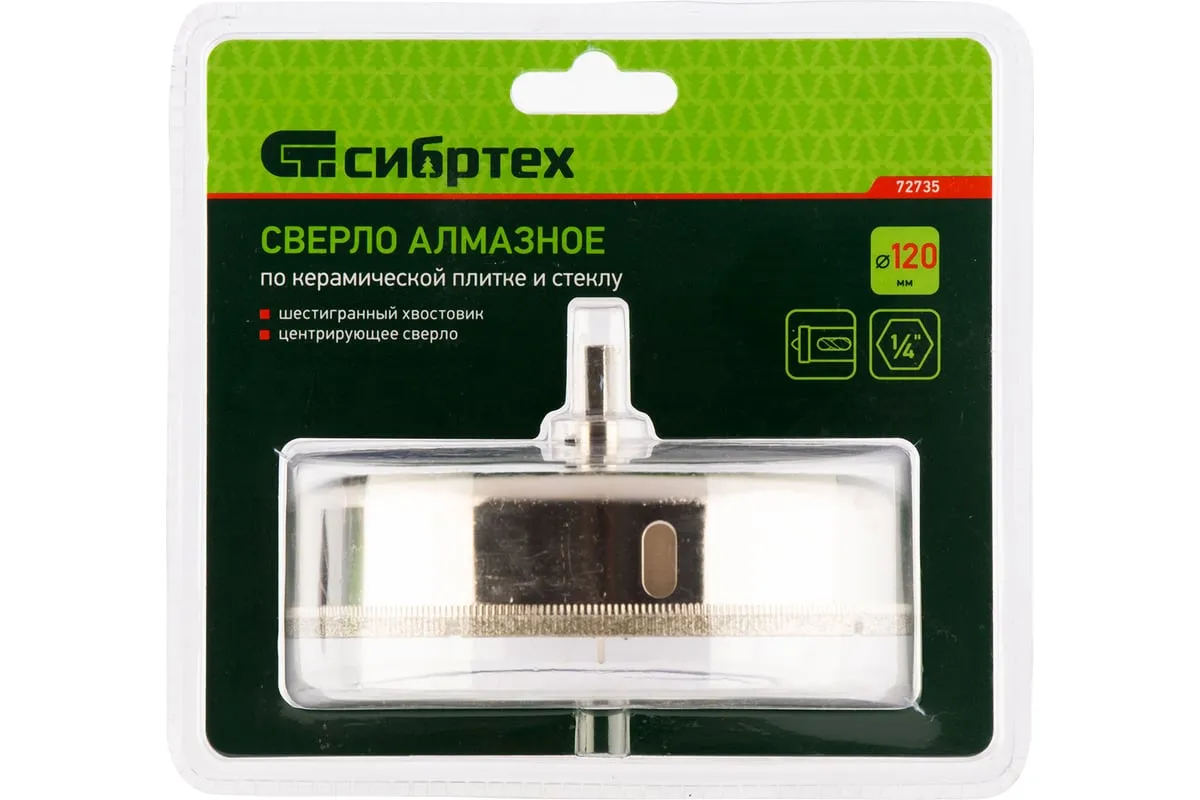 Сверло Сибртех 72735, 120 х 55 м, с 6-гранным хвостовиком и центрирующим сверлом позволяет сверлить отверстия в керамической плитке и стекле. Его устанавливают на дрель или шуруповерт, рекомендуемый диапазон рабочих оборотов 350-700 об/мин. Благодаря 6-гранному хвостовику сверло не проворачивается в патроне электроинструмента. После заглубления алмазной коронки на 1-2 мм рекомендуется снять центрирующее сверло, это поможет увеличить его ресурс. Применение водяного охлаждения значительно повышает срок службы оснастки. Ее используют при выполнении бытовых ремонтных и отделочных работ.