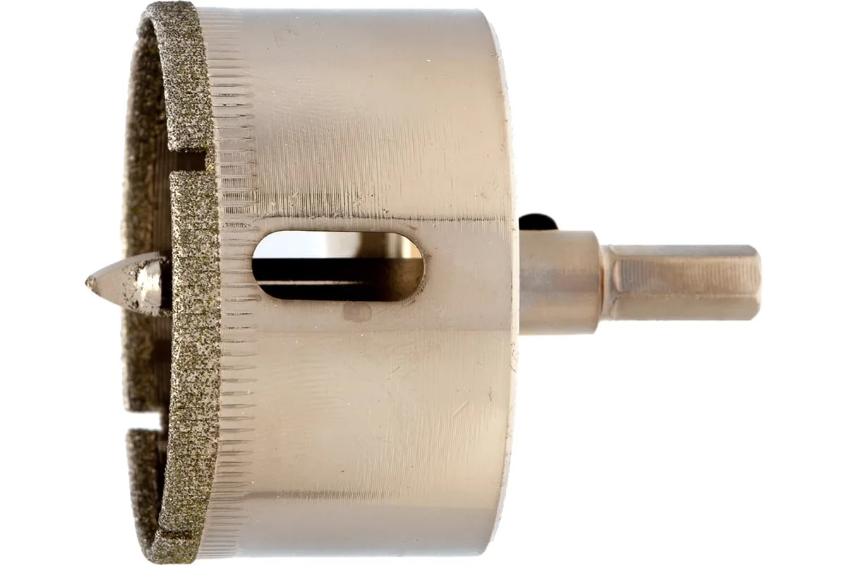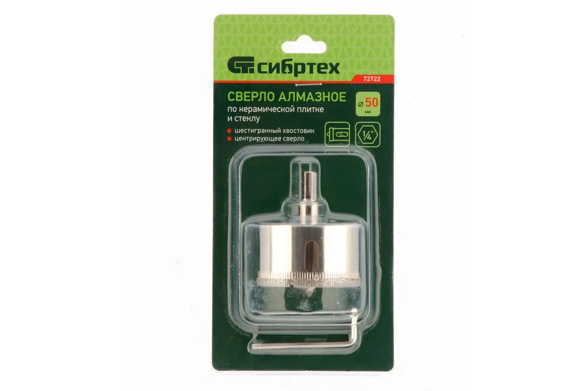 Сверло Сибртех 72722, 50 х 55 м, с 6-гранным хвостовиком и центрирующим сверлом позволяет сверлить отверстия в керамической плитке и стекле. Его устанавливают на дрель или шуруповерт, рекомендуемый диапазон рабочих оборотов 350-700 об/мин. Благодаря 6-гранному хвостовику сверло не проворачивается в патроне электроинструмента. После заглубления алмазной коронки на 1-2 мм рекомендуется снять центрирующее сверло, это поможет увеличить его ресурс. Применение водяного охлаждения значительно повышает срок службы оснастки. Ее используют при выполнении бытовых ремонтных и отделочных работ.