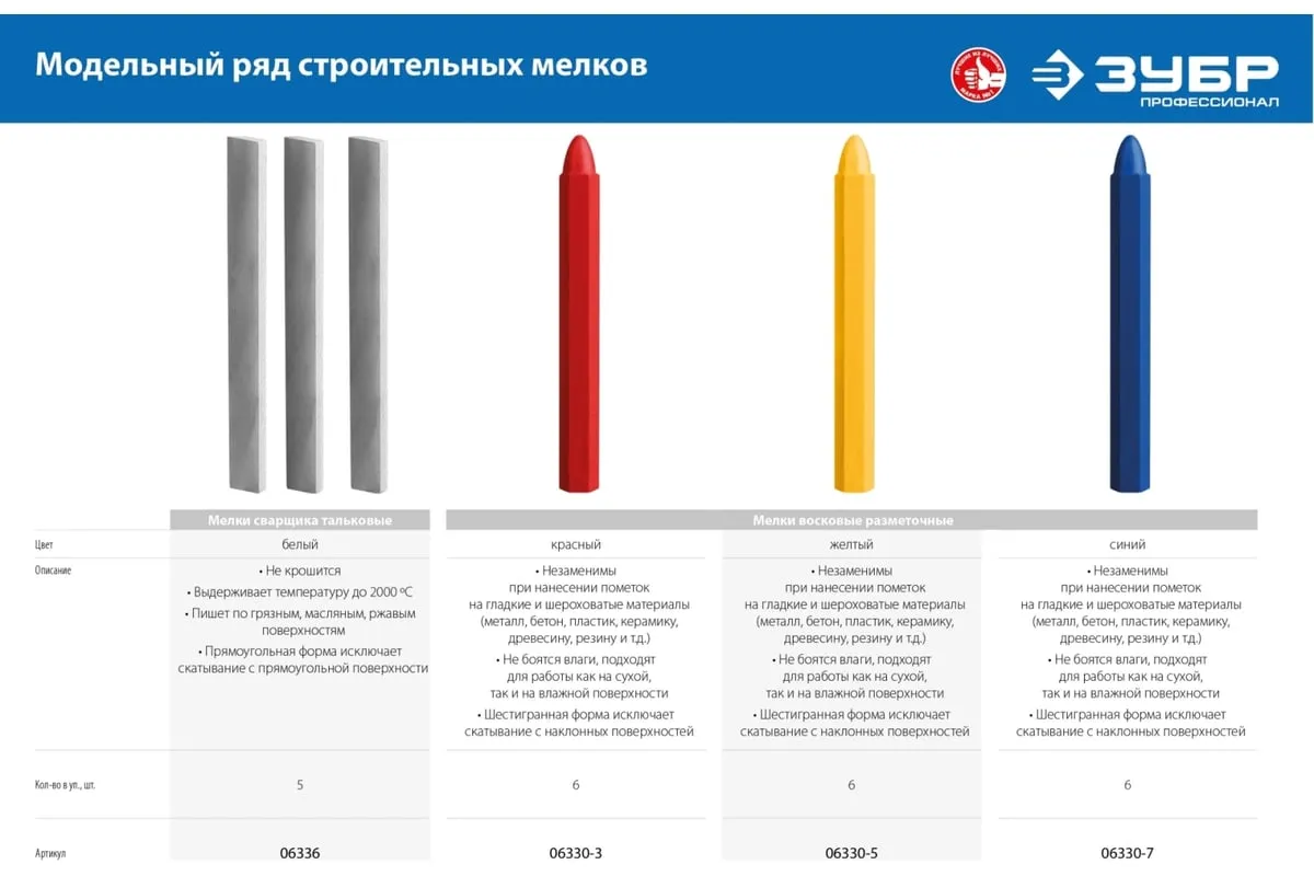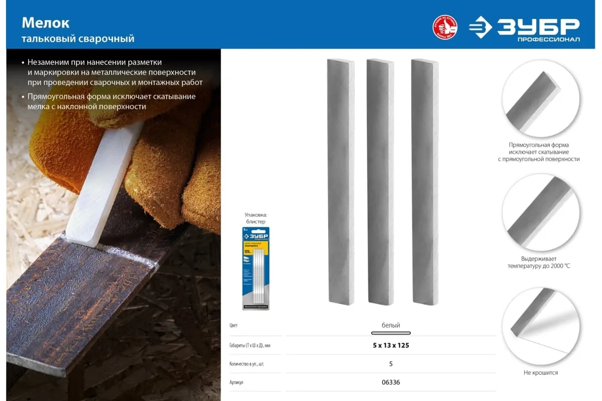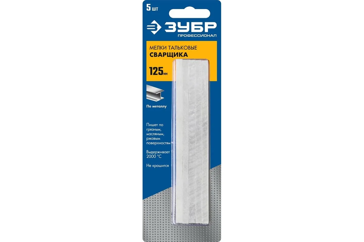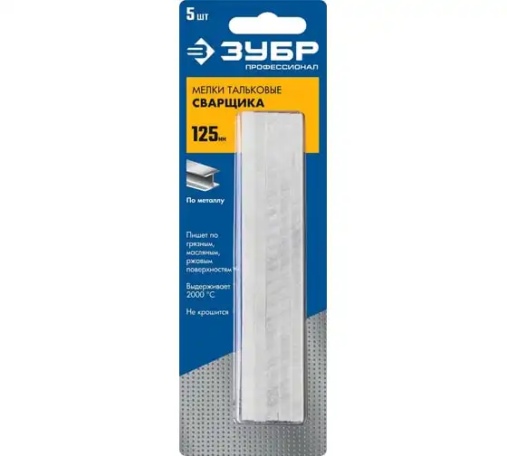 Тальковые мелки сварщика ЗУБР 5 шт 06336 предназначены для сварочных работ. Мелки на тальковой основе служат для нанесения маркировки на нагретую поверхность и изделия из металлов перед их нагреванием или сваркой. Позволяют расчертить ржавые и грязные поверхности. Мелки не выгорают во время сварки.
