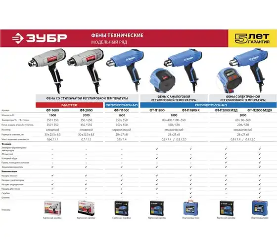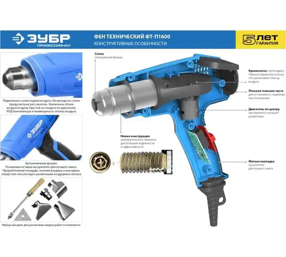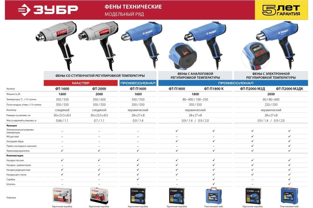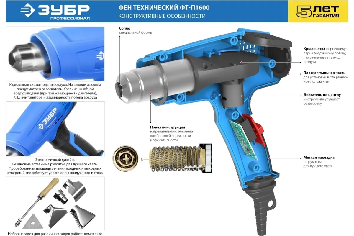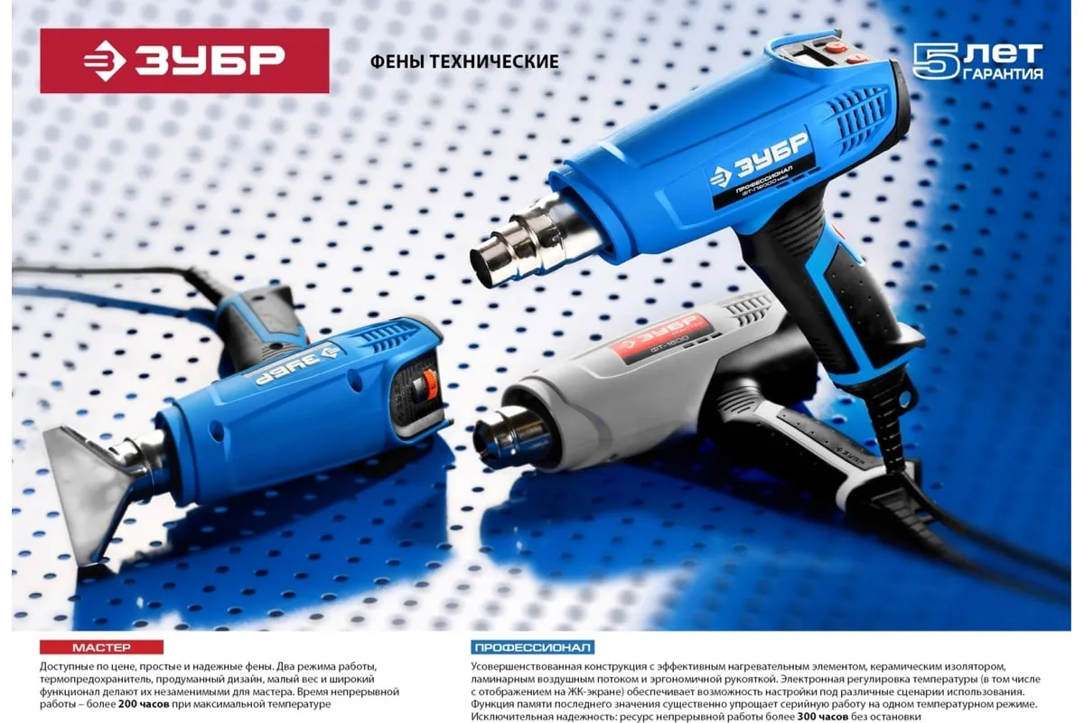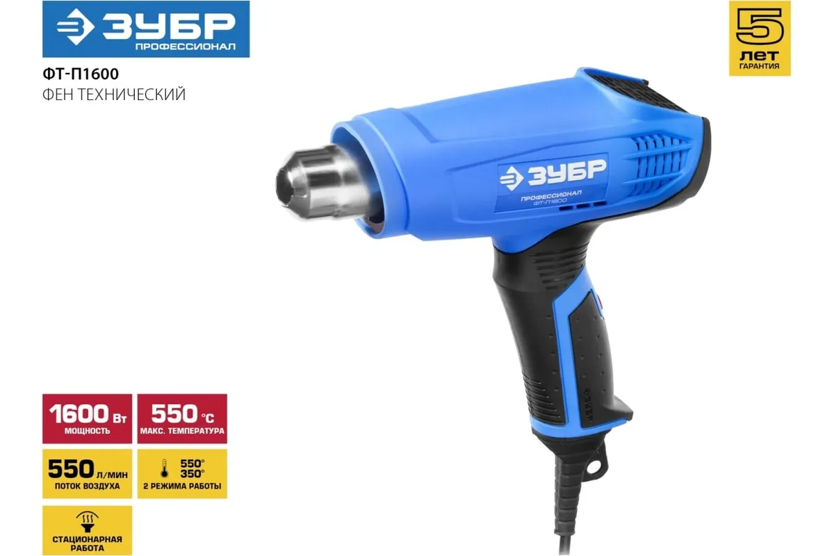 Технический фен ЗУБР Профессионал ФТ-П1600 используется для сушки клеевых соединений, снятия лакокрасочных покрытий и прочего. Модель имеет два режима температуры и скорости потока воздуха для решения различных возникающих задач. В комплект входят 4 насадки, что позволяет приступать к работе сразу после покупки инструмента.