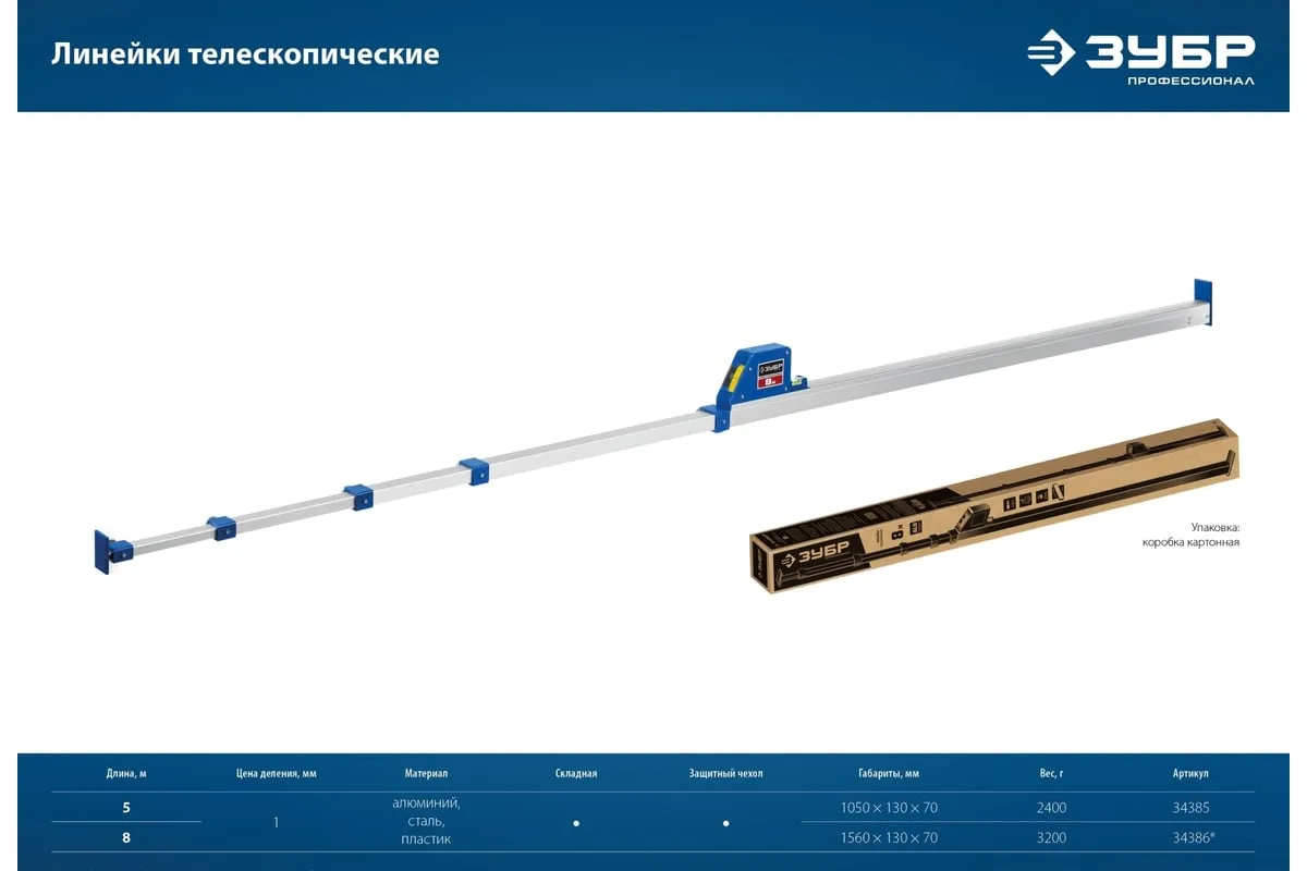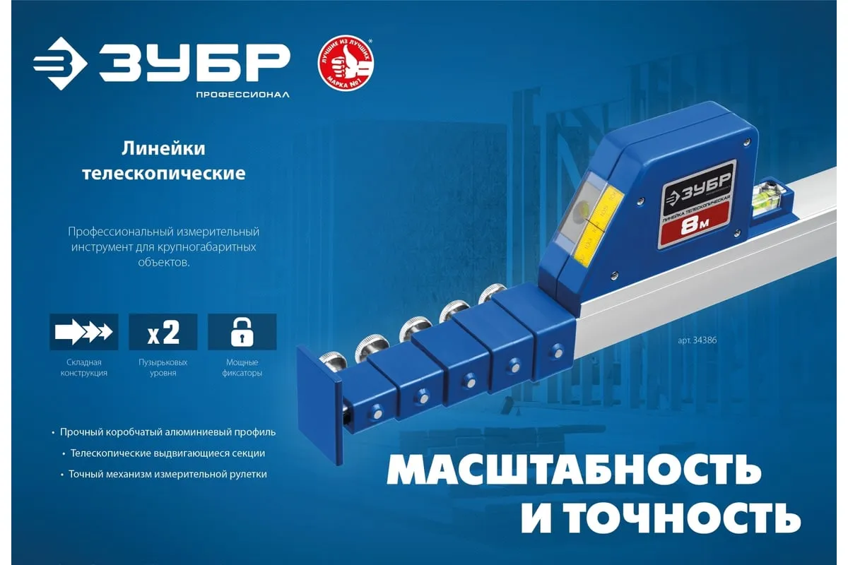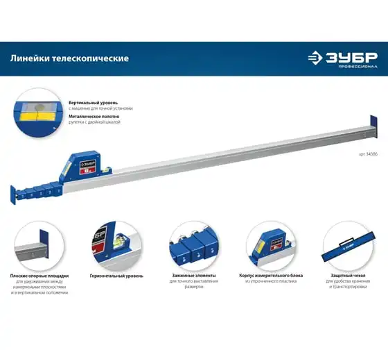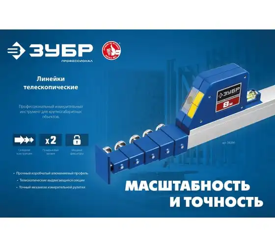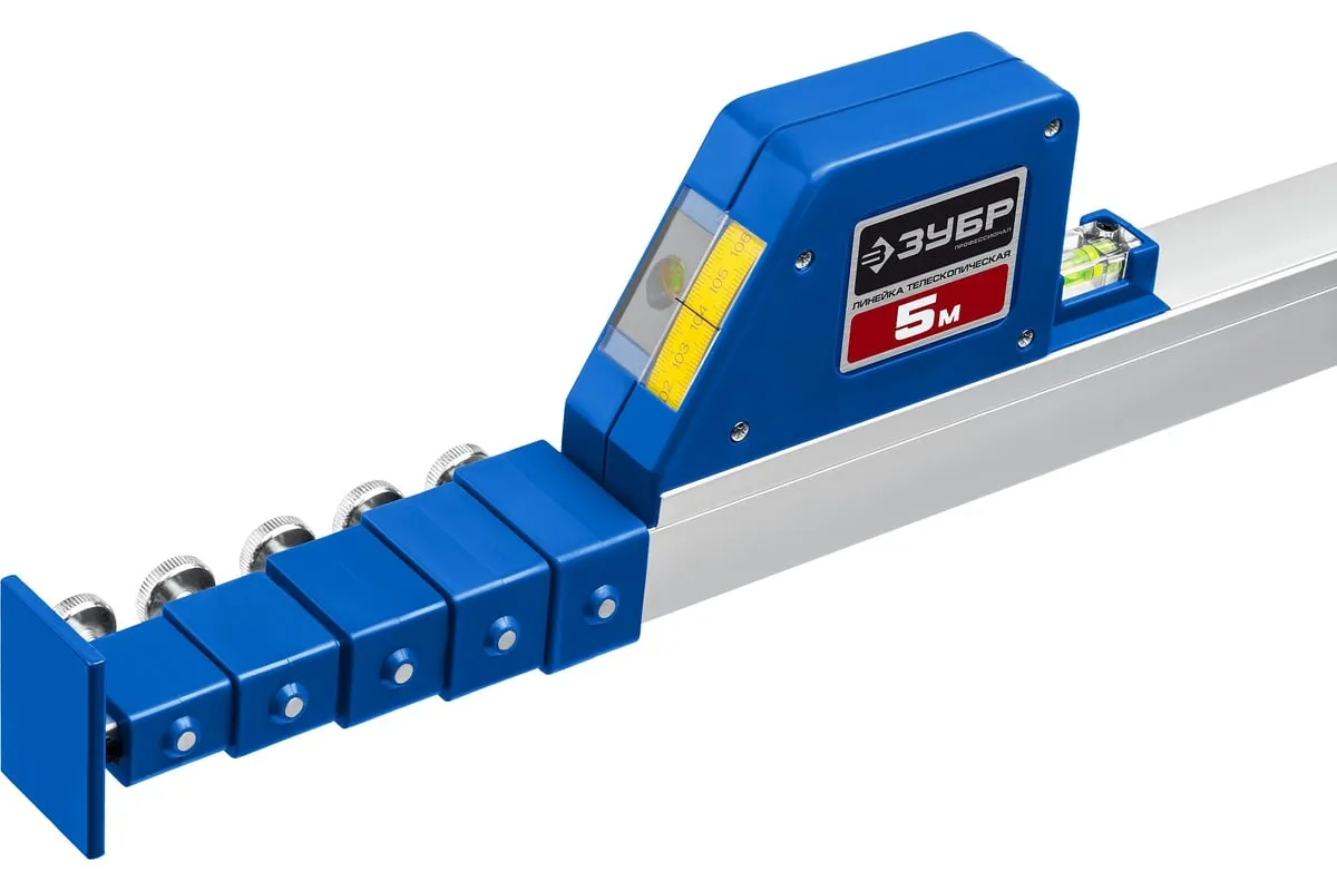 Телескопическая линейка предназначена для точных измерений и контроля линейных размеров между элементами конструкций, дверных проёмов, разметки помещения при монтаже и изготовлении окон и офисных перегородок. Представляет собой профессиональный инструмент для сложных измерений крупных объектов. Выполняет функции рулетки, линейки и уровня. Наличие встроенного уровня с мишенью и горизонтальной ампулы позволяет использовать телескопическую линейку для проверки горизонтальности и вертикальности конструкций.