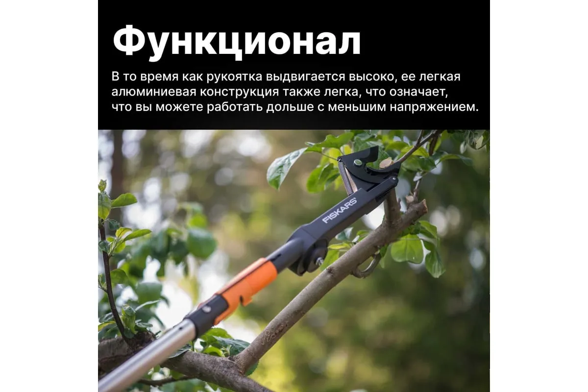 Телескопический черенок QuikFit средний Fiskars 1000666 удобен для использования в труднодоступных местах, на большой высоте т.д.