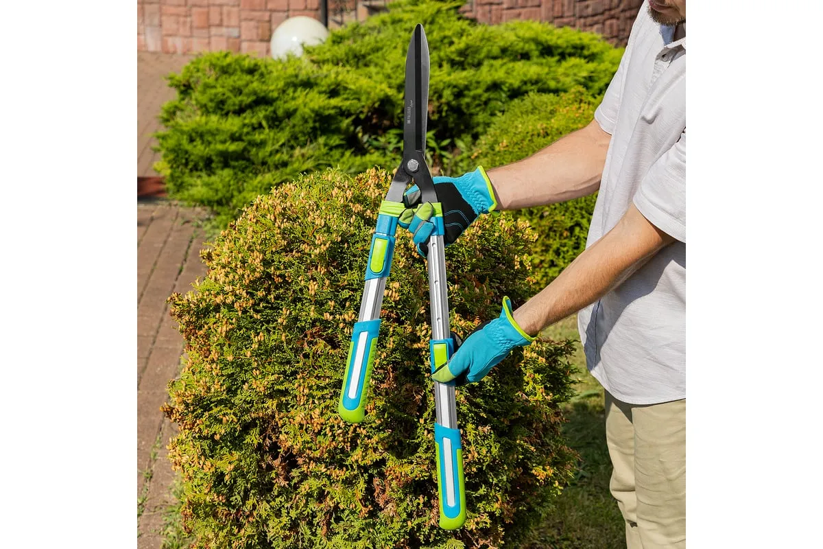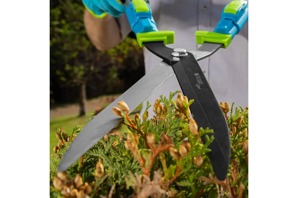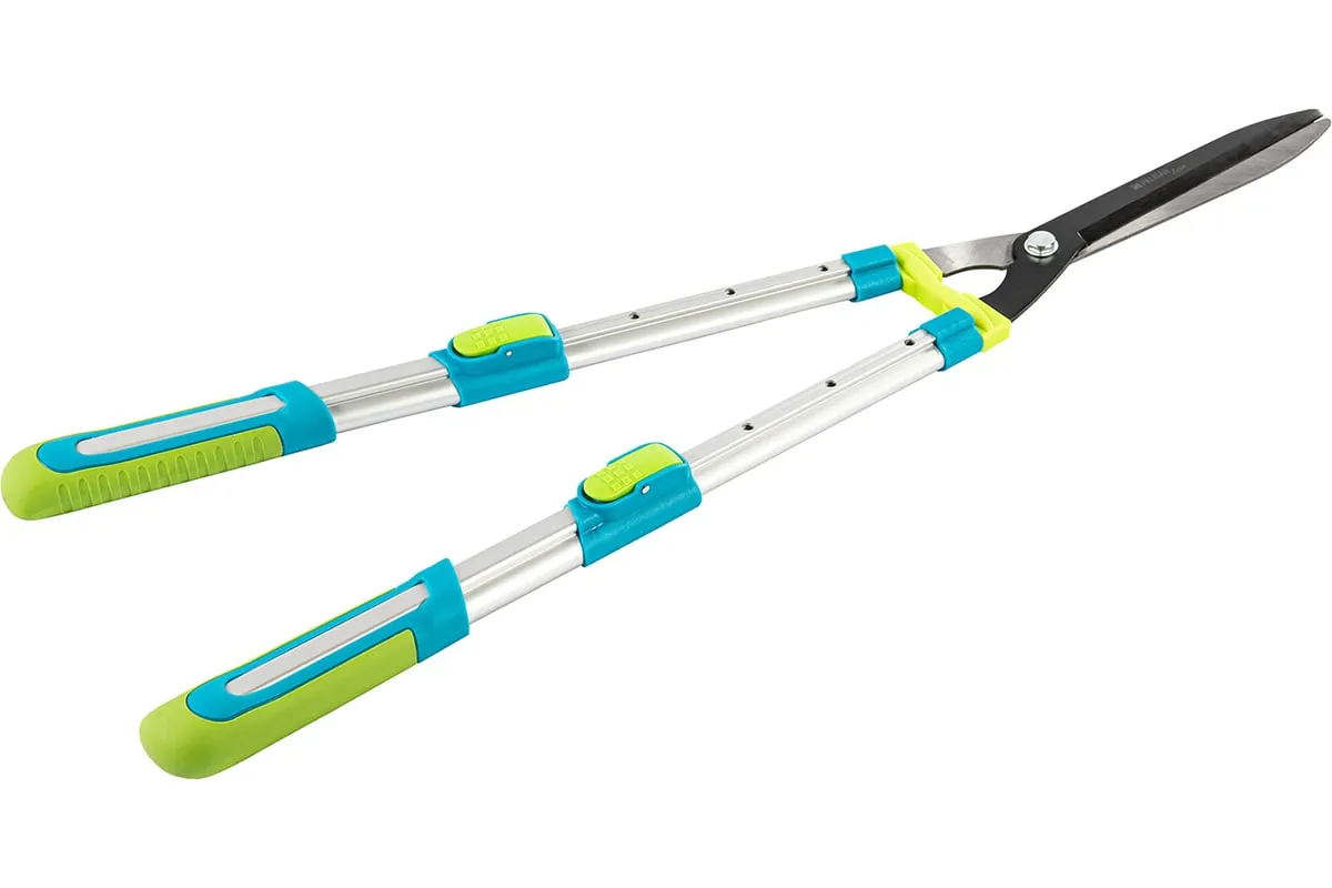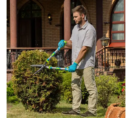 Телескопический кусторез PALISAD LUXE 60592 предназначен для обрезки крон деревьев и кустарников. Работает с молодыми побегами диаметром до 10 мм. Лезвия инструмента выполнены из инструментальной стали. Тефлоновое покрытиеобеспечивает защиту от коррозии. Двухкомпонентные телескопические рукоятки не скользят в руке, чтоспособствует удобному захвату. Они могут удлиняться с 640 мм до 820 мм.