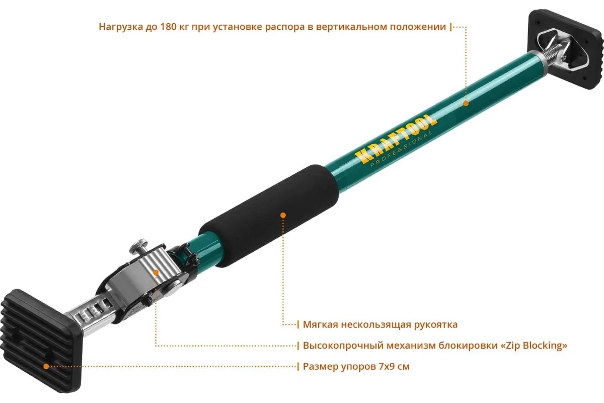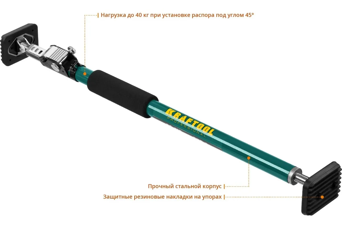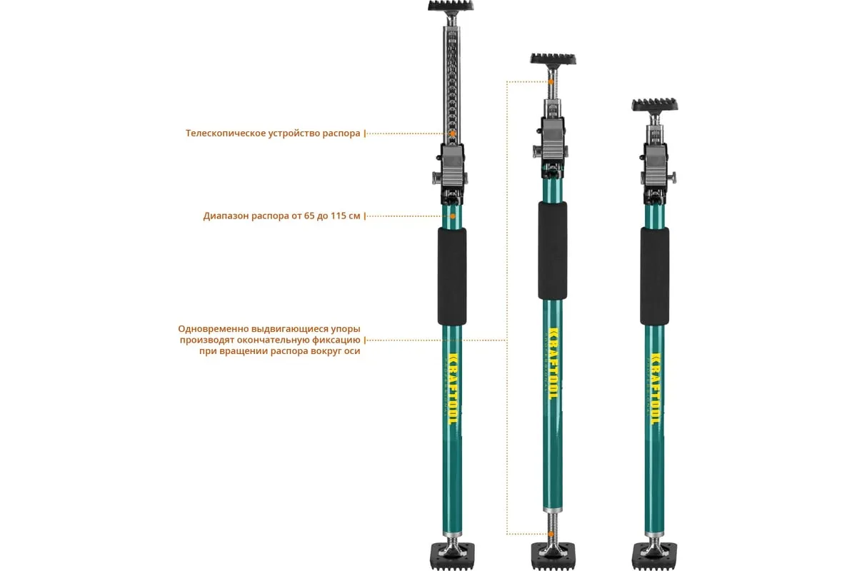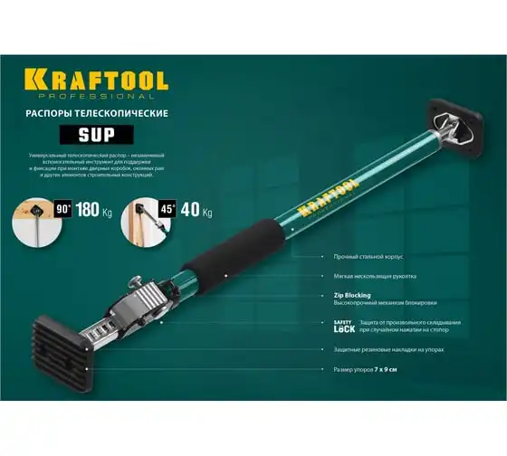 Телескопический распор SUP-1, 65-115 см KRAFTOOL 32236 предназначен для поддержки или фиксации различных грузов. Используется при транспортировке в автомобиле, при установке дверей, а так же при строительных работах. Возможность упора под различными углами. Данная модель оборудована специальным механизмом, который защищает от случайного складывания инструмента.