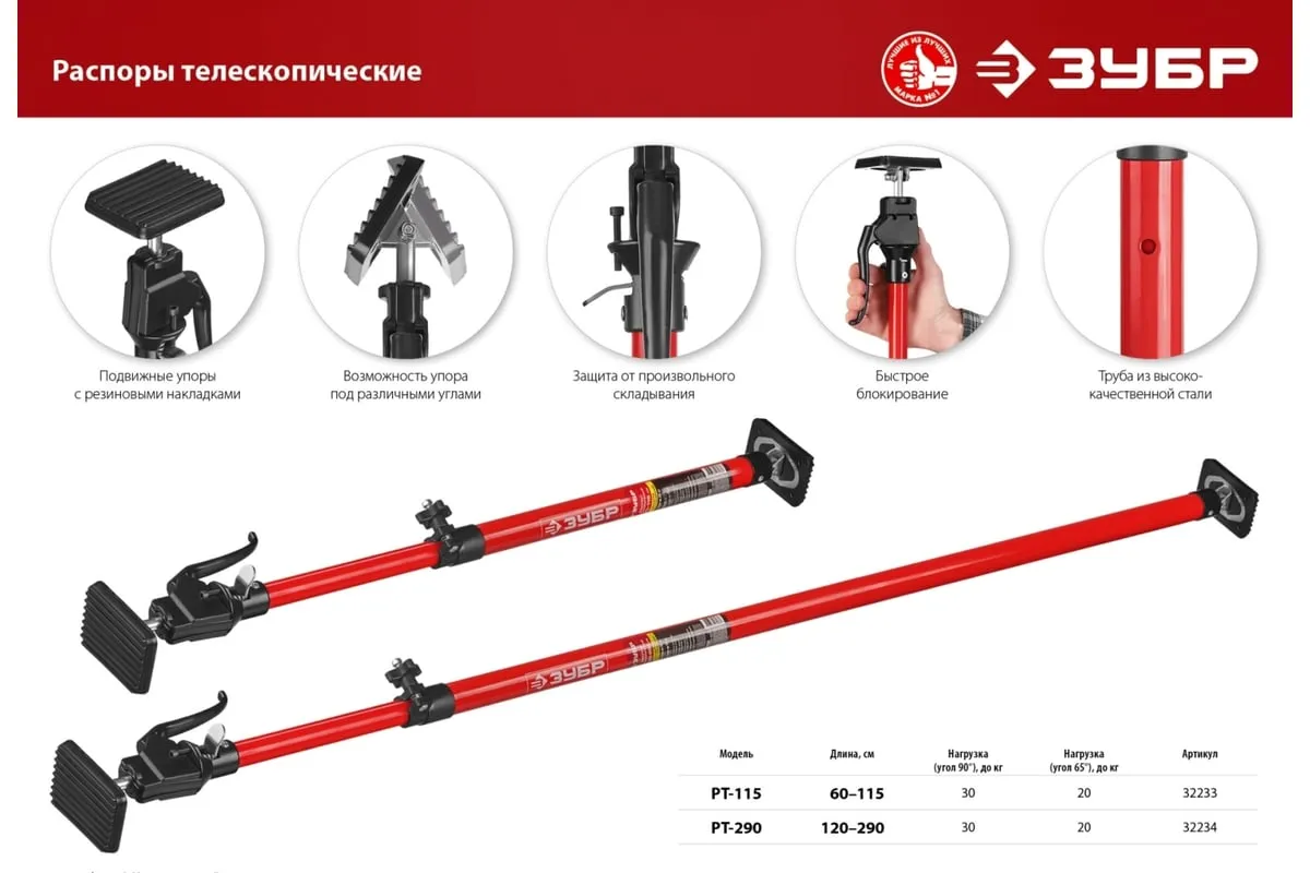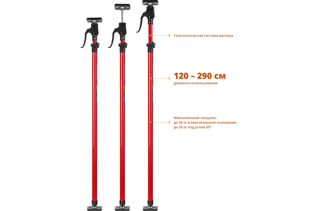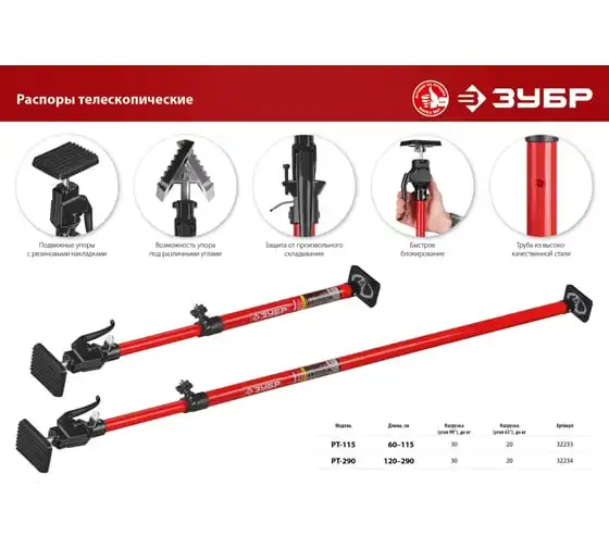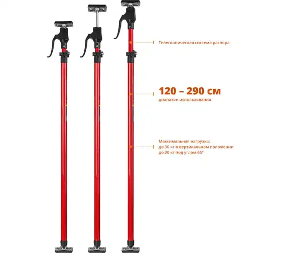Телескопический распор ЗУБР РТ-290 120-290 см 32234 применяется при монтаже различных строительных конструкций таких, как дверные коробки и оконные рамы. Корпус изготовлен из конструкционной стали и обладает особой прочностью. Это обеспечивает высокую стойкость к износу и долгий срок службы инструмента.