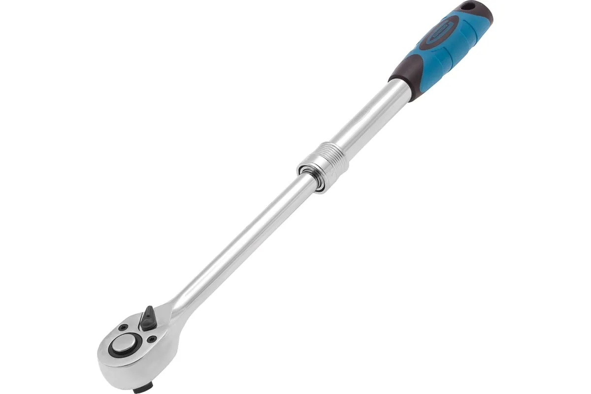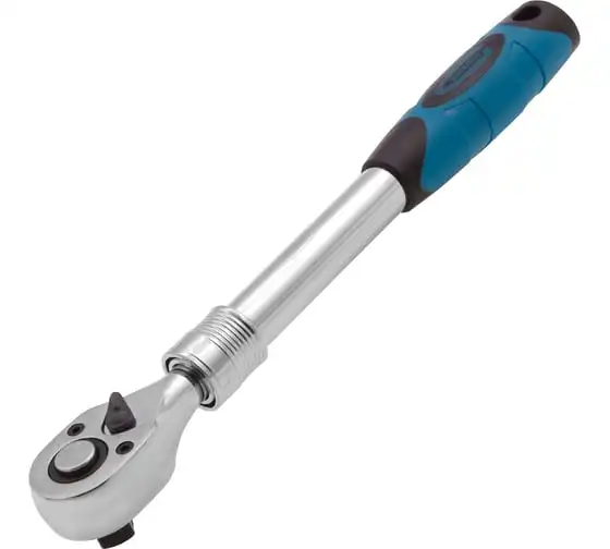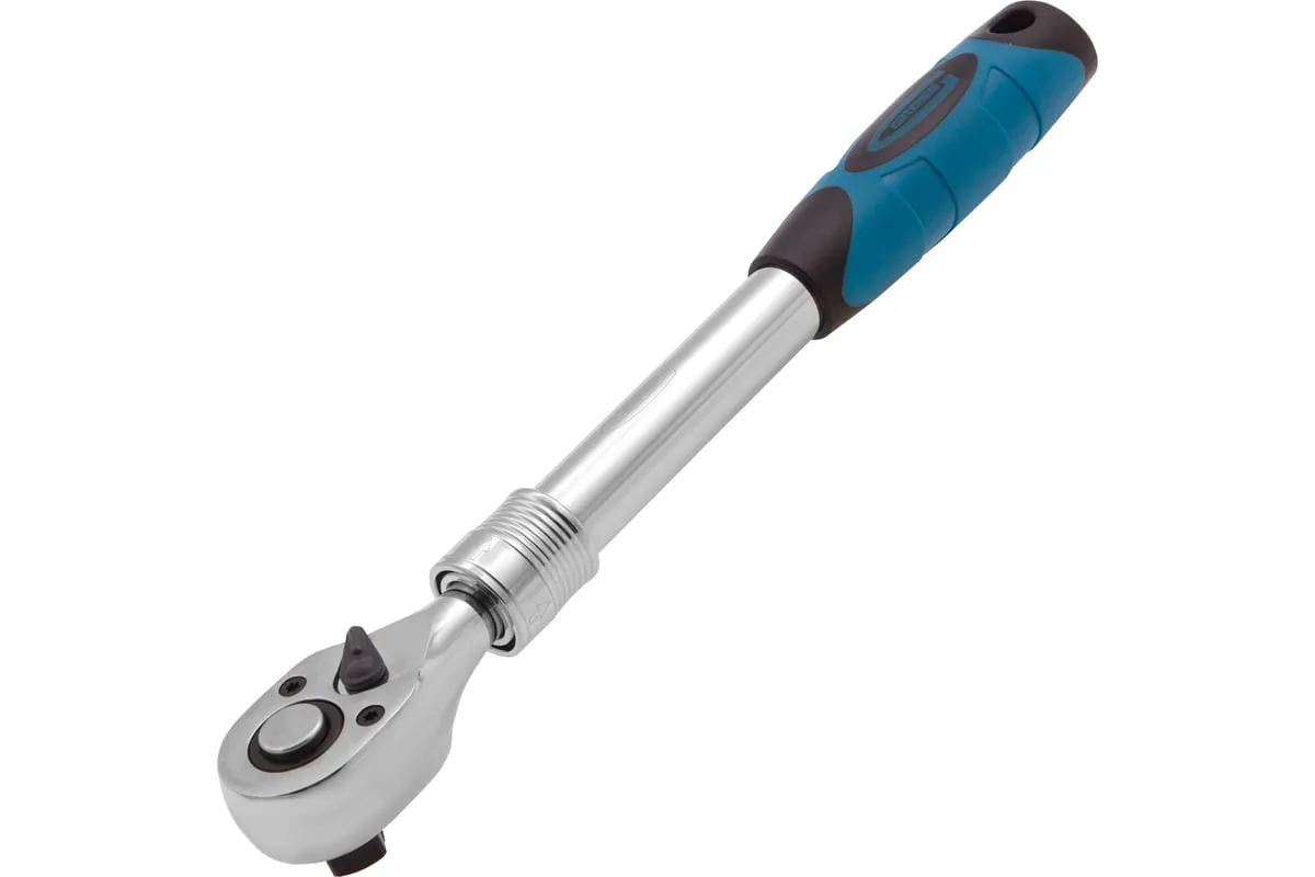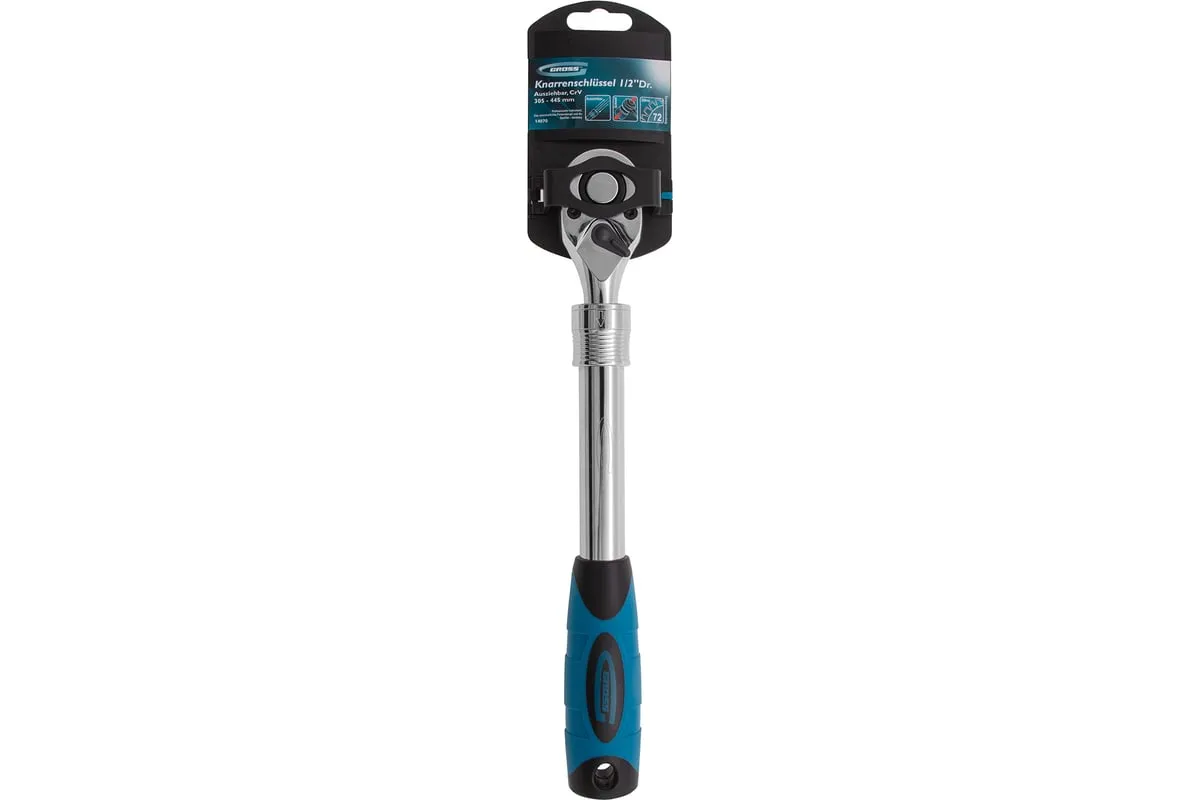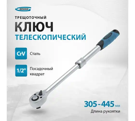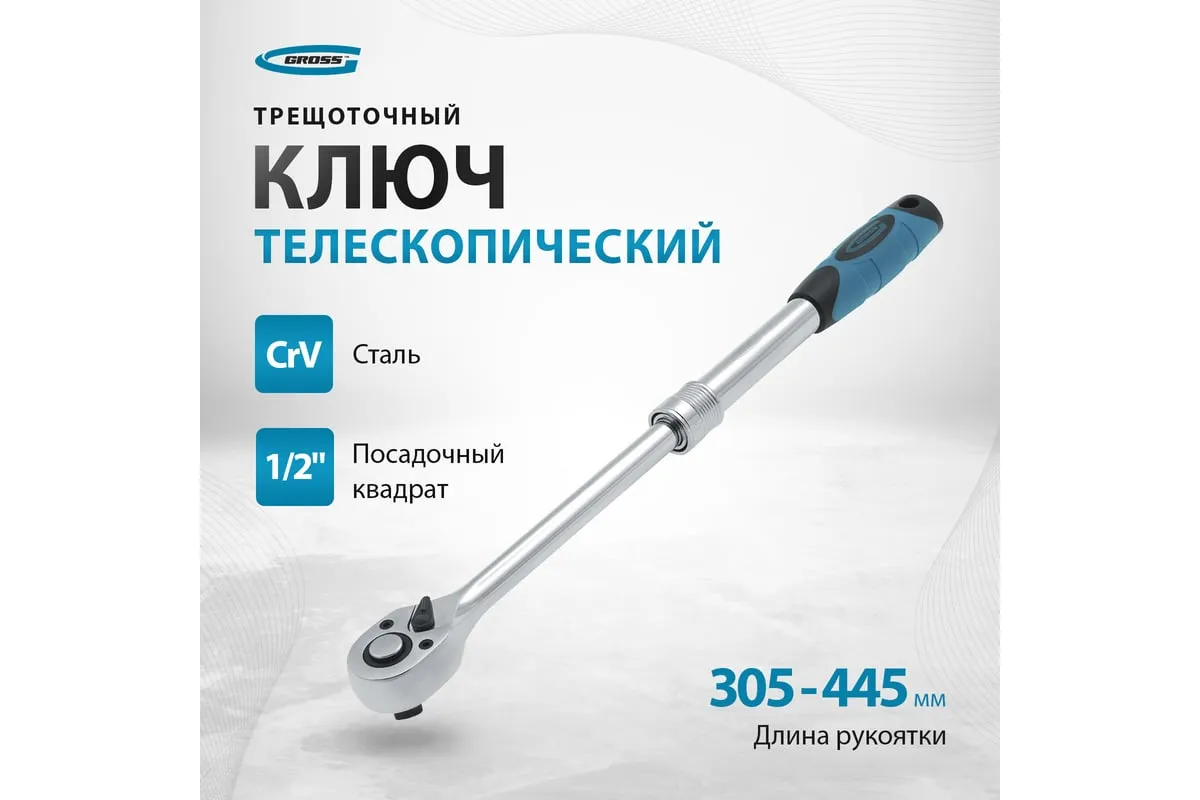 Телескопический трещоточный ключ 1/2" GROSS 14070 выполнен из хромованадиевой стали и хромирован для продления срока службы. Имеет двухкомпонентную рукоятку, которая легко удлиняется благодаря запатентованному механизму. Реверс ключа позволяет производить как закручивание, так и откручивание крепежа.