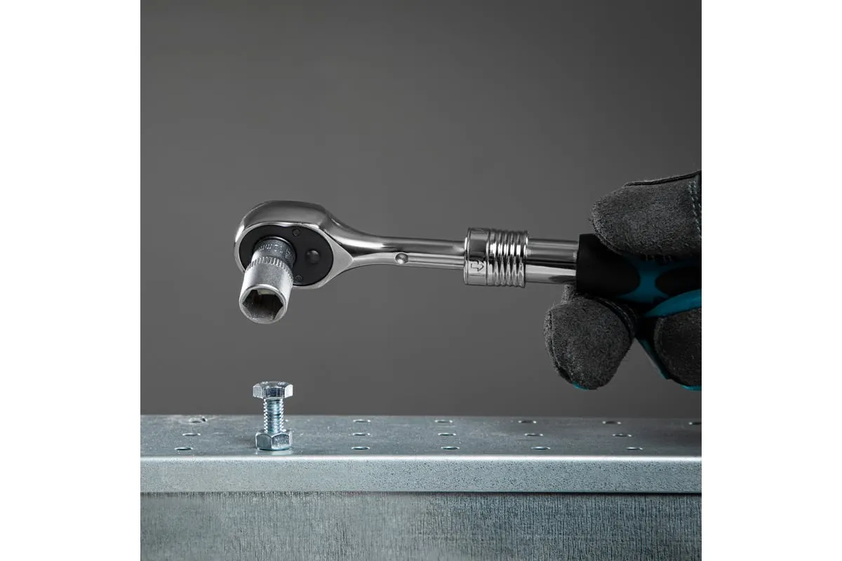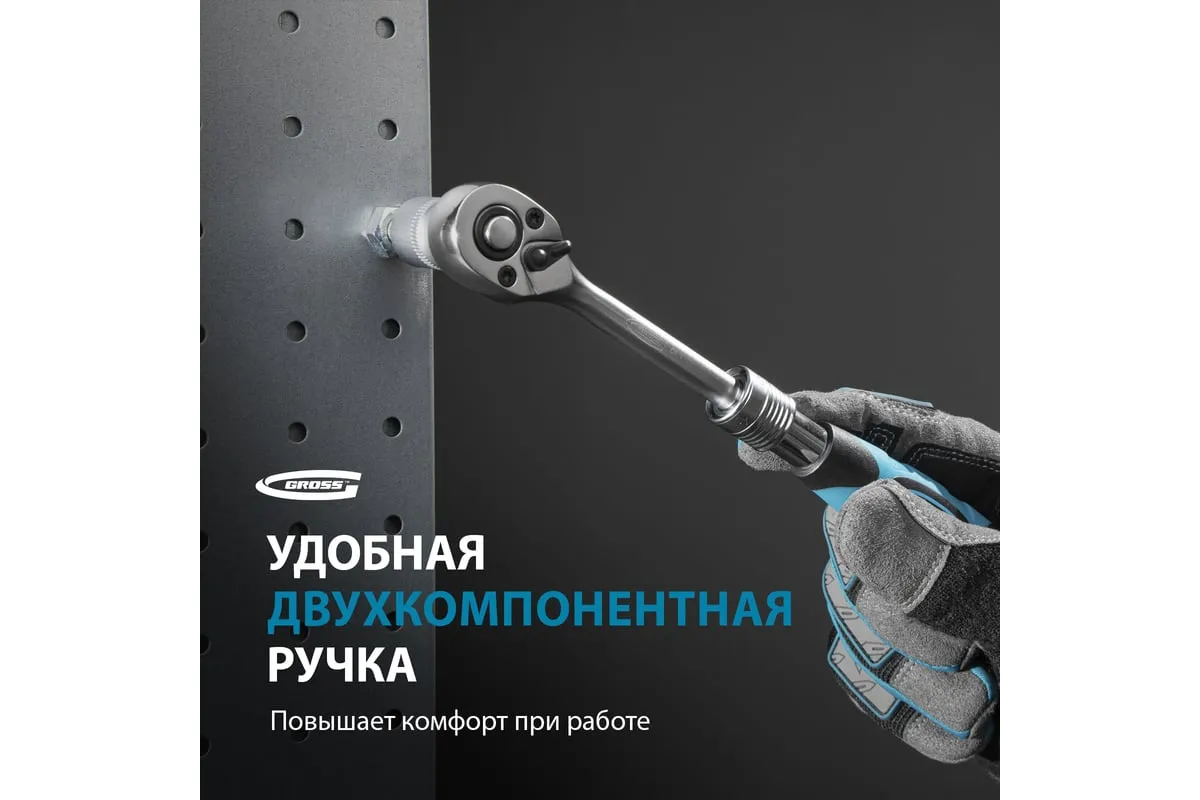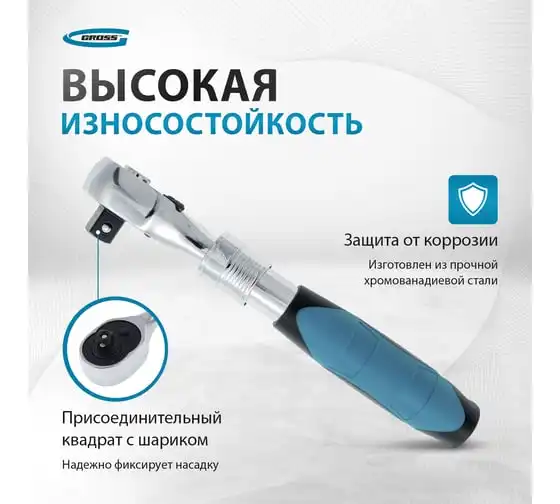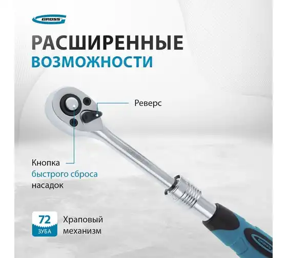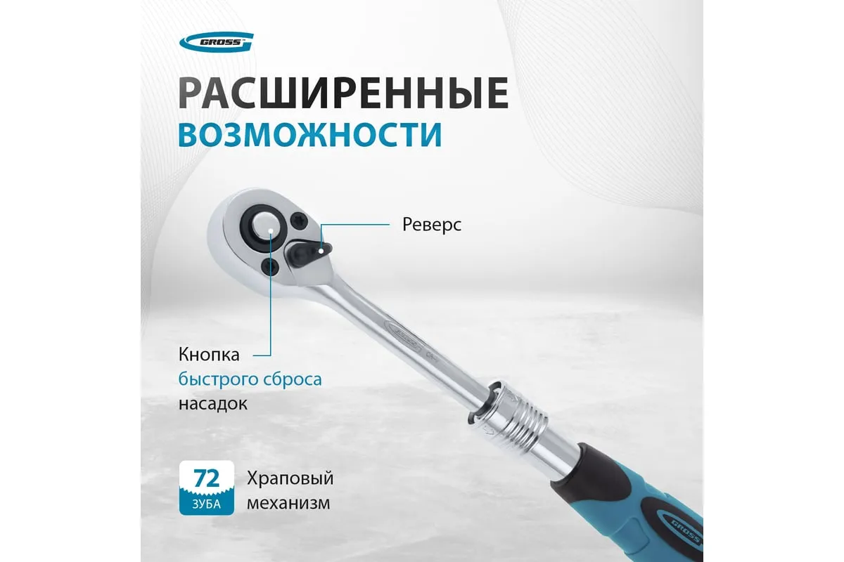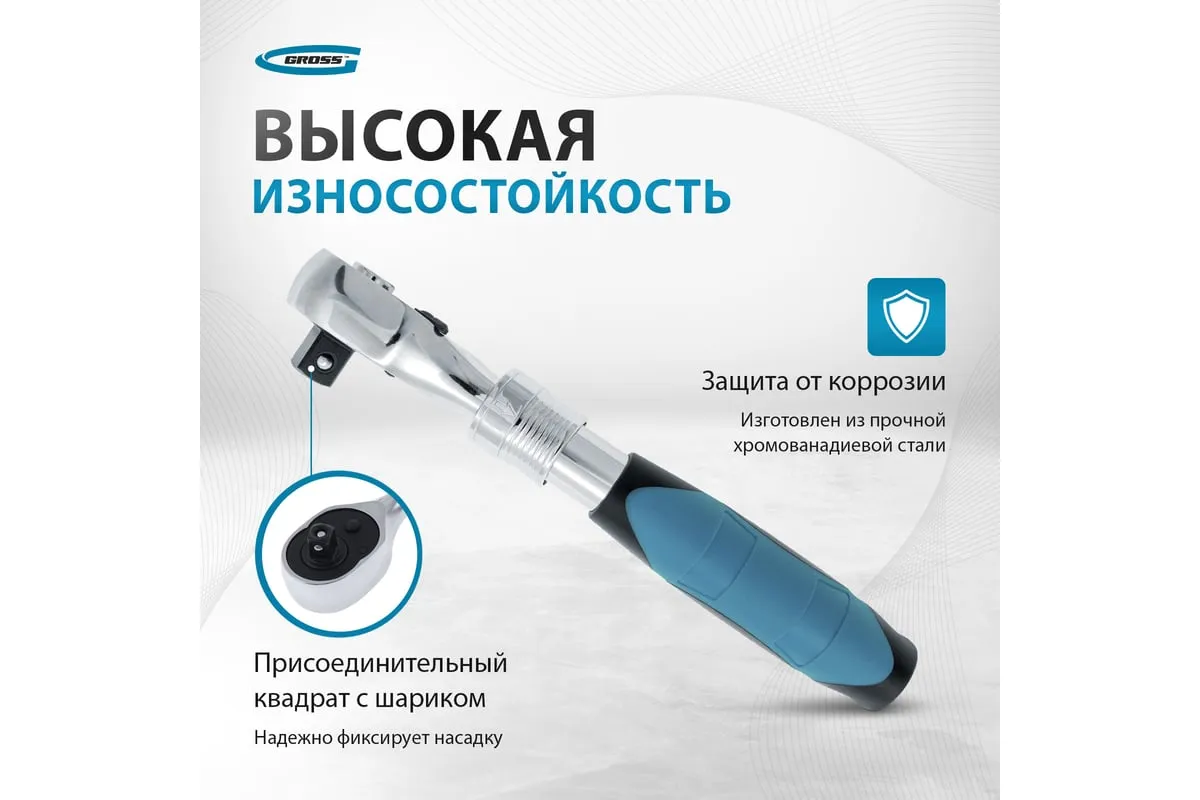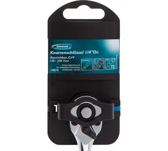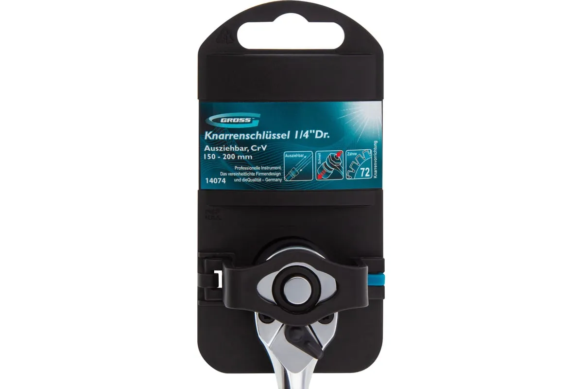 Телескопический трещоточный ключ 1/4" GROSS 14074 используется для работ с правосторонним и левосторонним крепежом. В конструкции имеется механизм ступенчатой фиксации рукоятки, что способствует увеличению размеров инструмента.