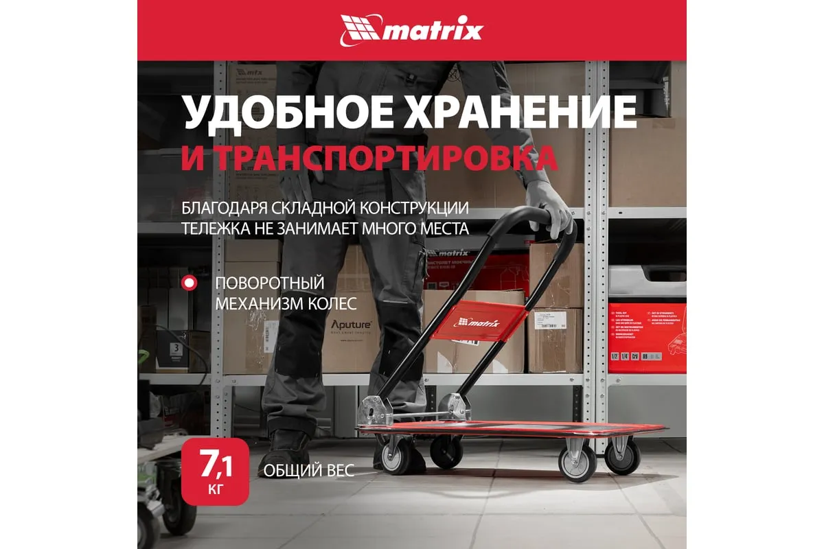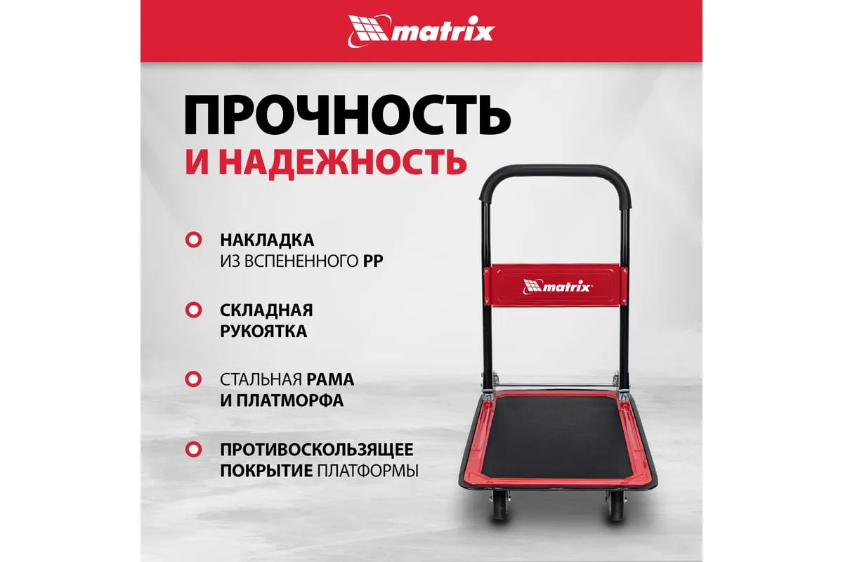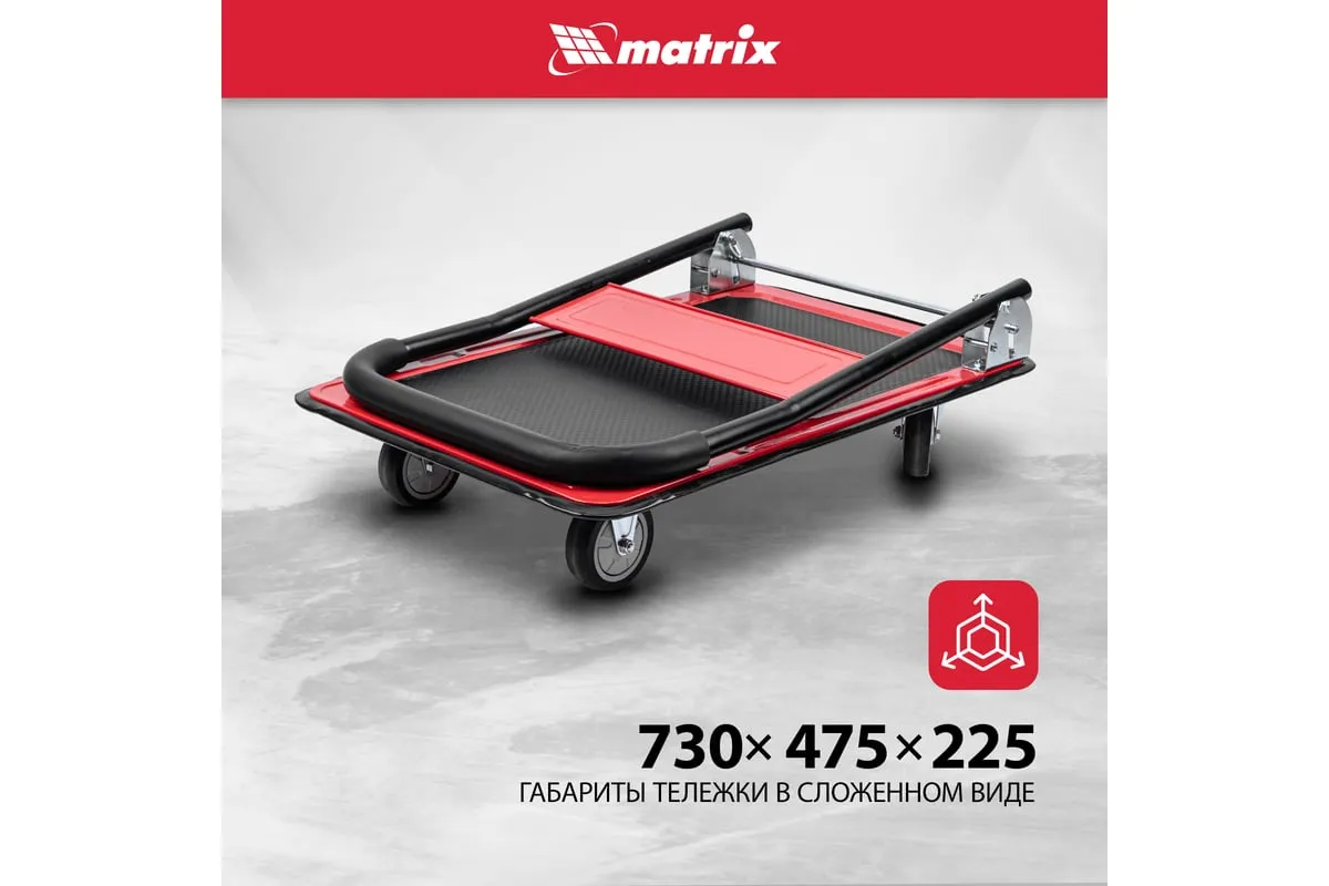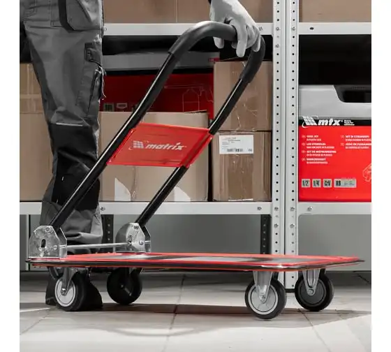 Хозяйственная тележка Matrix 98211 предназначена для перемещения грузов массой до 150 кг. На платформе размером 730 x 475 мм можно разместить даже крупногабаритные предметы.